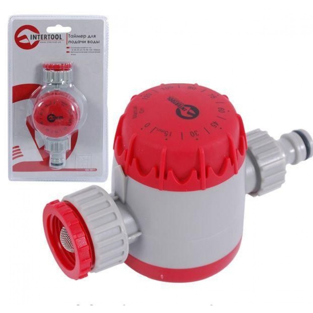 Таймер для подачи воды с внутренней резьбой на входе 3/4" на коннектор 1/2" INTERTOOL GE-2011 оснащен сеточным фильтром, позволяет автоматически регулировать время прекращения подачи воды с возможностью установки продолжительности полива от 15 до 120 мин с шагом в 15 мин. Прост в эксплуатации, позволяет существенно сэкономить воду. Для работы таймера батареи не требуются.