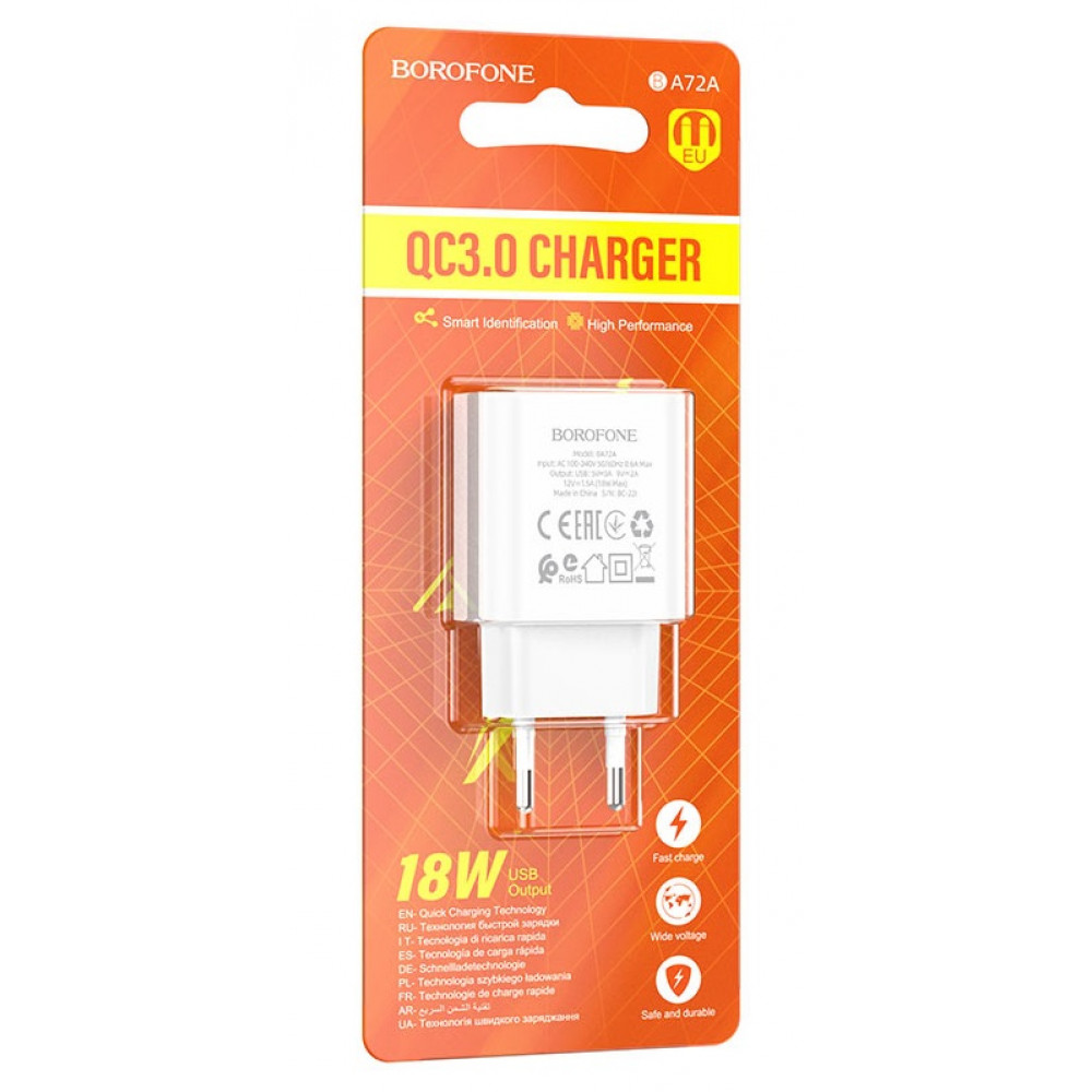 BOROFONE BA72A Spring, сетевое зарядное устройство с выходом USB 18W, вилка EU, поддержка протоколов быстрой зарядки