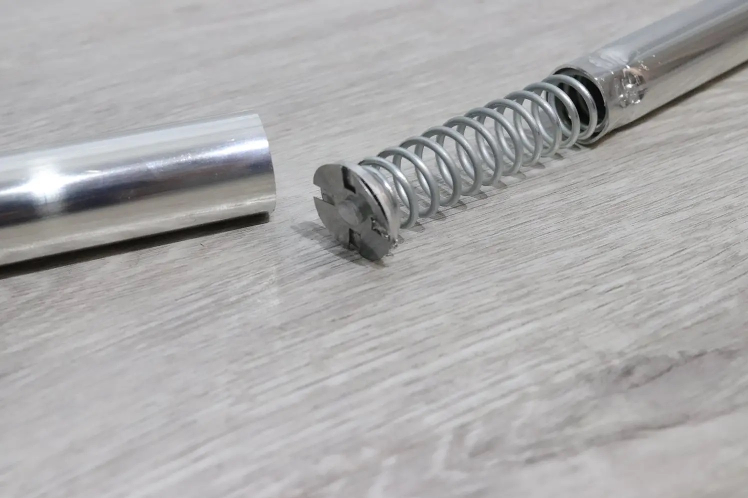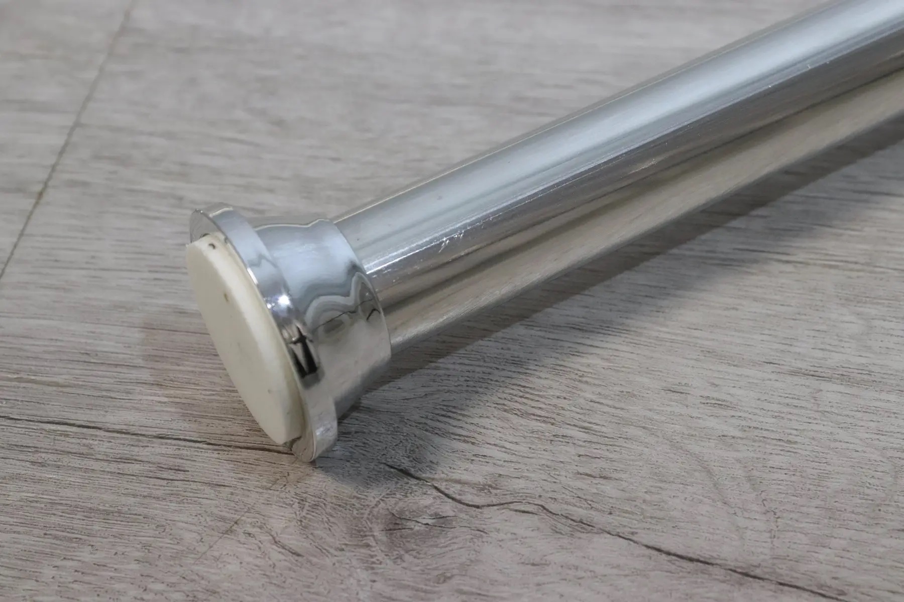 Карниз для ванной алюминиевый, покрыт хромом и не подлежит коррозии, выдвигается от 75 см до 120 см и фиксируется за счет пружины. Имеет особенность механизма фиксации, а именно на конце пружины имеется кольцо, которое дает легко выдвигается и предотвращает обратному складыванию. В наконечниках используются поролоновые прокладки, которые уменьшают скольжение.