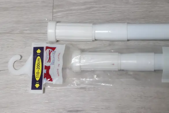 Карниз для ванной выдвижной, выдвигается от 110 см до 200 см. Фиксируется за счет телескопа, а также пружины. Выполнен из метала, наконечники имеют резиновый уплотнитель