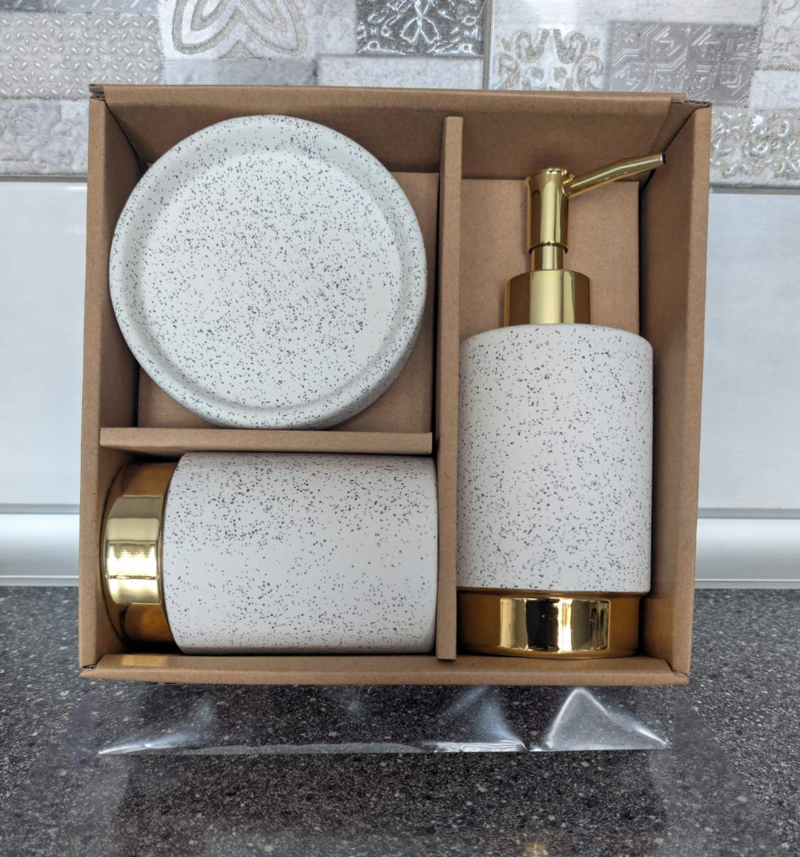 Керамический набор для ванной комнаты 3 предмета (дозатор, стакан, мыльница) белый с золотым окантом