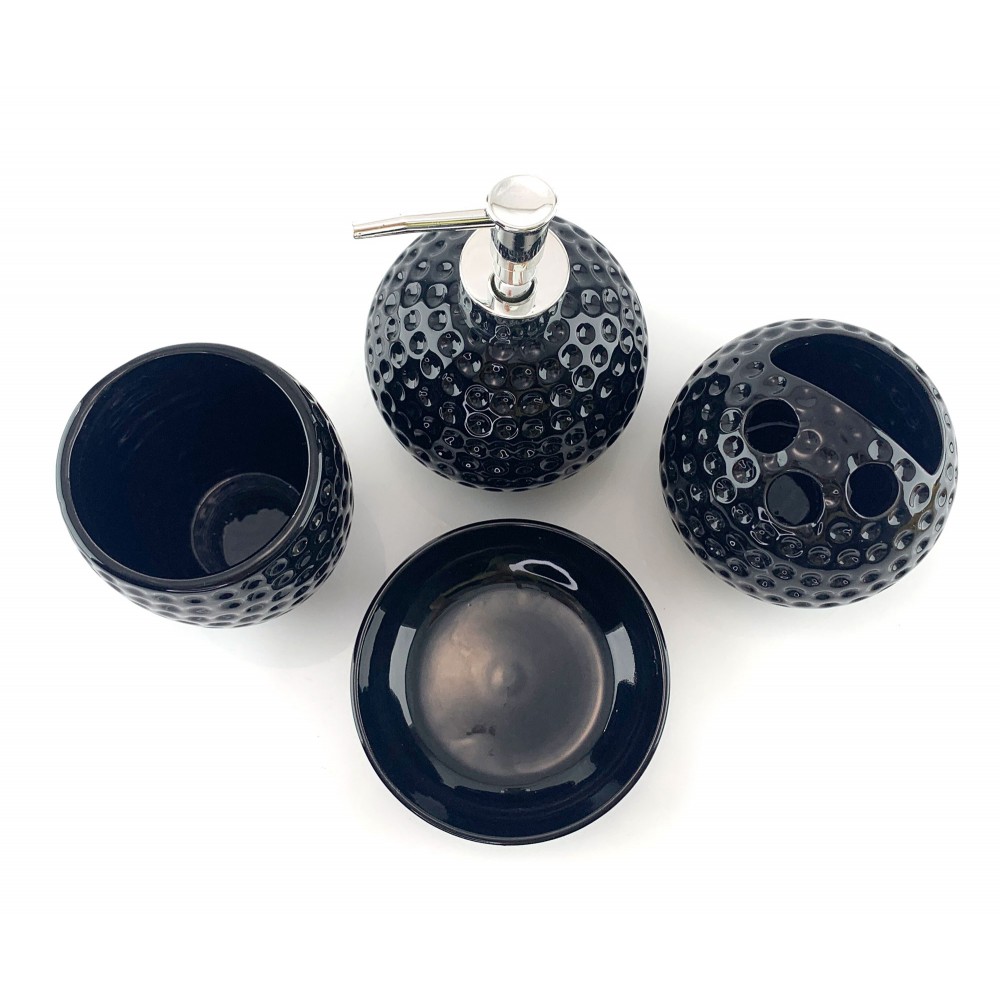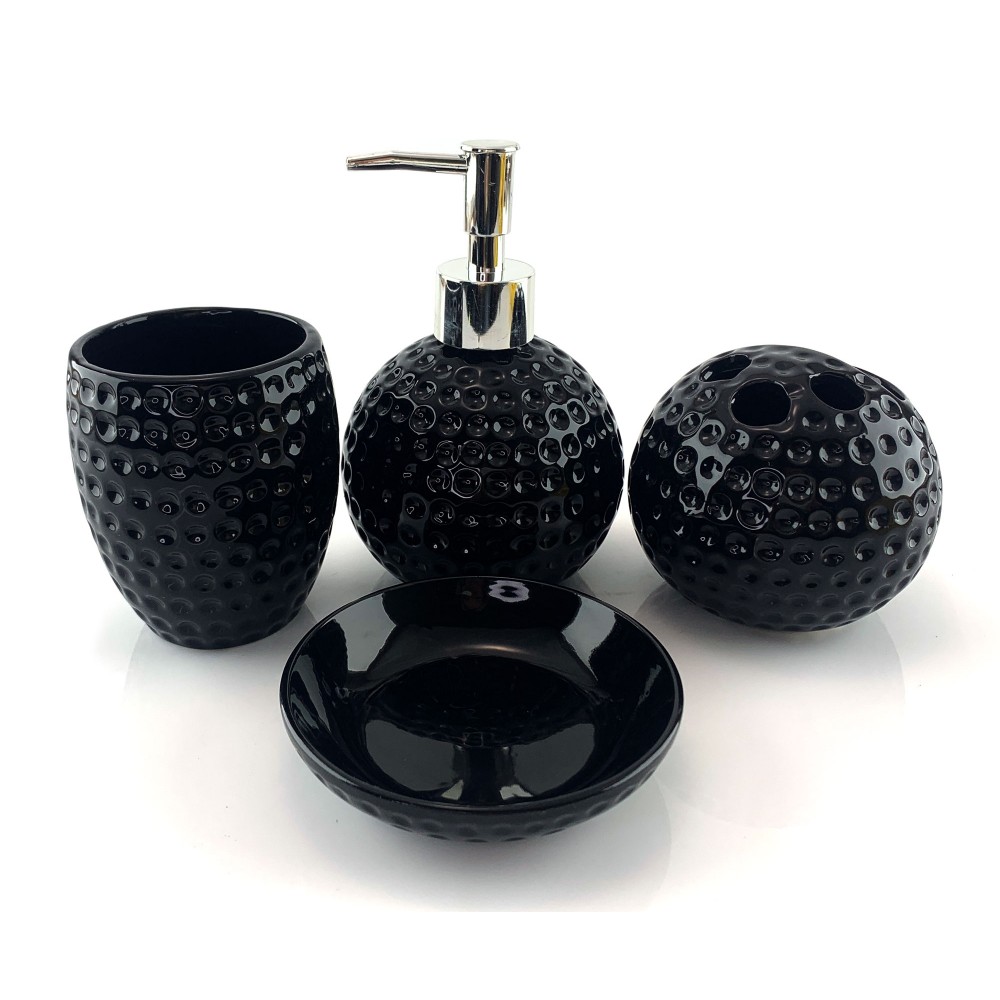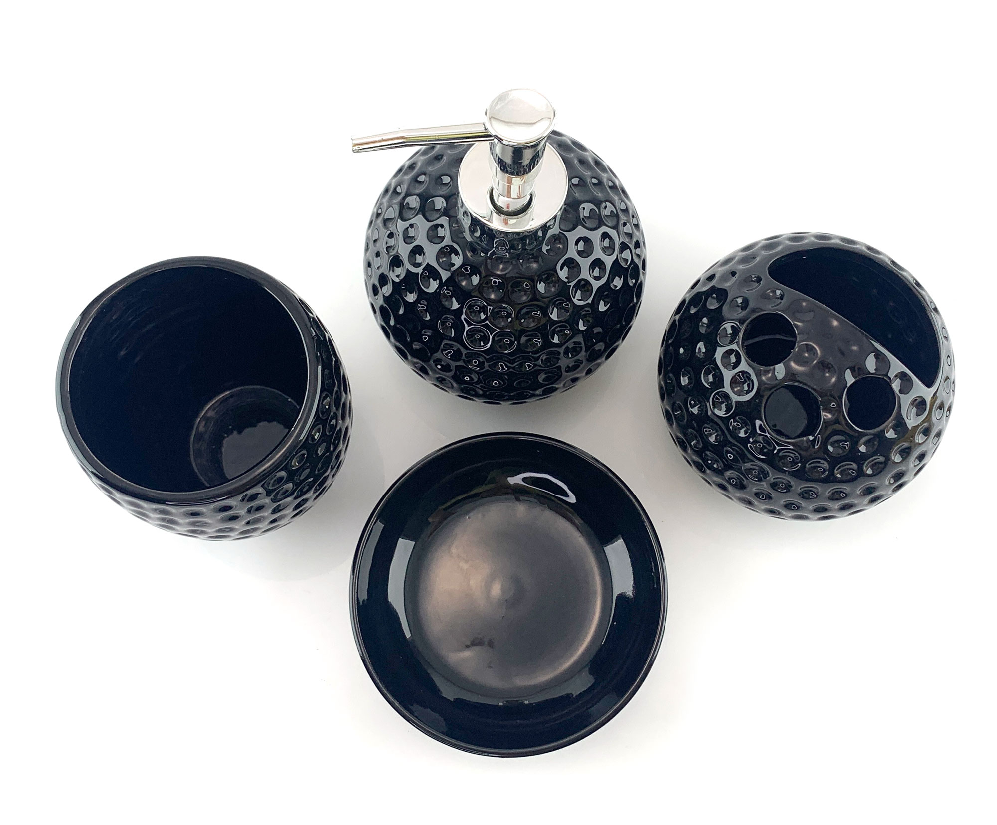 Керамический набор для ванной в черном цвете в виде мяча для игры в гольф - это идеальное решение для придания вашей ванной комнате стиля и функциональности. Этот набор состоит из четырех предметов: Диспенсер для жидкости: высотой 160 мм и диаметром 92 мм. С вместительностью 380 мл, он подходит для различных жидких продуктов, будь то жидкое мыло, гель для умывания или шампунь. Его элегантный дизайн сделает вашу ванную комнату еще привлекательнее. Органайзер для зубной гигиены: Высотой 85 мм и диаметром 95 мм, он идеально подходит для хранения зубных щеток, пасты и других мелочей. Он помогает поддерживать порядок и организовать пространство. Стакан: Этот стильный стакан высотой 95 мм и шириной 80 мм отлично подходит для хранения зубных щеток или просто для полоскания ротовой полости. Его дизайн соответствует остальным предметам набора, создавая единый стиль. Мыльница: диамнтром170 мм и высотой 20 мм, она идеально подходит для размещения мыла. Ее дизайн и цвет сочетаются с остальными предметами набора. Этот керамический набор не только придаст вашей ванной комнате изысканный вид, но и сделает ее более организованной и функциональной. Он также может стать прекрасным подарком для ваших близких или друзей, добавляя нотку красоты и практичности в их повседневную жизнь.