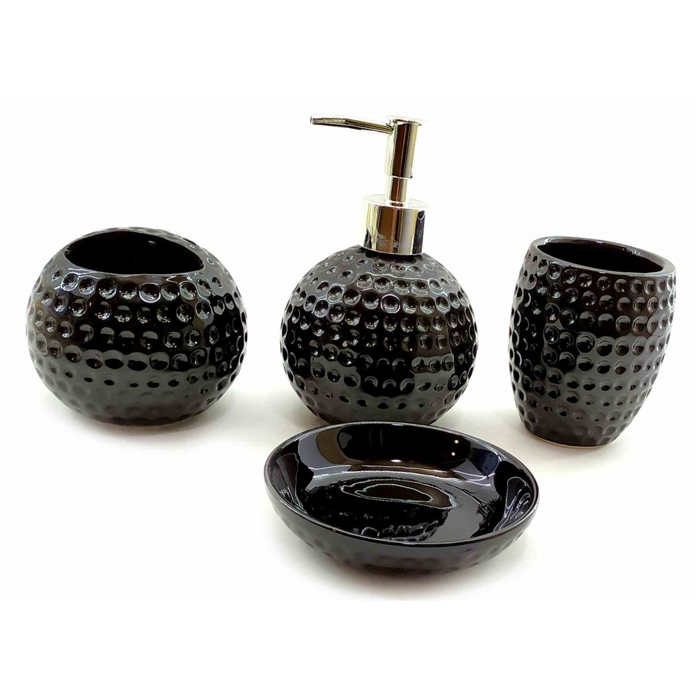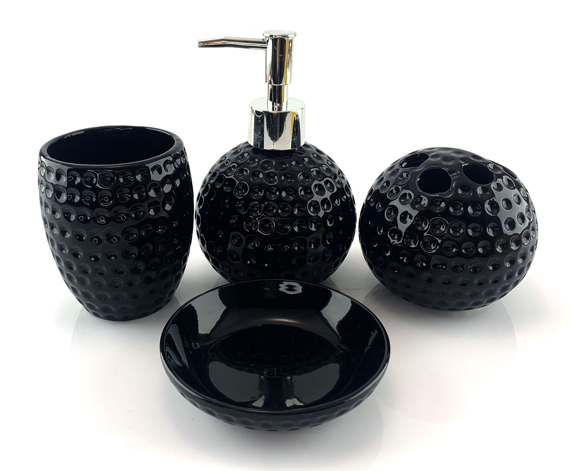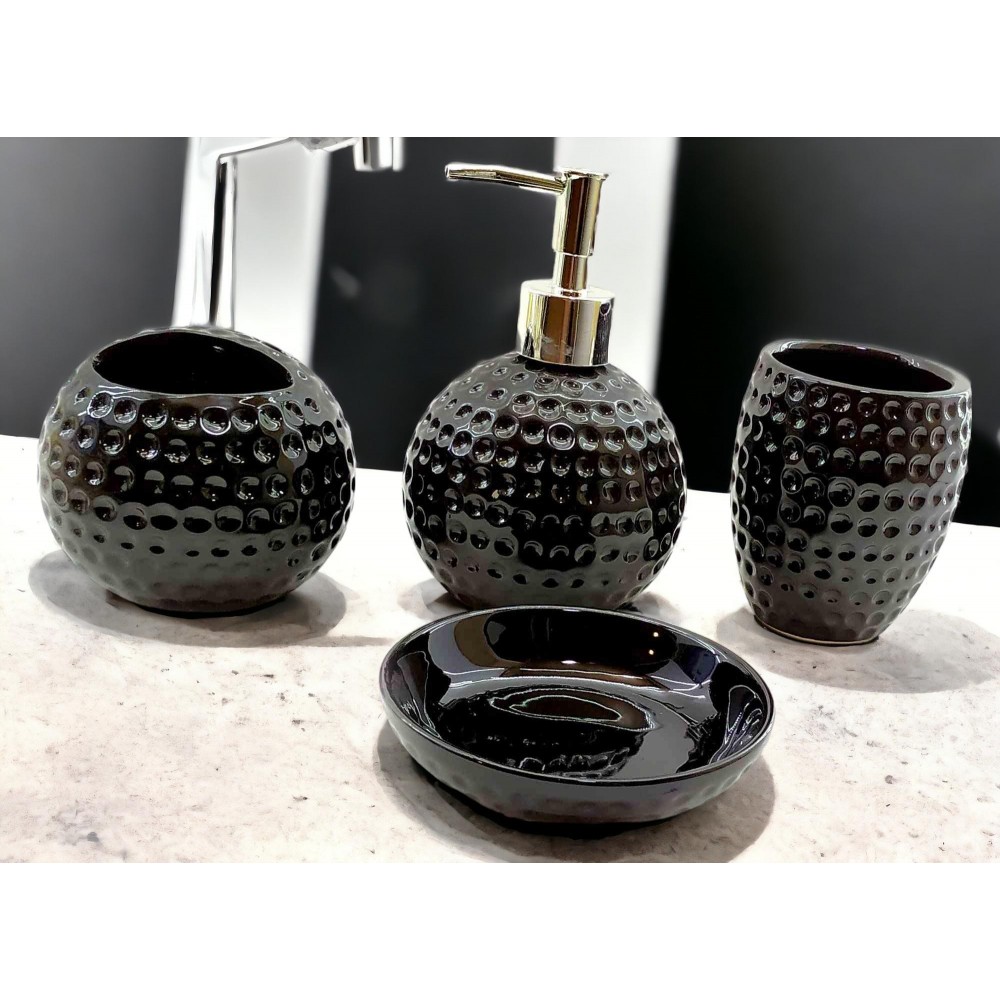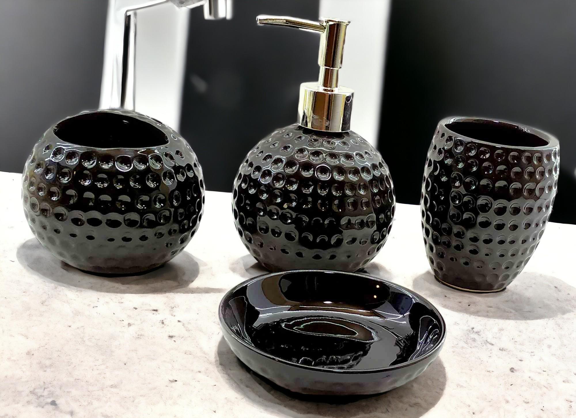 Керамический набор для ванной в черном цвете в виде мяча для игры в гольф - это идеальное решение для придания вашей ванной комнате стиля и функциональности. Этот набор состоит из четырех предметов: Диспенсер для жидкости: высотой 160 мм и диаметром 92 мм. С вместительностью 380 мл, он подходит для различных жидких продуктов, будь то жидкое мыло, гель для умывания или шампунь. Его элегантный дизайн сделает вашу ванную комнату еще привлекательнее. Органайзер для зубной гигиены: Высотой 85 мм и диаметром 95 мм, он идеально подходит для хранения зубных щеток, пасты и других мелочей. Он помогает поддерживать порядок и организовать пространство. Стакан: Этот стильный стакан высотой 95 мм и шириной 80 мм отлично подходит для хранения зубных щеток или просто для полоскания ротовой полости. Его дизайн соответствует остальным предметам набора, создавая единый стиль. Мыльница: диамнтром170 мм и высотой 20 мм, она идеально подходит для размещения мыла. Ее дизайн и цвет сочетаются с остальными предметами набора. Этот керамический набор не только придаст вашей ванной комнате изысканный вид, но и сделает ее более организованной и функциональной. Он также может стать прекрасным подарком для ваших близких или друзей, добавляя нотку красоты и практичности в их повседневную жизнь.