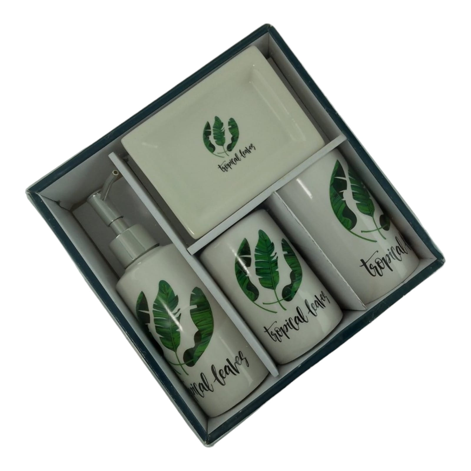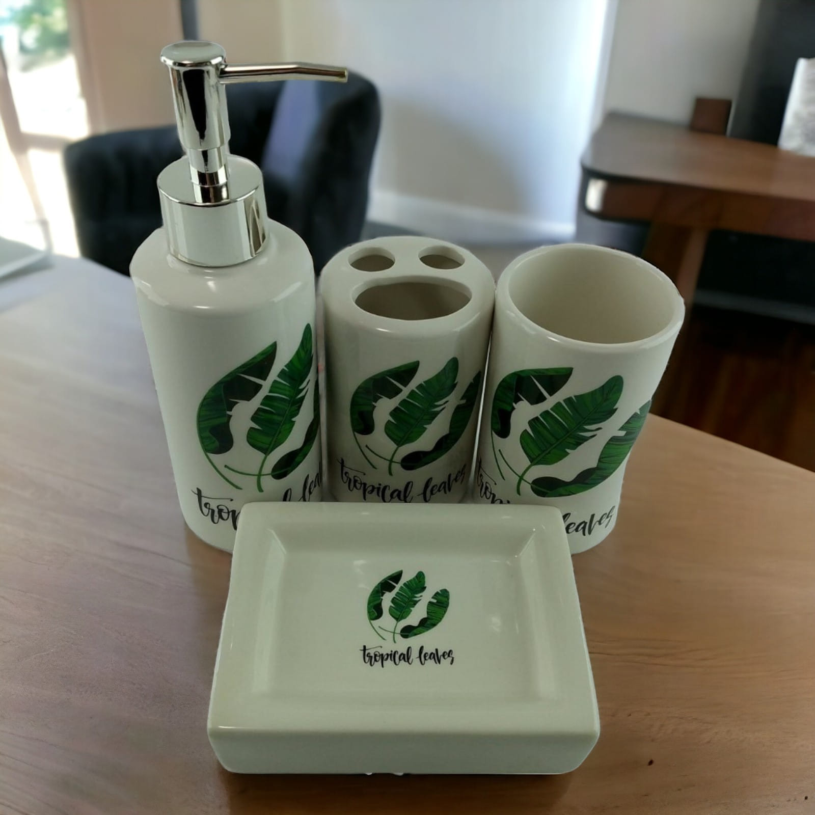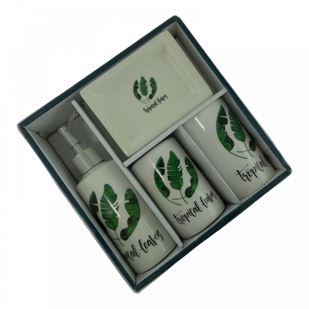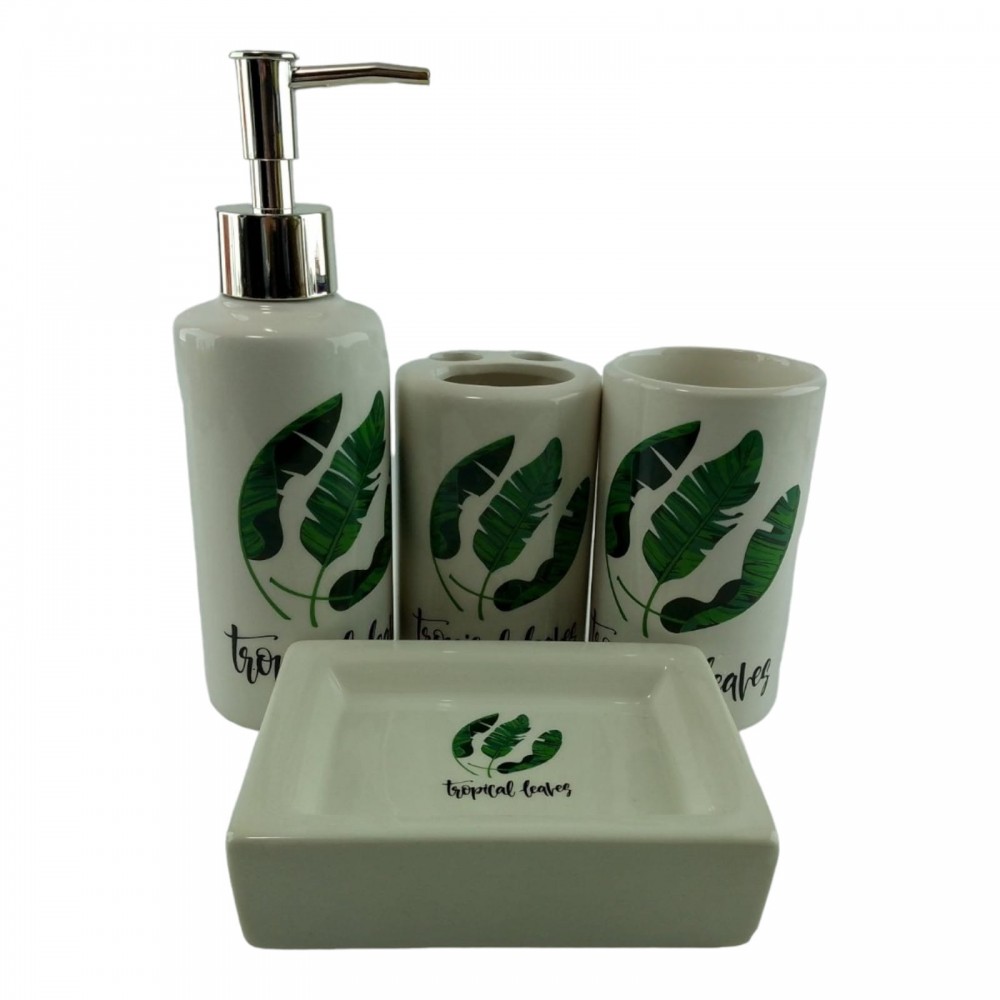 С очаровательным набором аксессуаров для ванной все предметы будут на своих местах. В керамический набор входит-дозатор для жидкого мыла, стакан ,органайзер для зубных щеток, мыльница.
