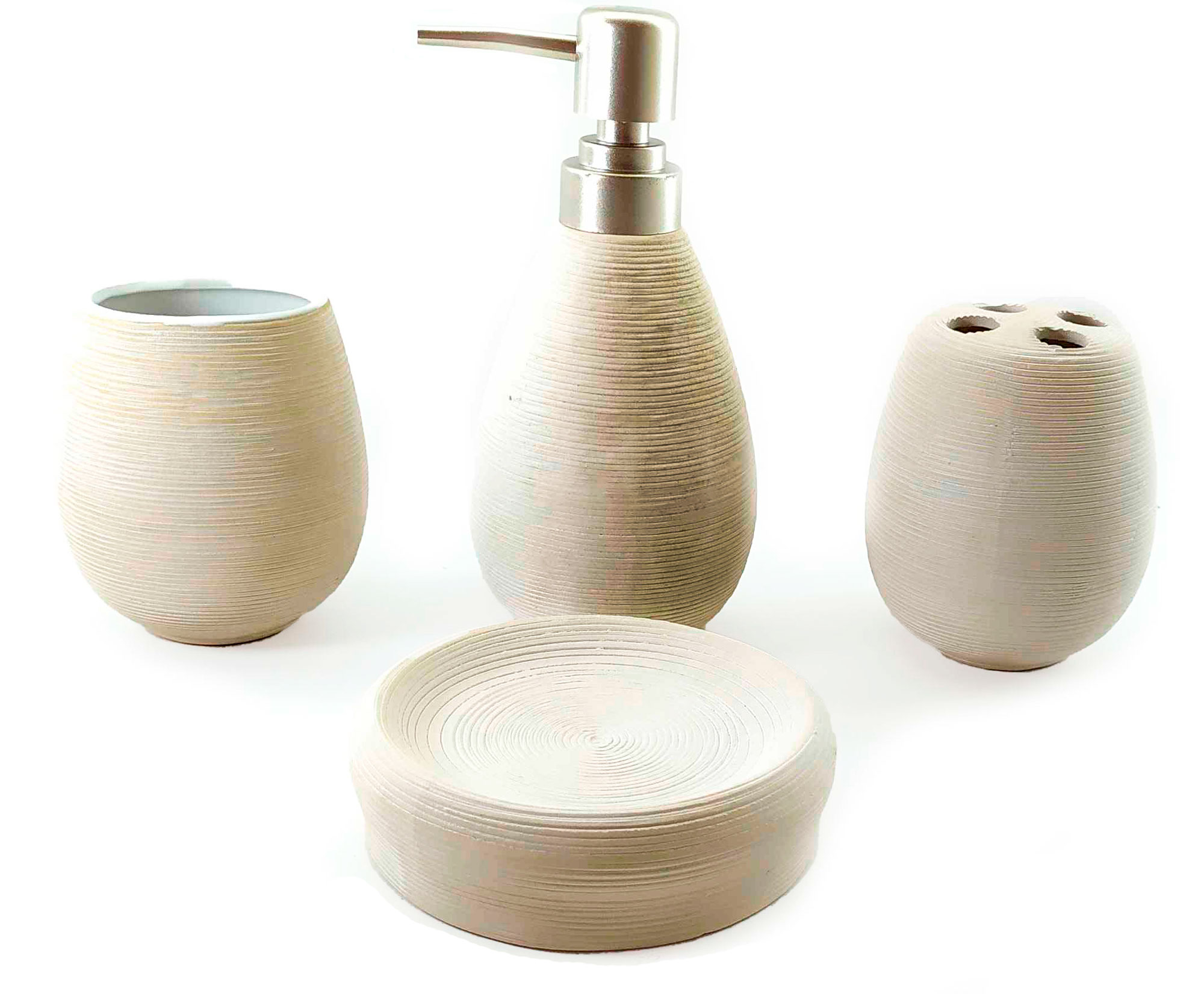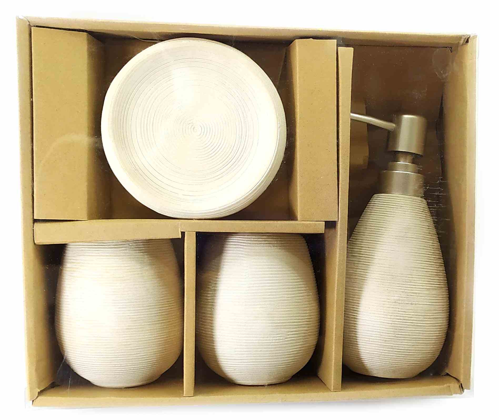 С очаровательным набором аксессуаров для ванной все предметы будут на своих местах. В керамический набор входит-дозатор для жидкого мыла, стакан ,органайзер для зубных щеток, мыльница.