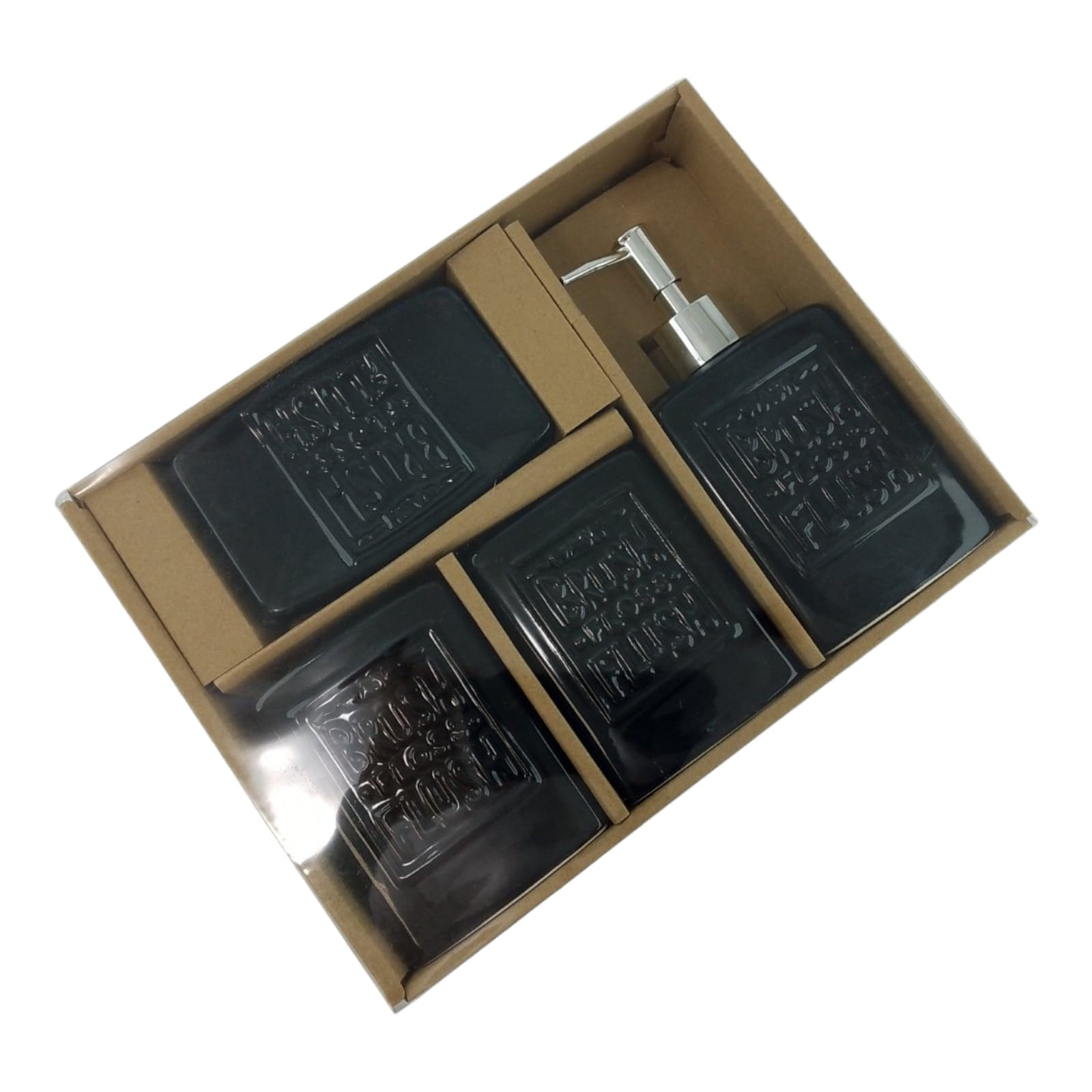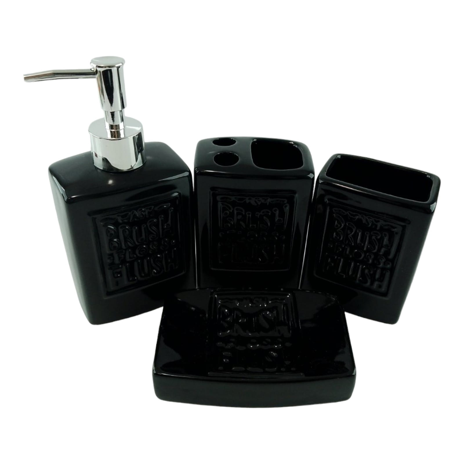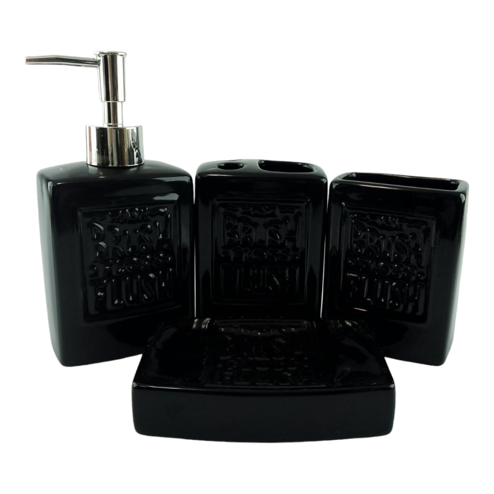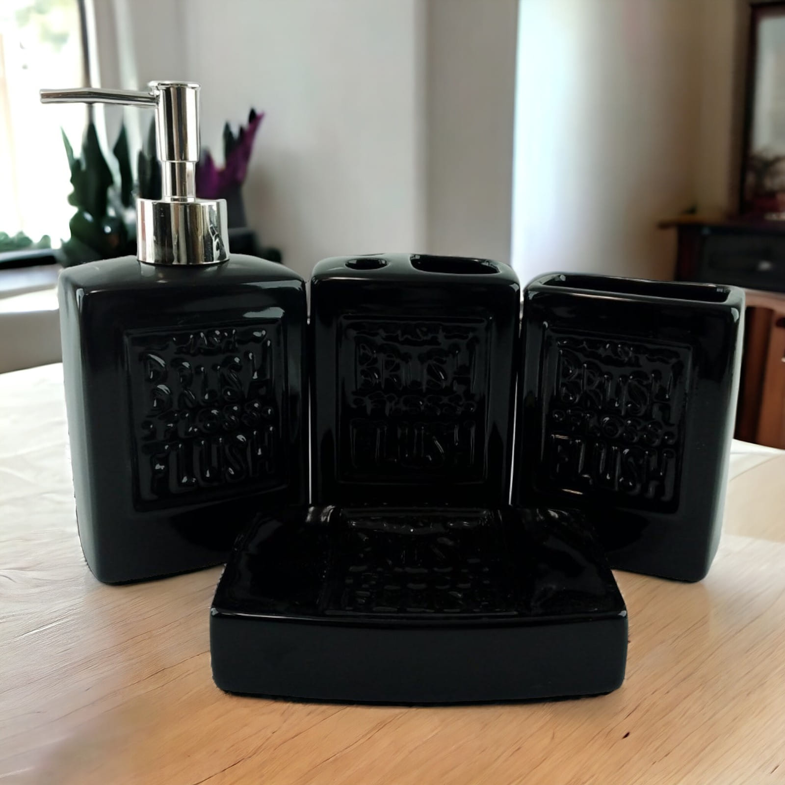 С очаровательным набором аксессуаров для ванной все предметы будут на своих местах. В керамический набор входит-дозатор для жидкого мыла, стакан ,органайзер для зубных щеток, мыльница.