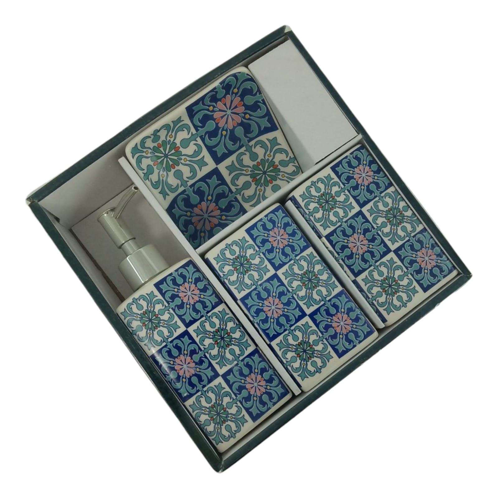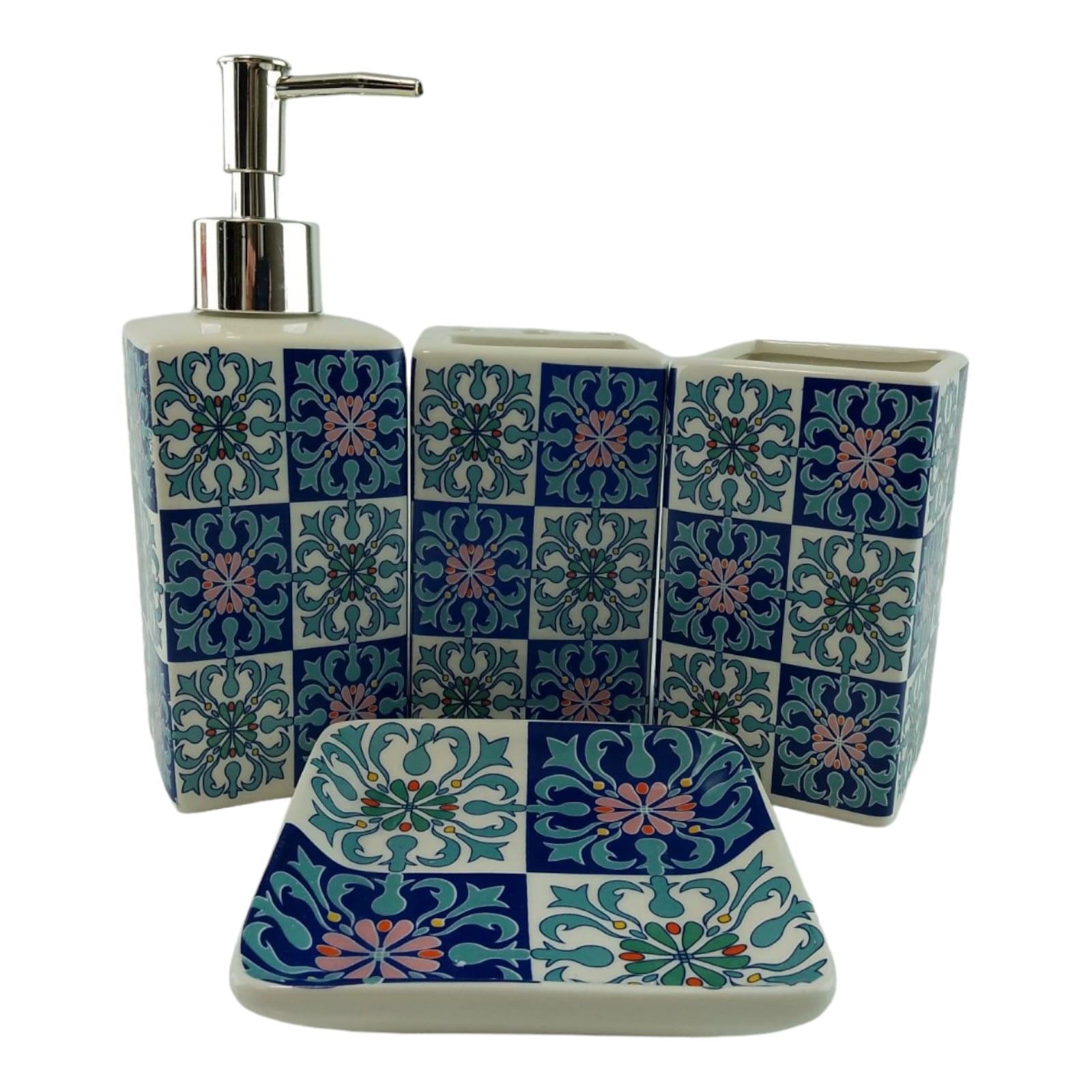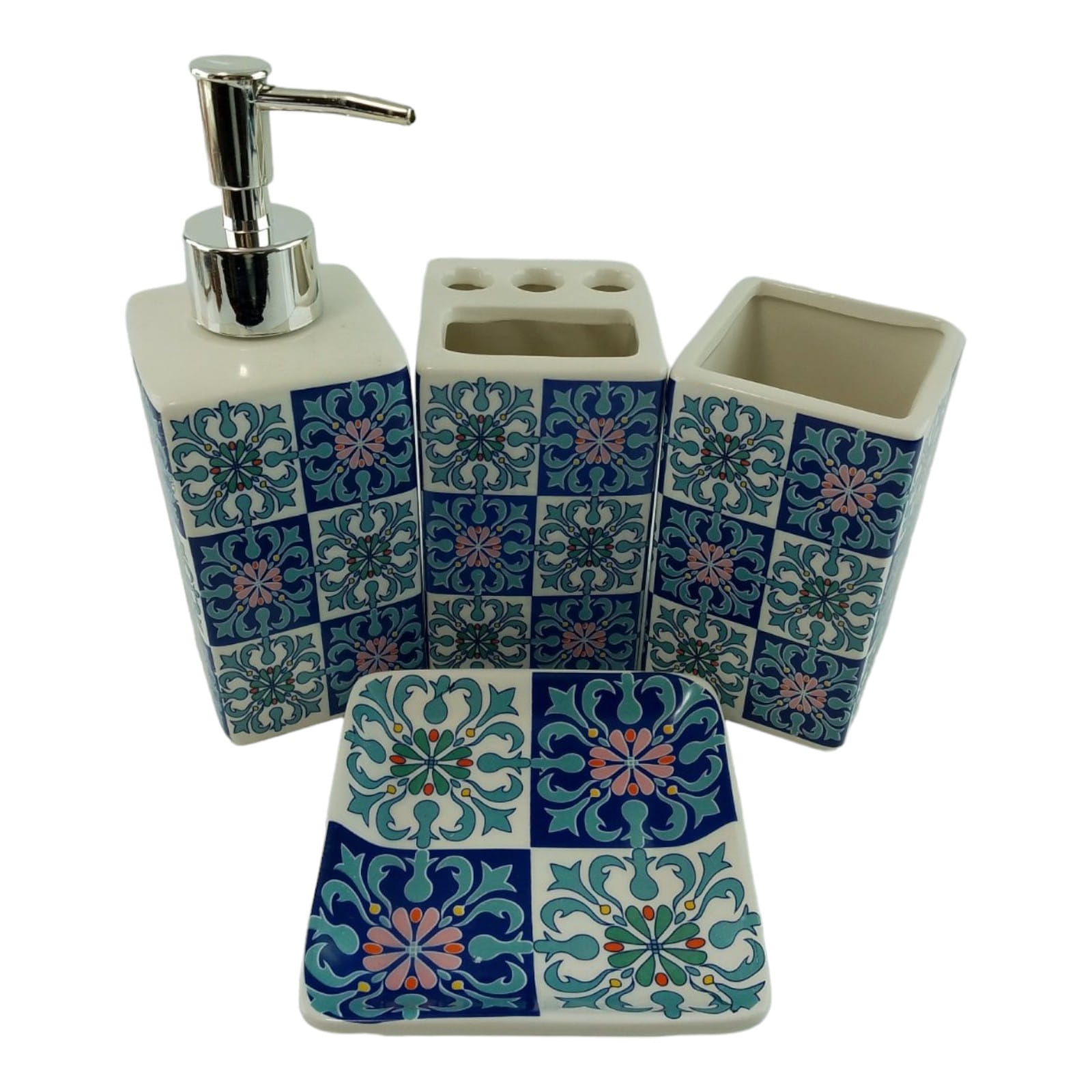 С очаровательным набором аксессуаров для ванной все предметы будут на своих местах. В керамический набор входит-дозатор для жидкого мыла, стакан ,органайзер для зубных щеток, мыльница.