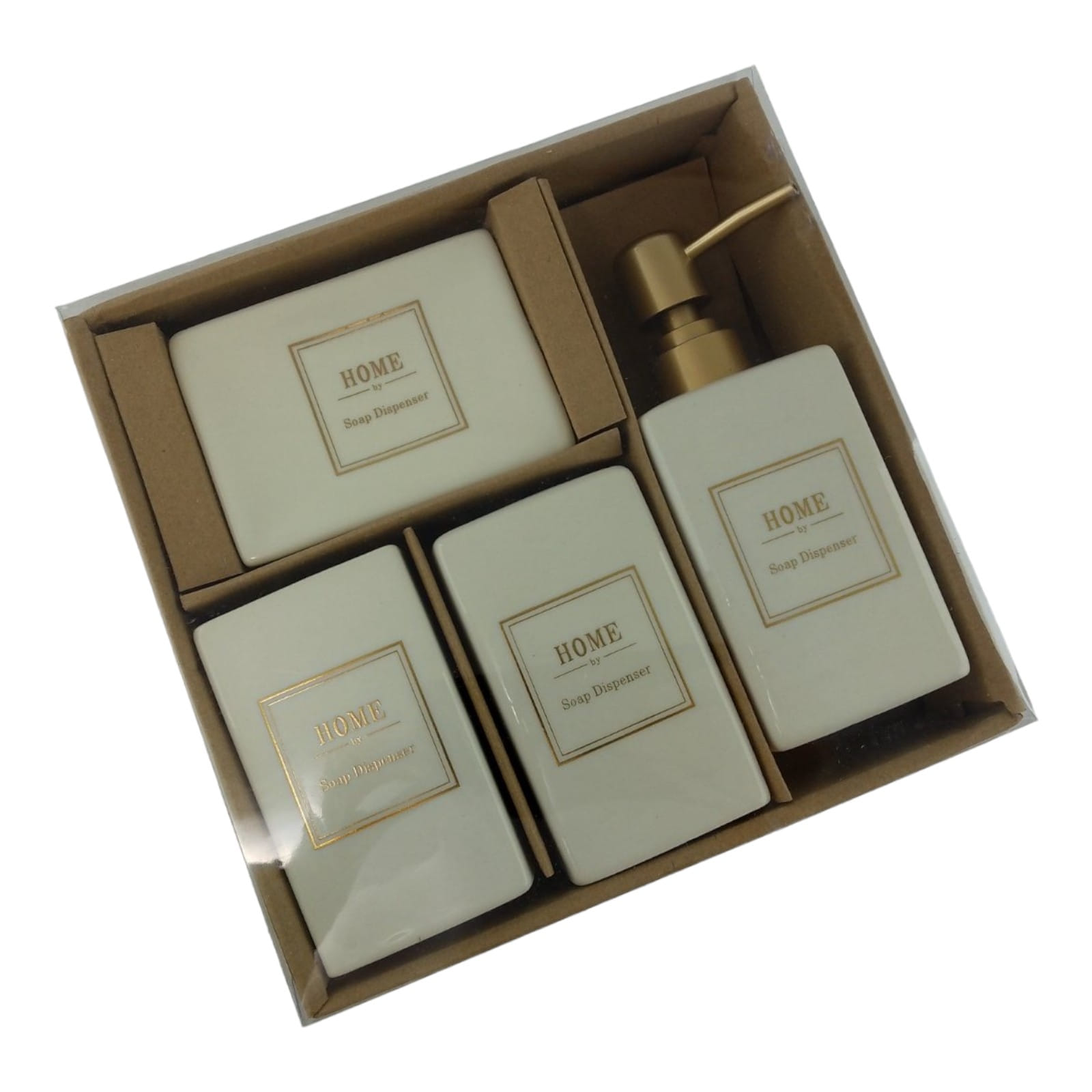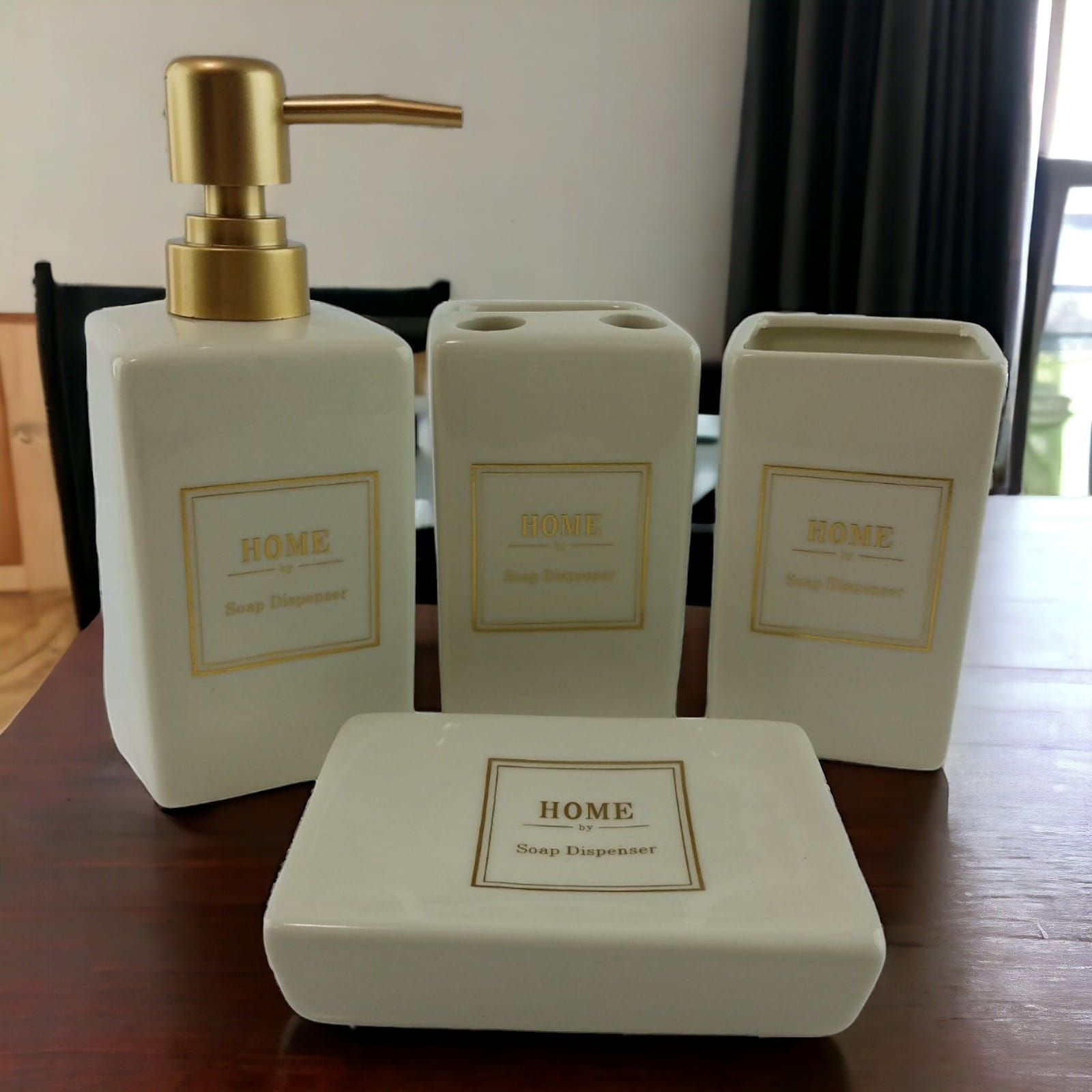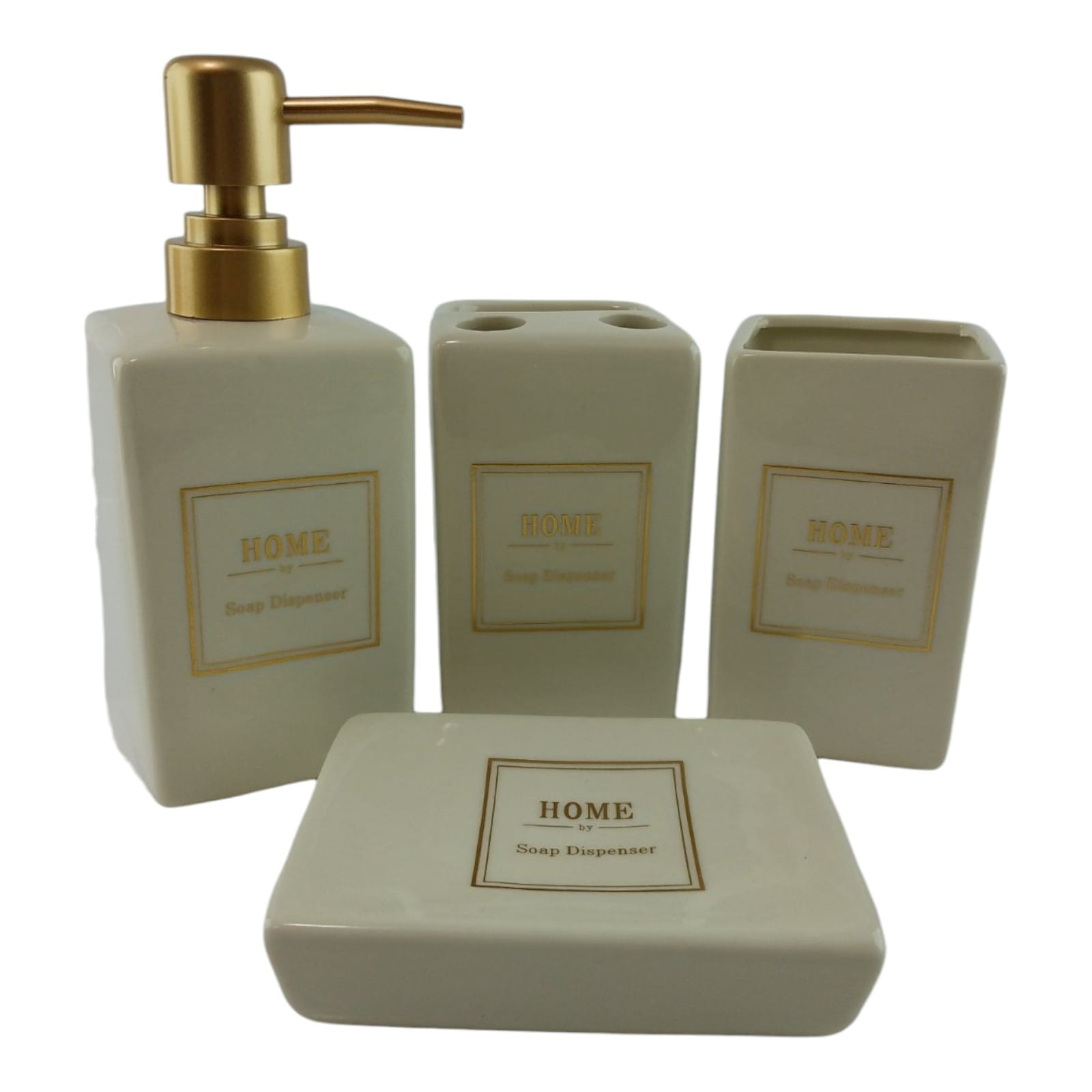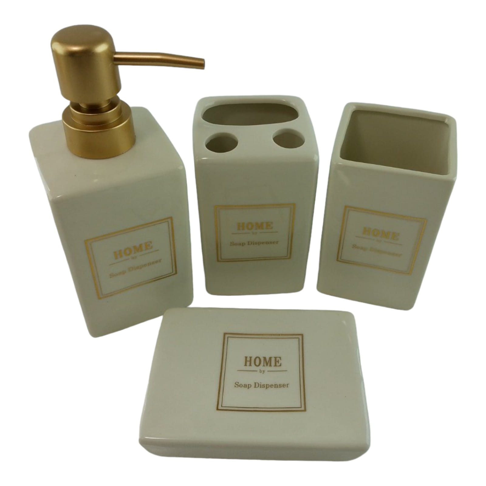 С очаровательным набором аксессуаров для ванной все предметы будут на своих местах. В керамический набор входит-дозатор для жидкого мыла, стакан ,органайзер для зубных щеток, мыльница.