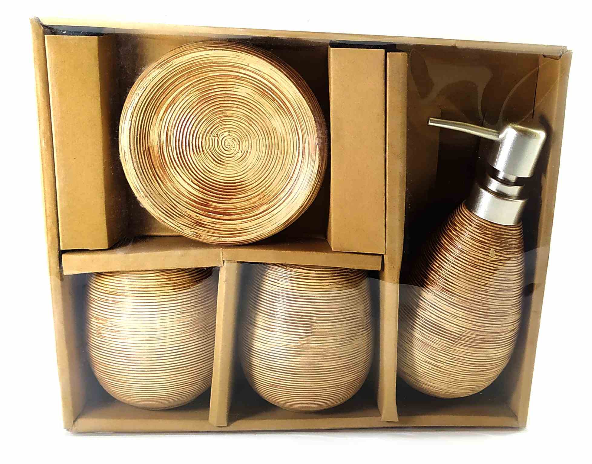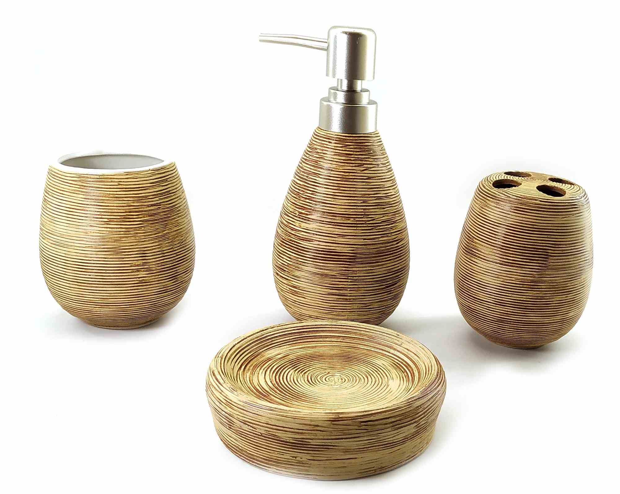 С очаровательным набором аксессуаров для ванной все предметы будут на своих местах. В керамический набор входит-дозатор для жидкого мыла, стакан ,органайзер для зубных щеток, мыльница.
