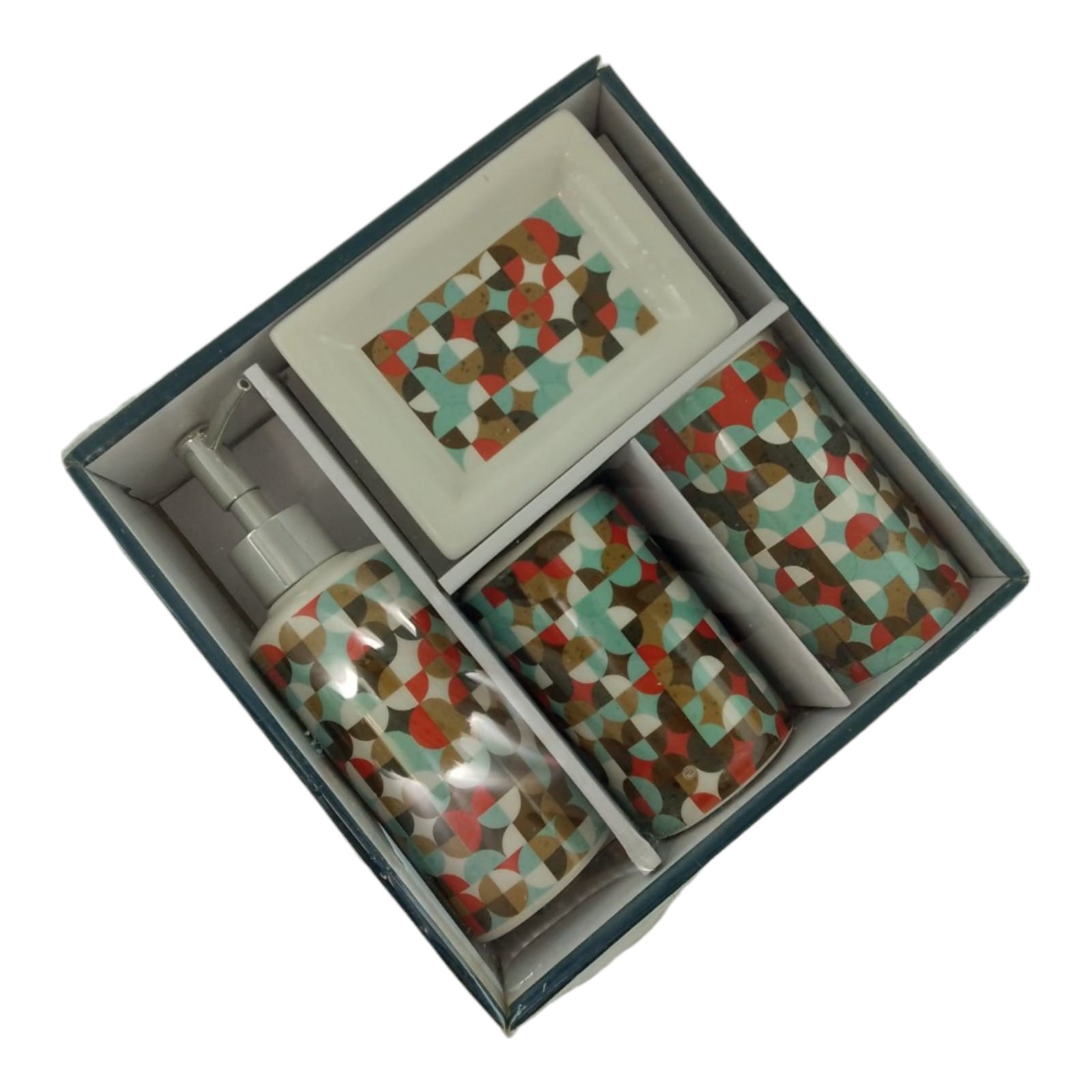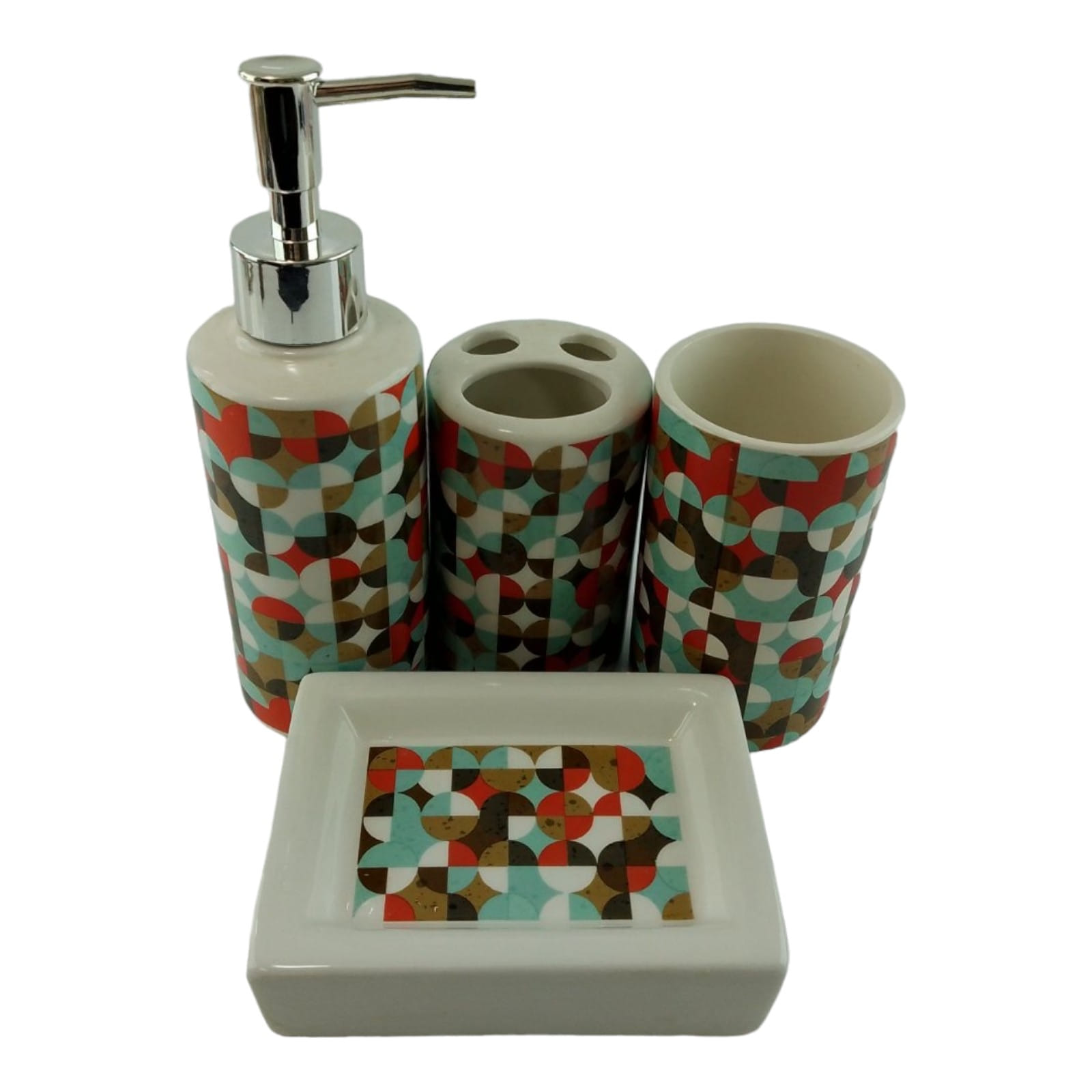 С очаровательным набором аксессуаров для ванной все предметы будут на своих местах. В керамический набор входит-дозатор для жидкого мыла, стакан ,органайзер для зубных щеток, мыльница.