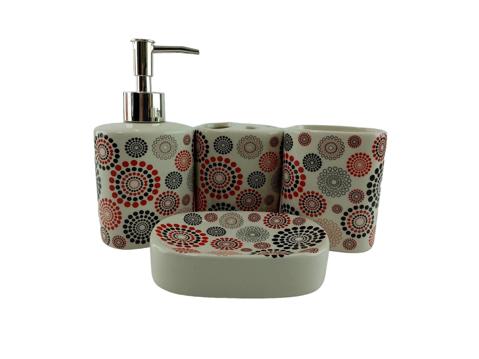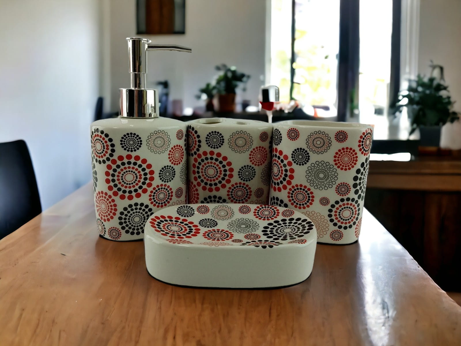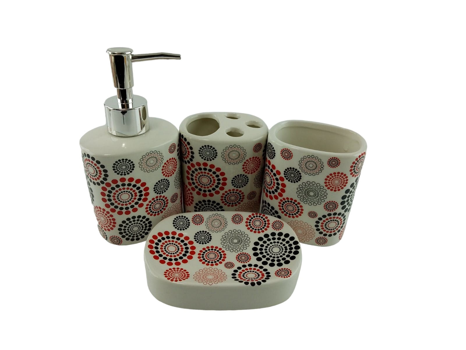 С очаровательным набором аксессуаров для ванной все предметы будут на своих местах. В керамический набор входит-дозатор для жидкого мыла, стакан ,органайзер для зубных щеток, мыльница.