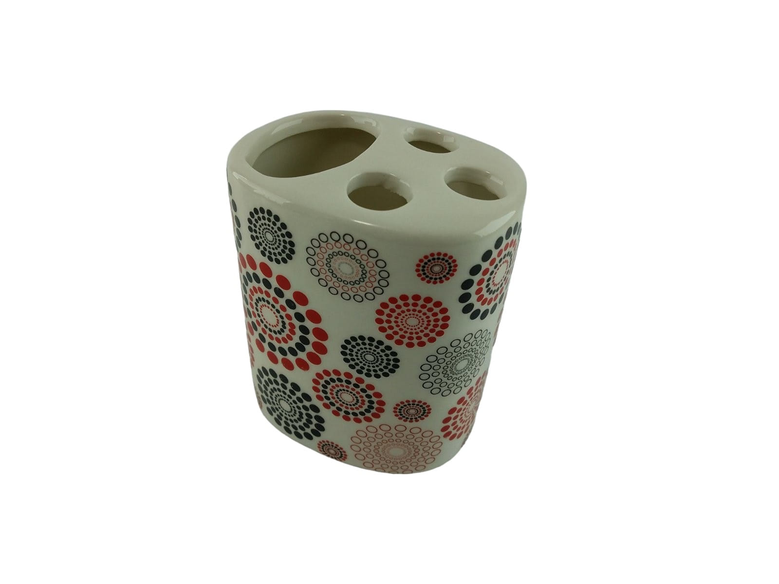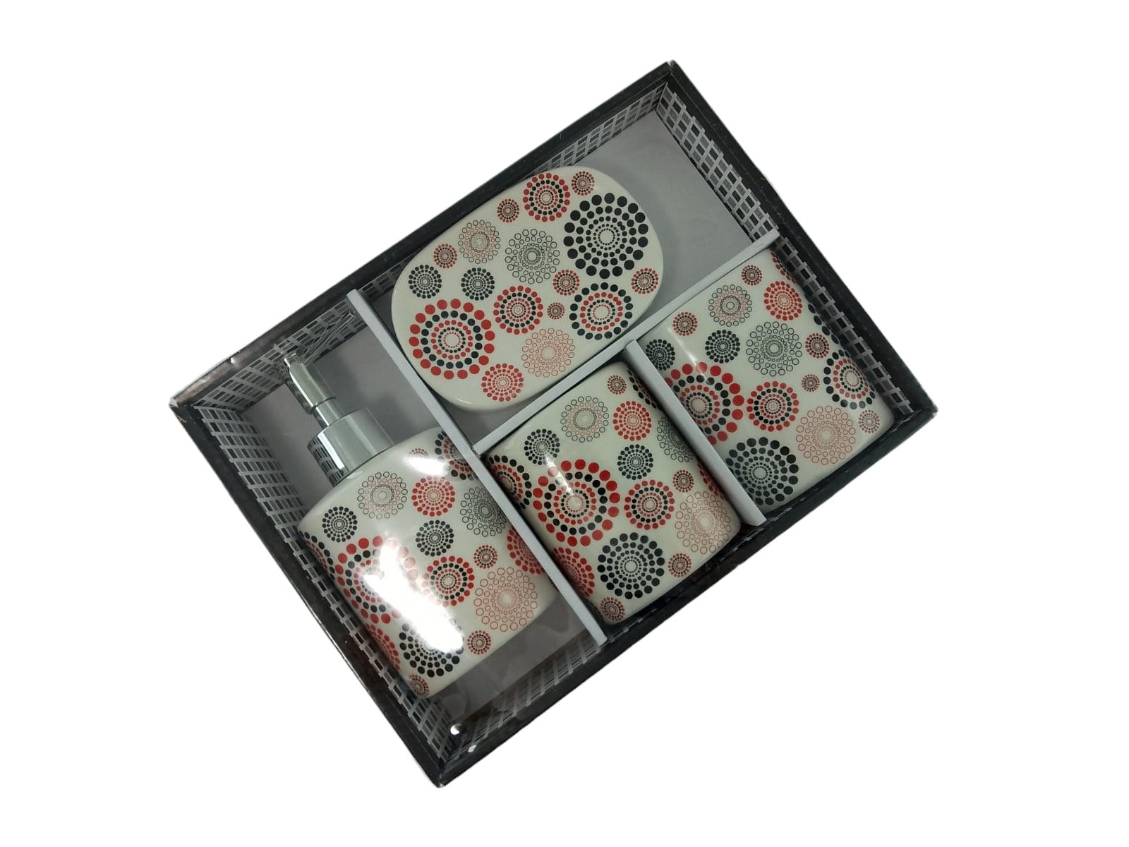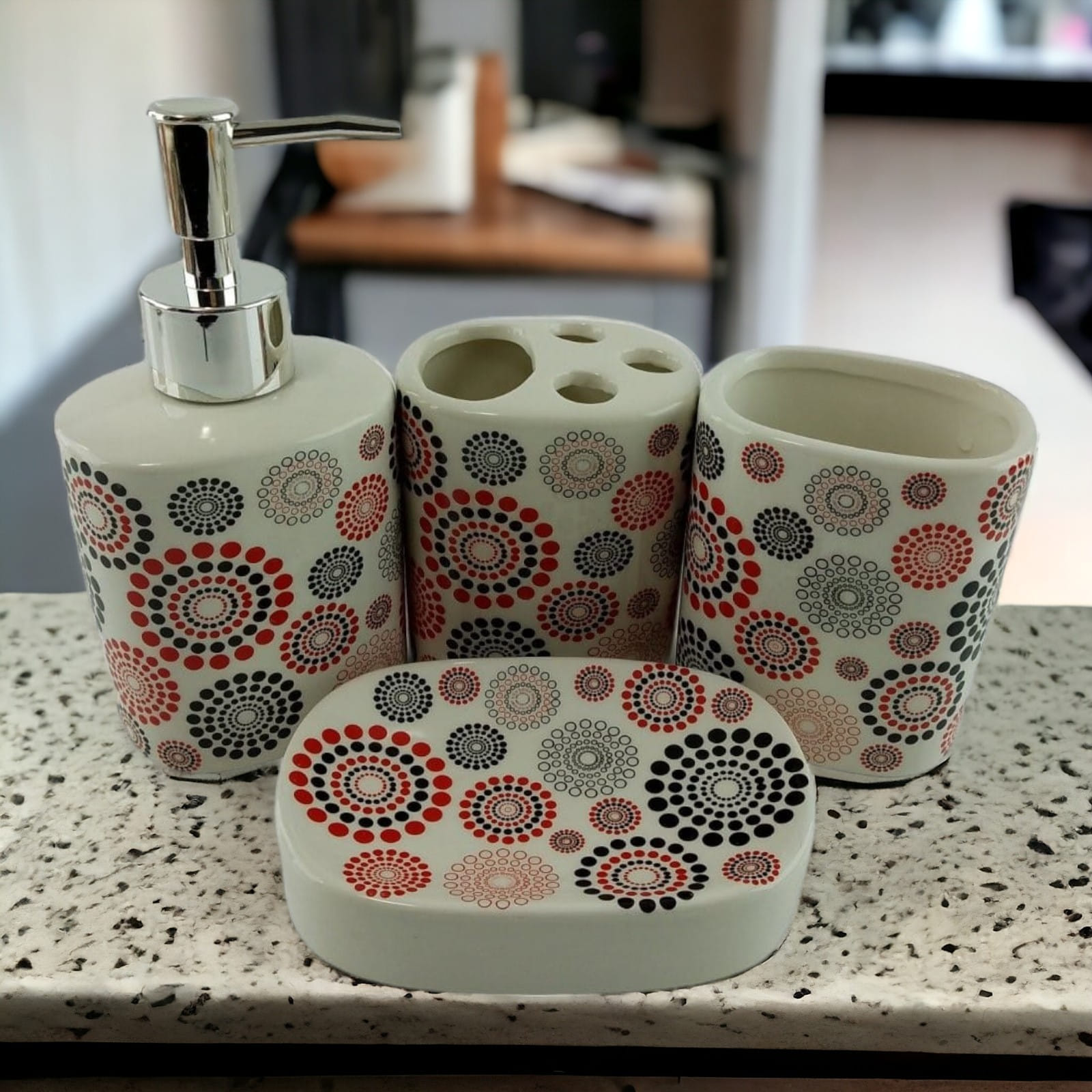 С очаровательным набором аксессуаров для ванной все предметы будут на своих местах. В керамический набор входит-дозатор для жидкого мыла, стакан ,органайзер для зубных щеток, мыльница.