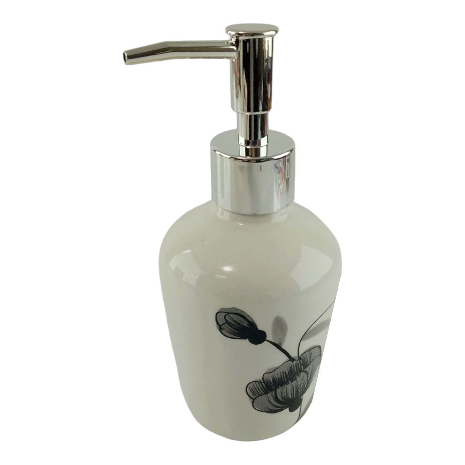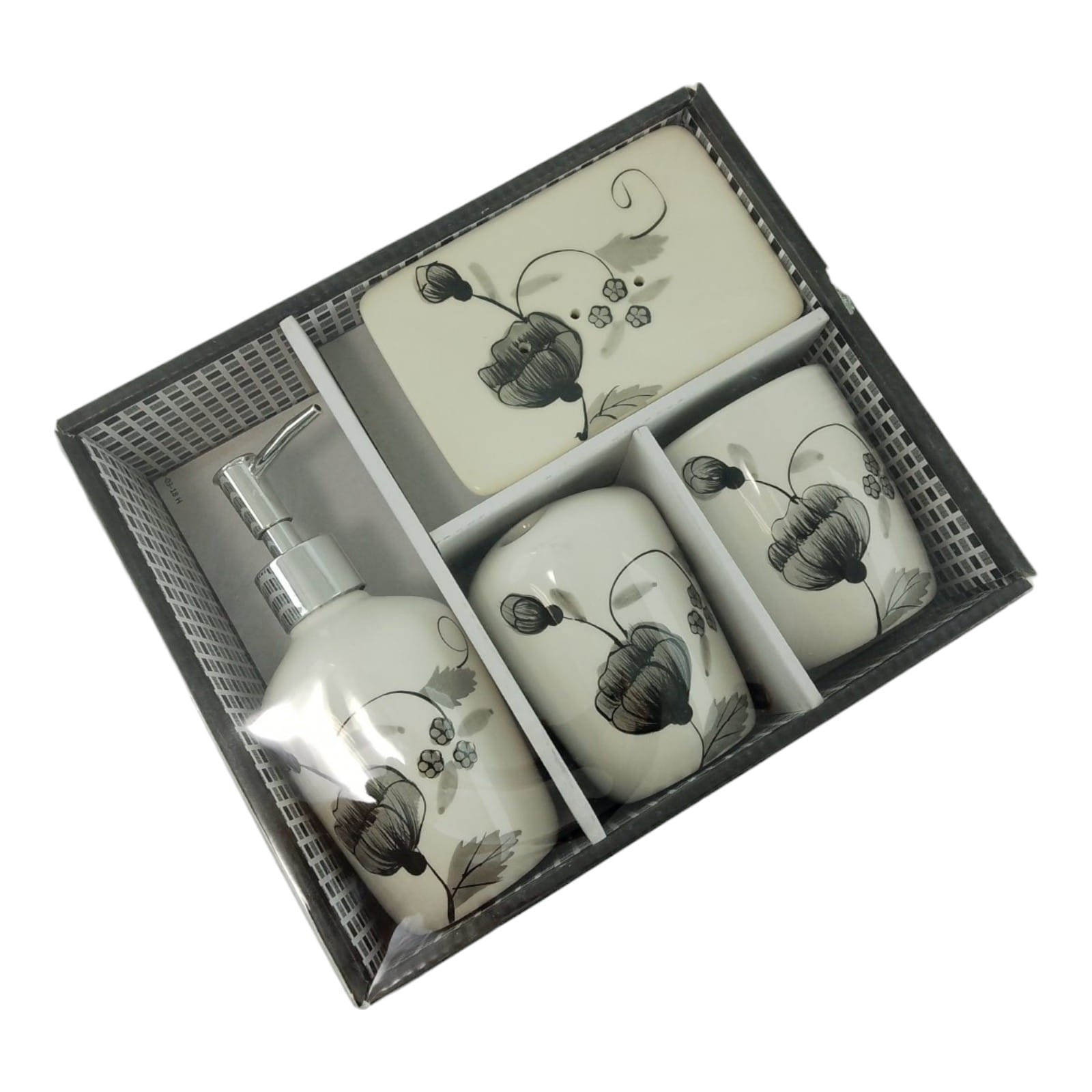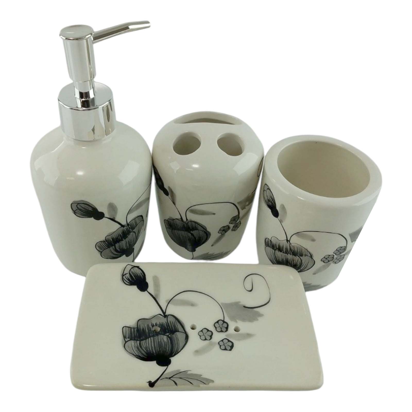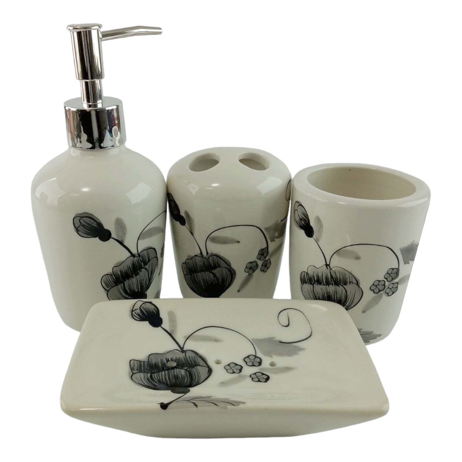 С очаровательным набором аксессуаров для ванной все предметы будут на своих местах. В керамический набор входит-дозатор для жидкого мыла, стакан ,органайзер для зубных щеток, мыльница.