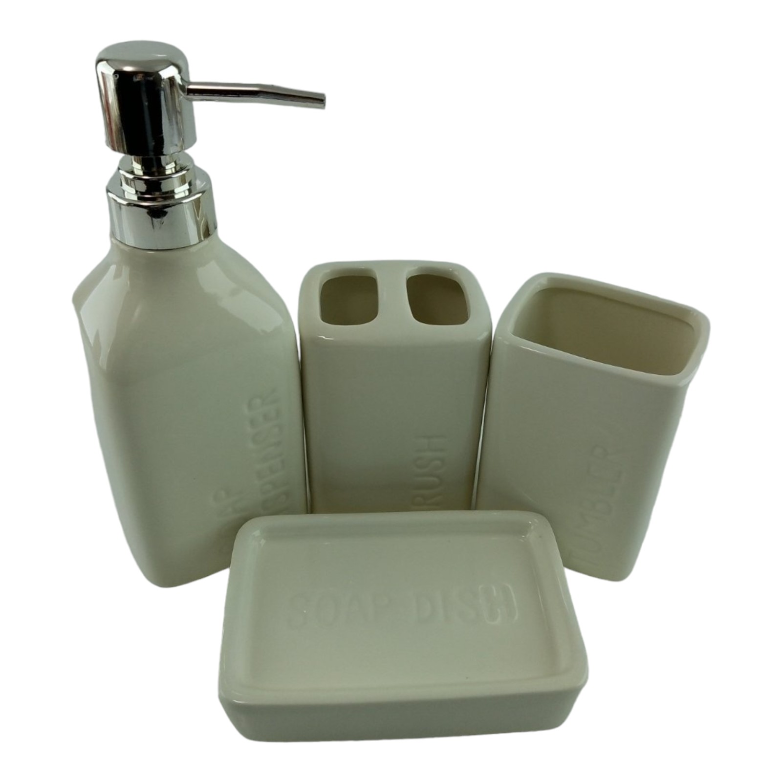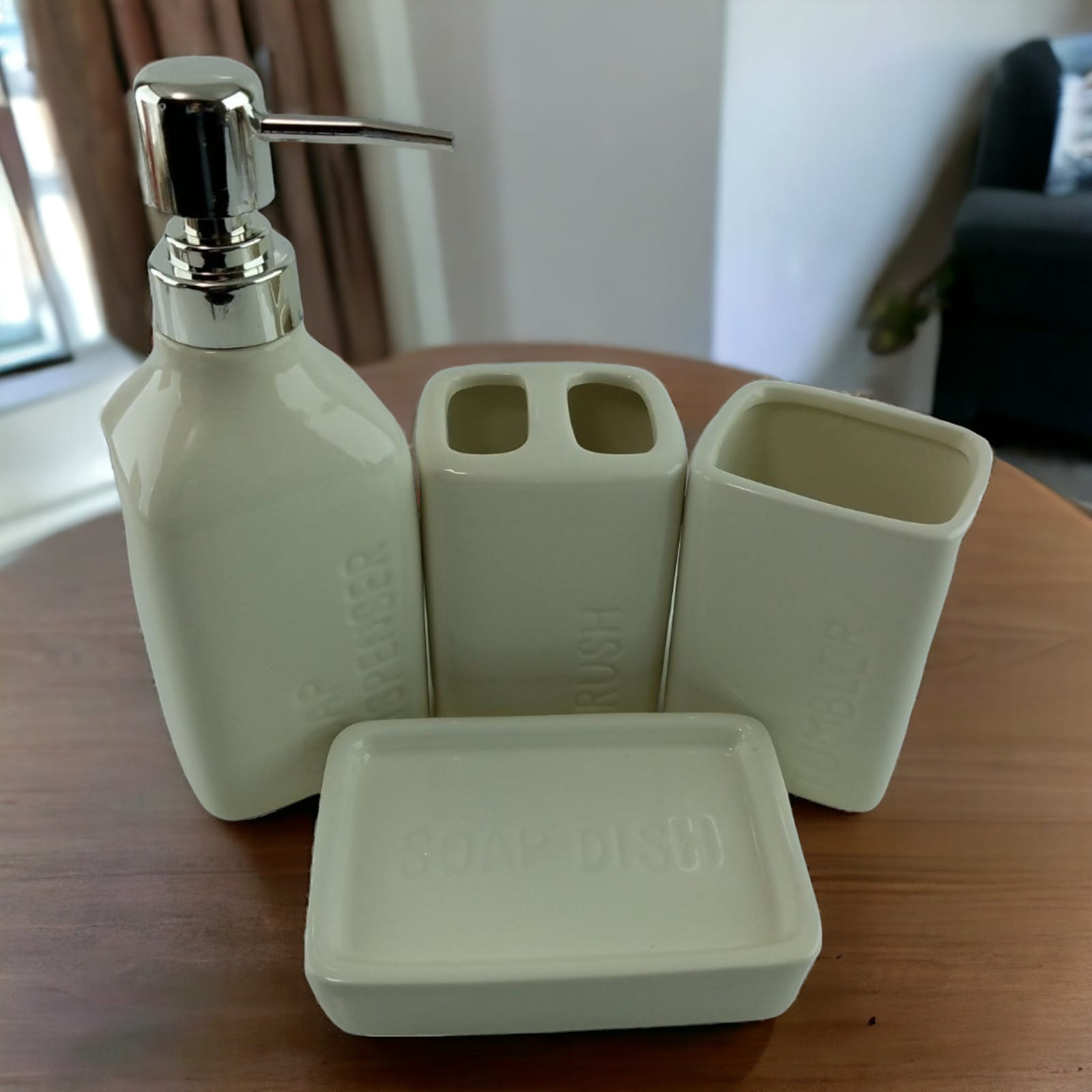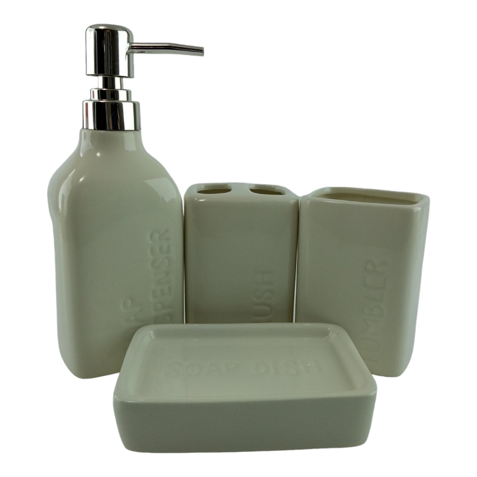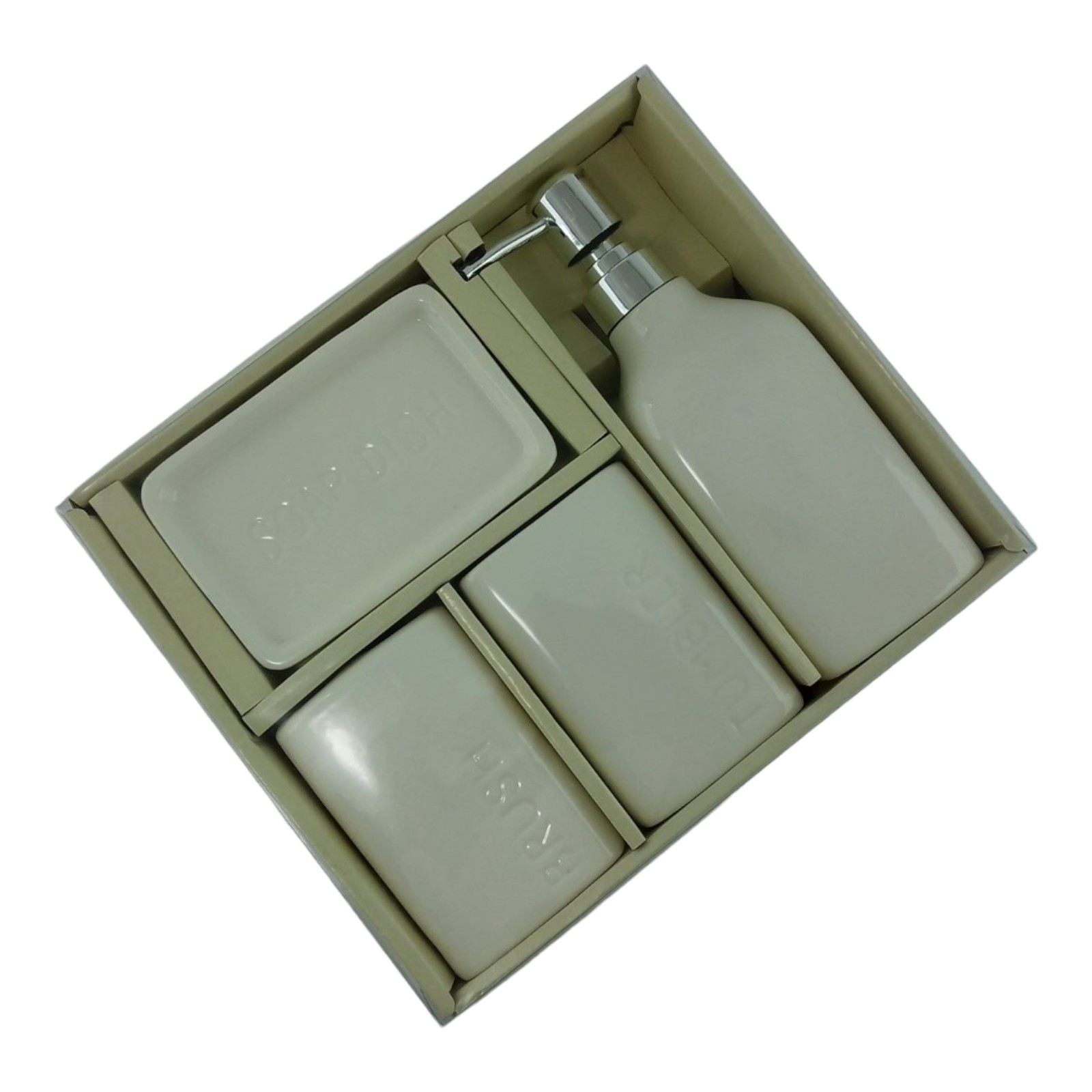 С очаровательным набором аксессуаров для ванной все предметы будут на своих местах. В керамический набор входит-дозатор для жидкого мыла, стакан ,органайзер для зубных щеток, мыльница.