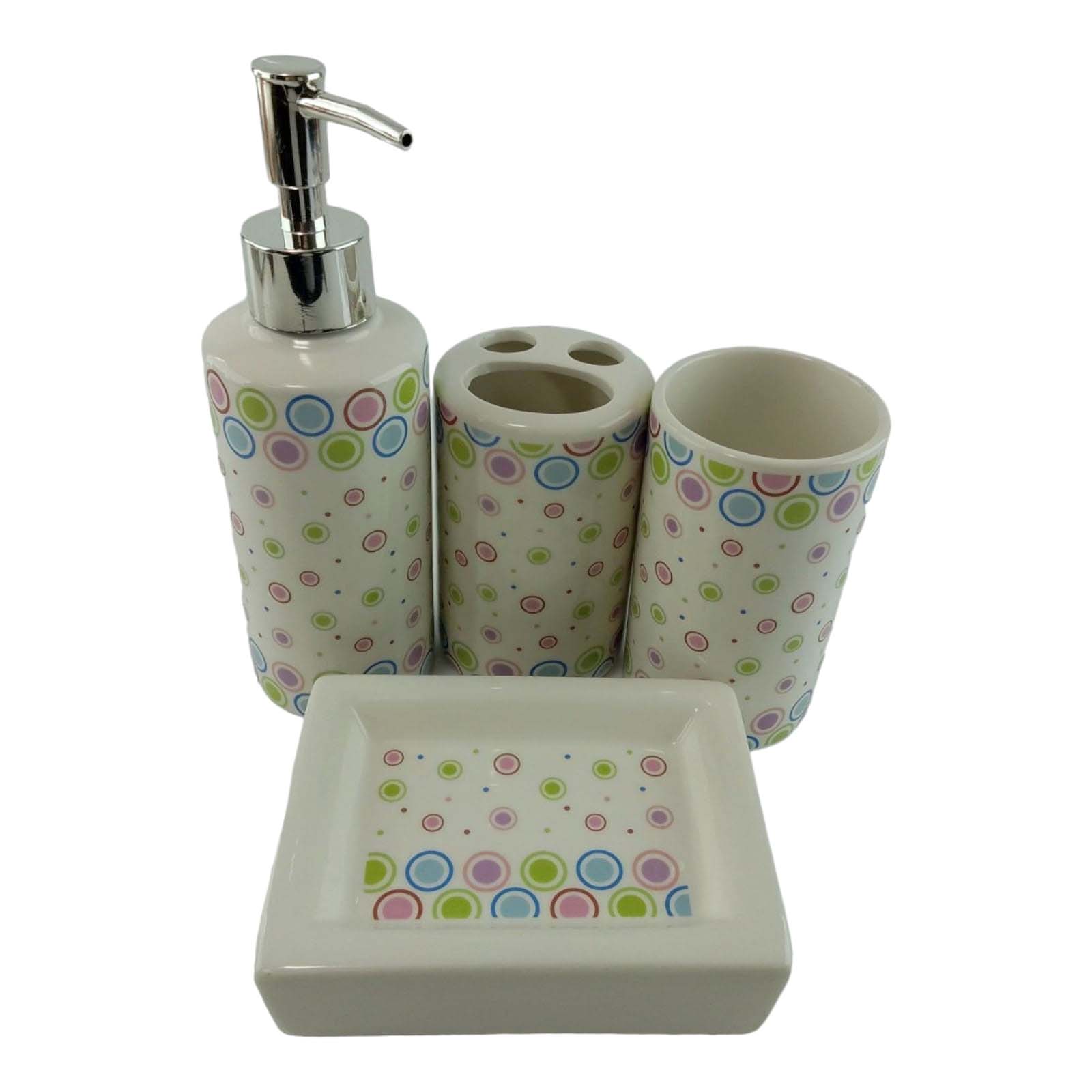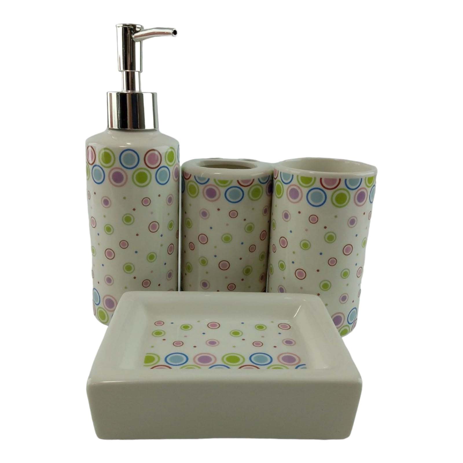 С очаровательным набором аксессуаров для ванной все предметы будут на своих местах. В керамический набор входит-дозатор для жидкого мыла, стакан ,органайзер для зубных щеток, мыльница.