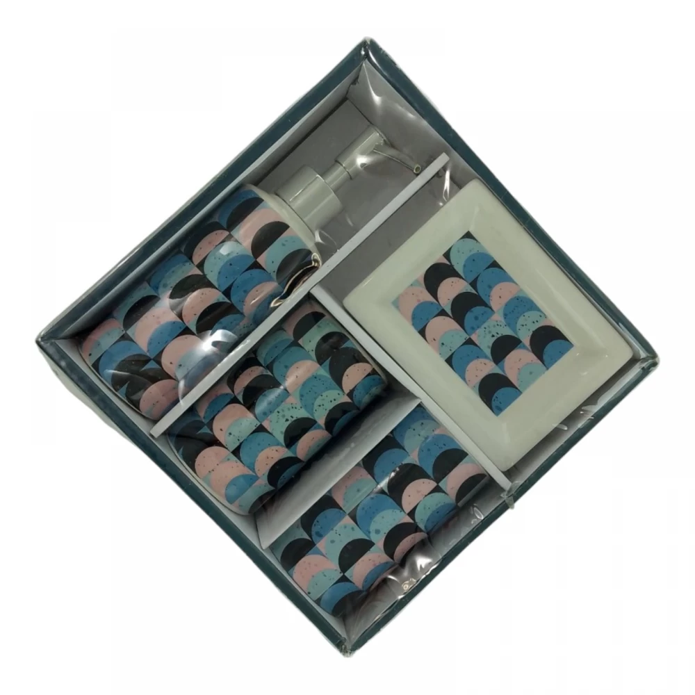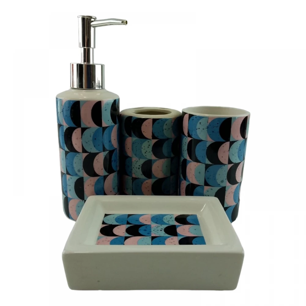 С очаровательным набором аксессуаров для ванной все предметы будут на своих местах. В керамический набор входит-дозатор для жидкого мыла, стакан ,органайзер для зубных щеток, мыльница.