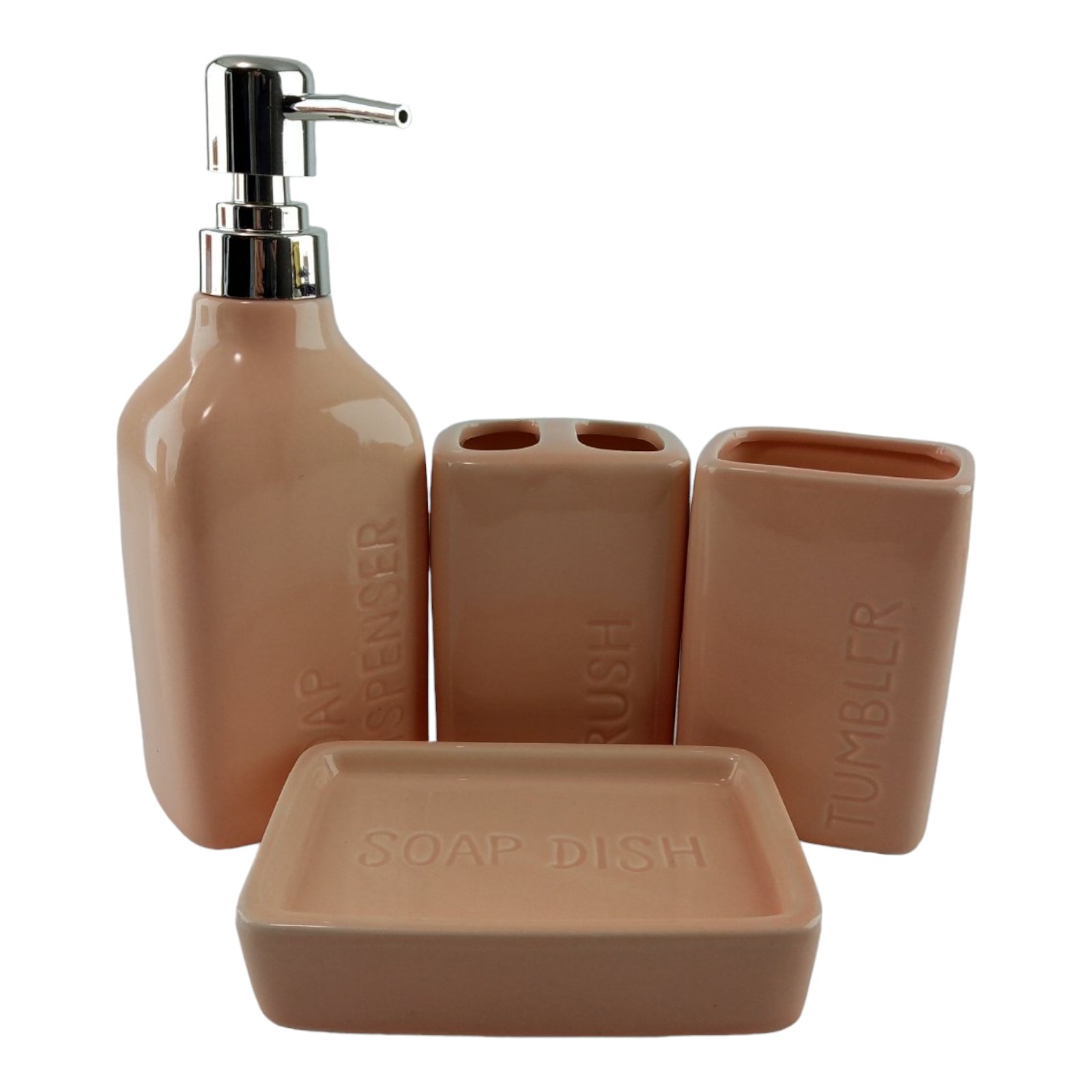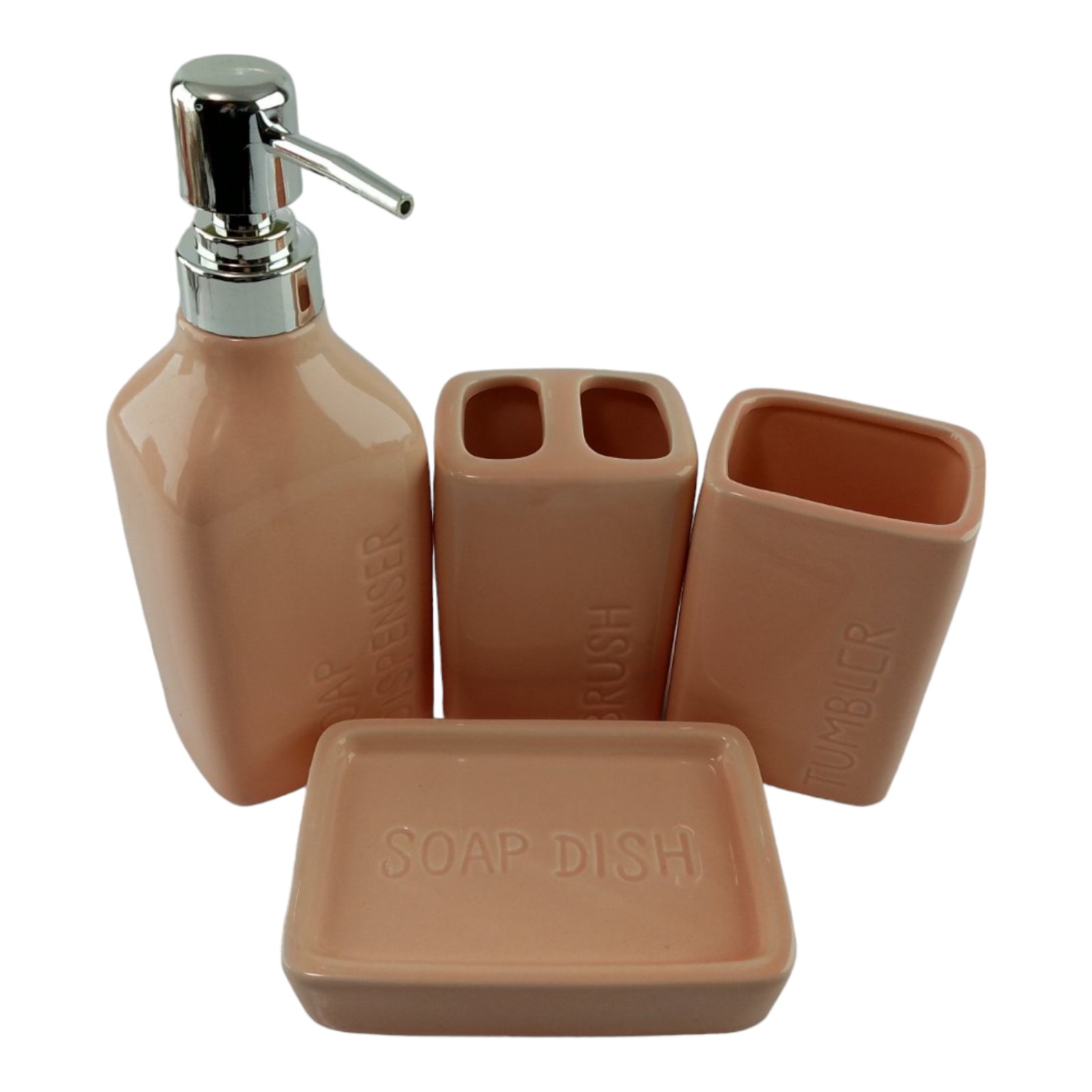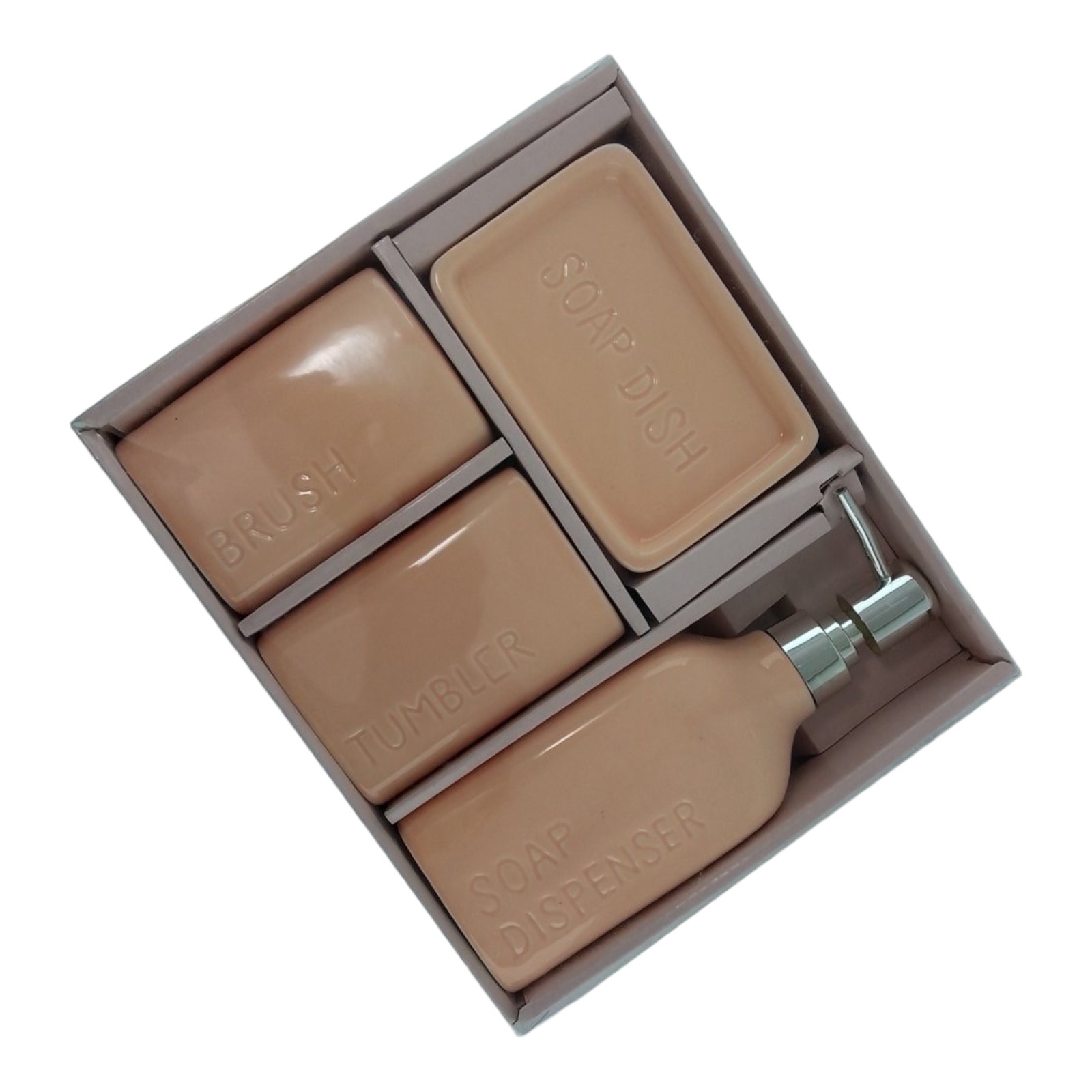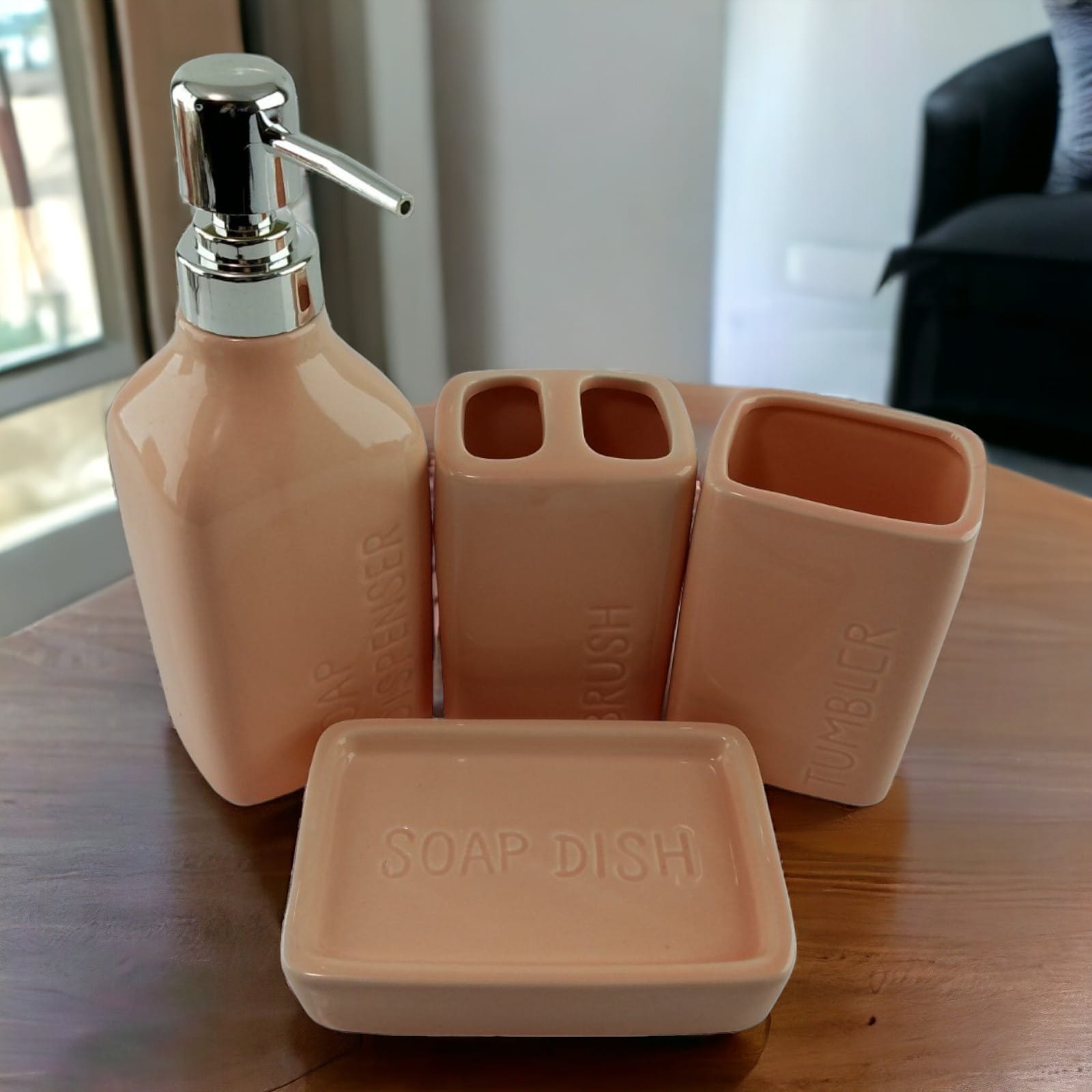 С очаровательным набором аксессуаров для ванной все предметы будут на своих местах. В керамический набор входит-дозатор для жидкого мыла, стакан ,органайзер для зубных щеток, мыльница.