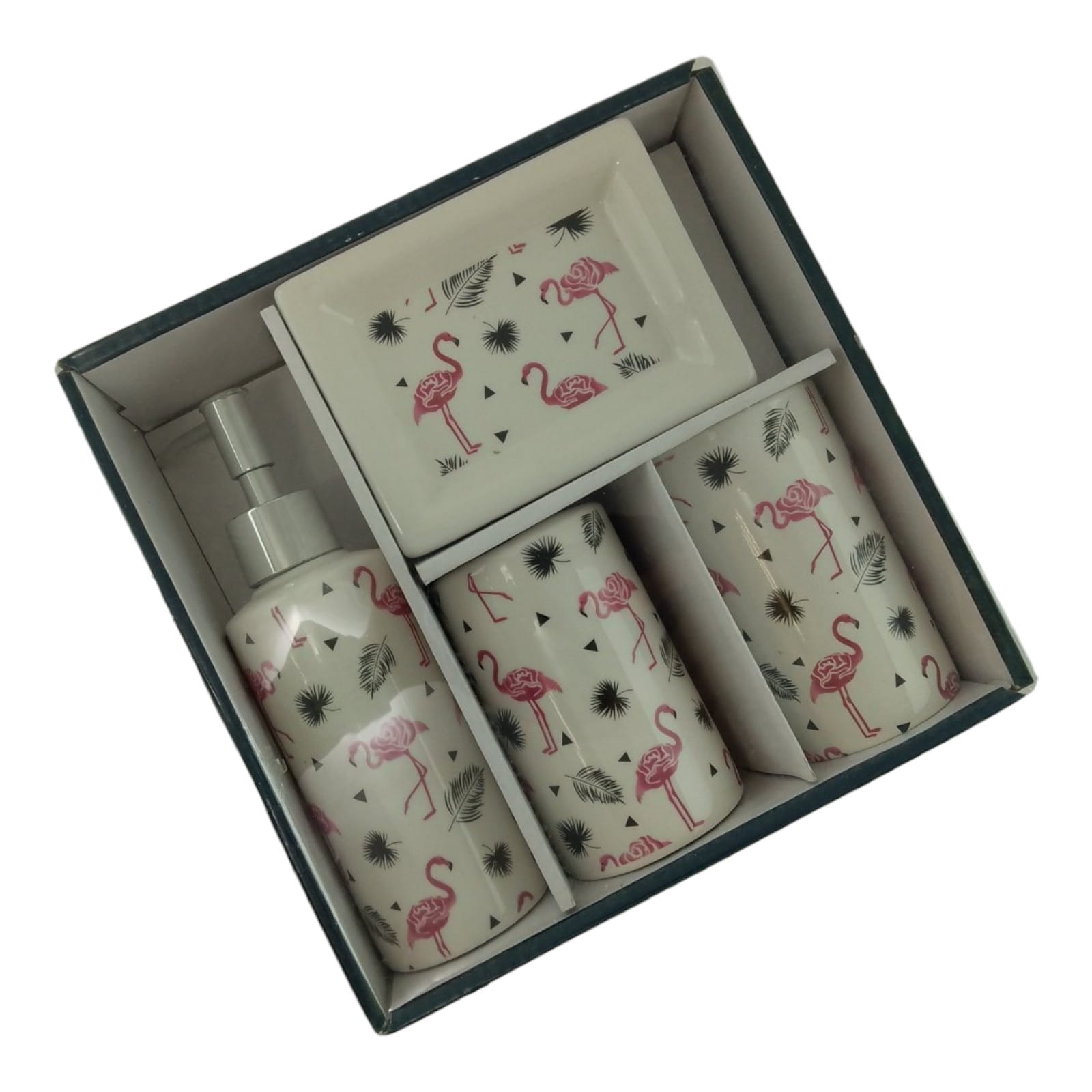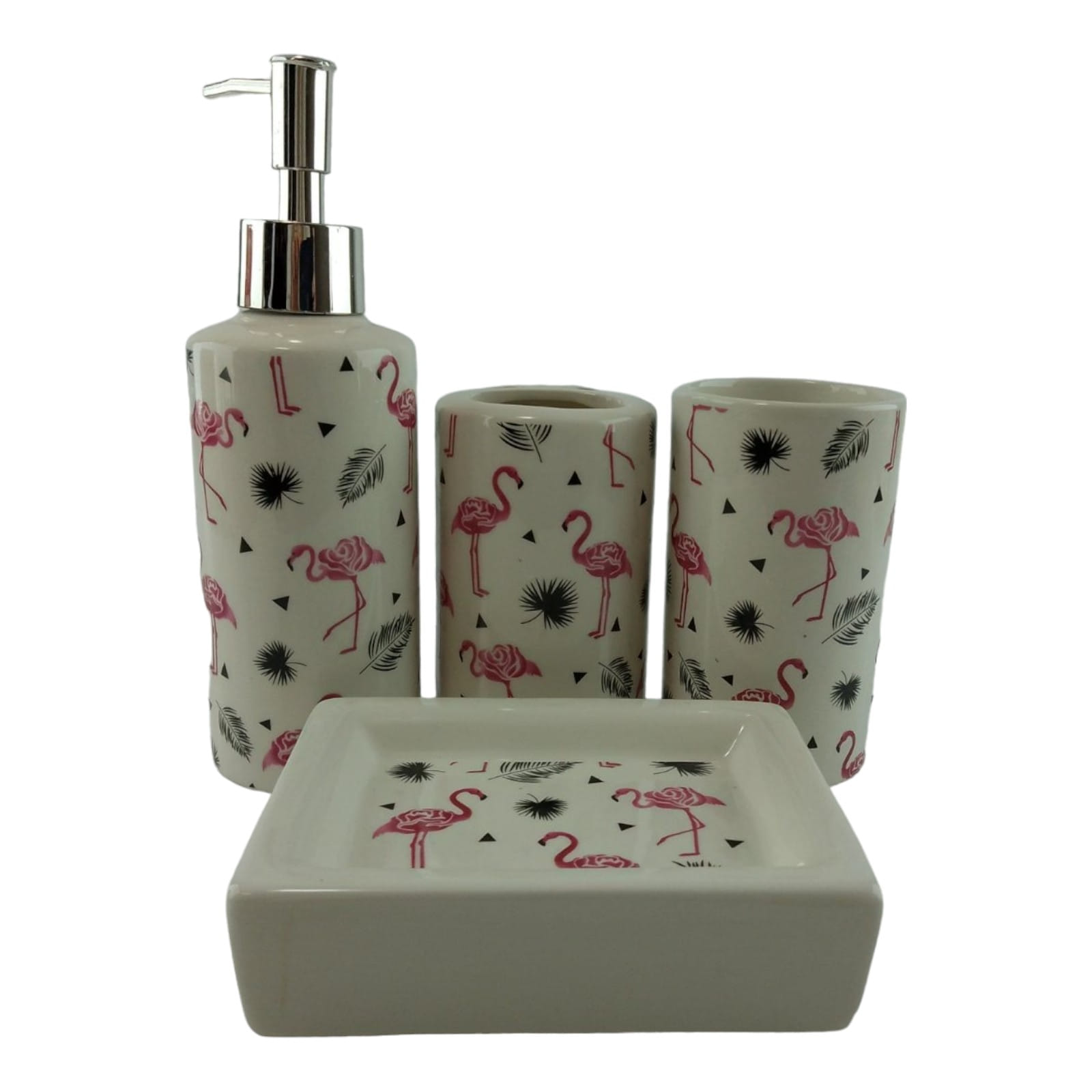 С очаровательным набором аксессуаров для ванной все предметы будут на своих местах. В керамический набор входит-дозатор для жидкого мыла, стакан ,органайзер для зубных щеток, мыльница.
