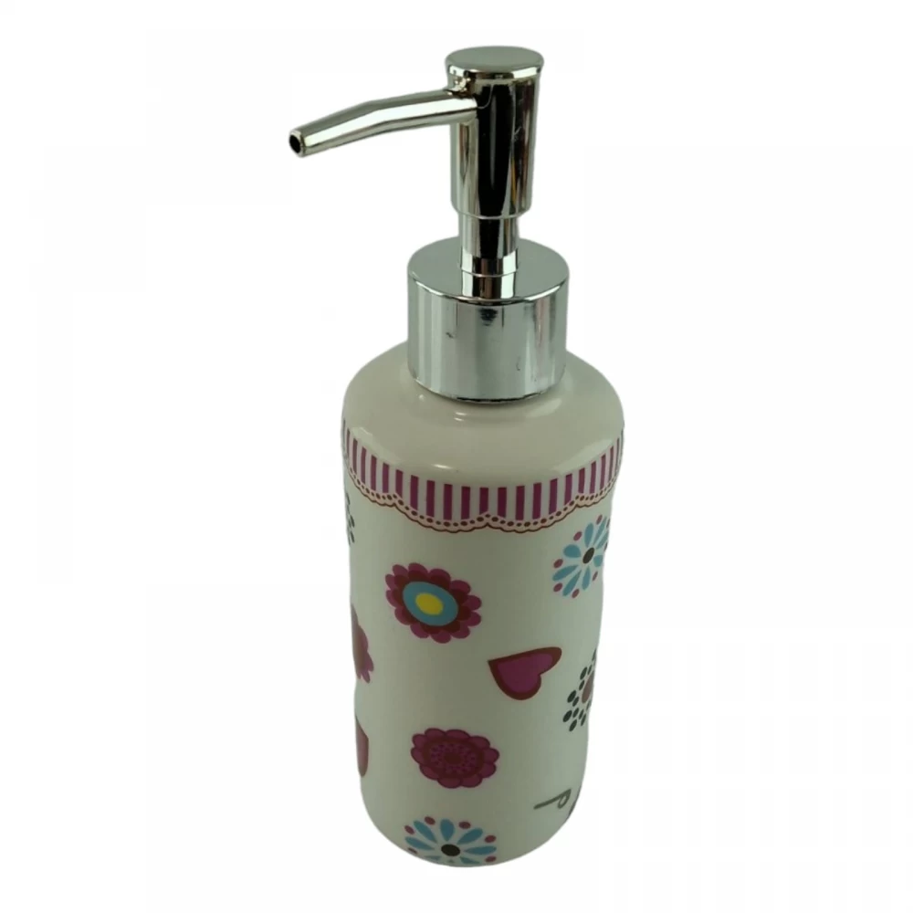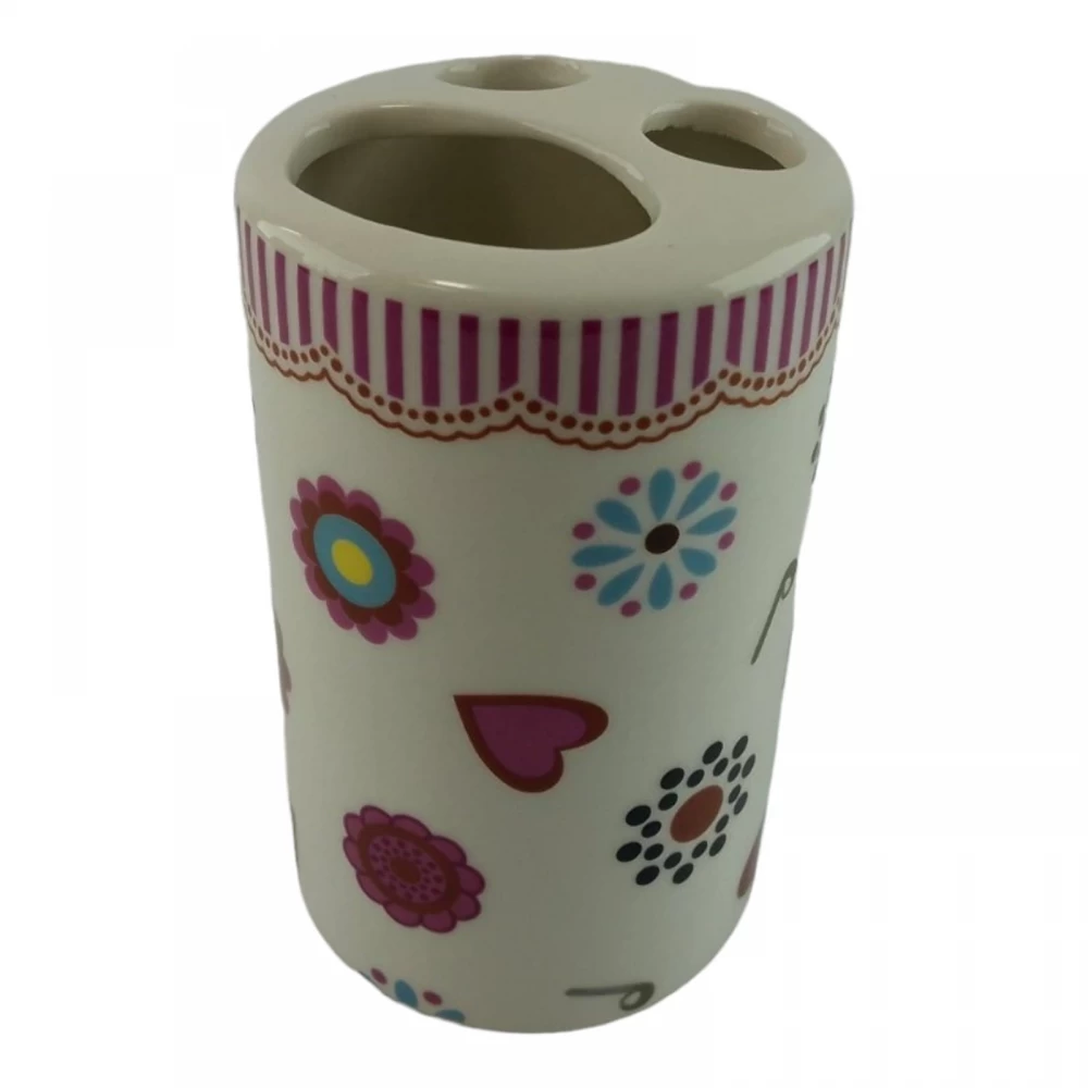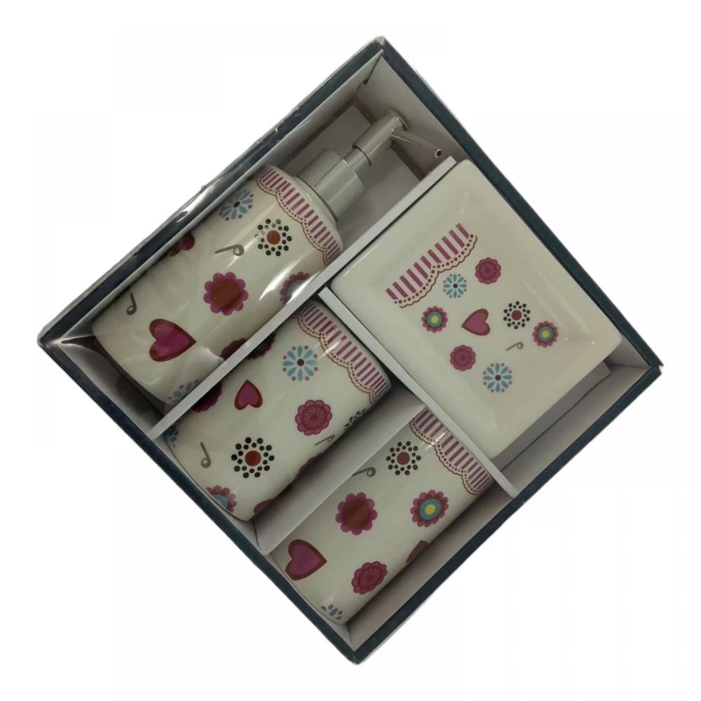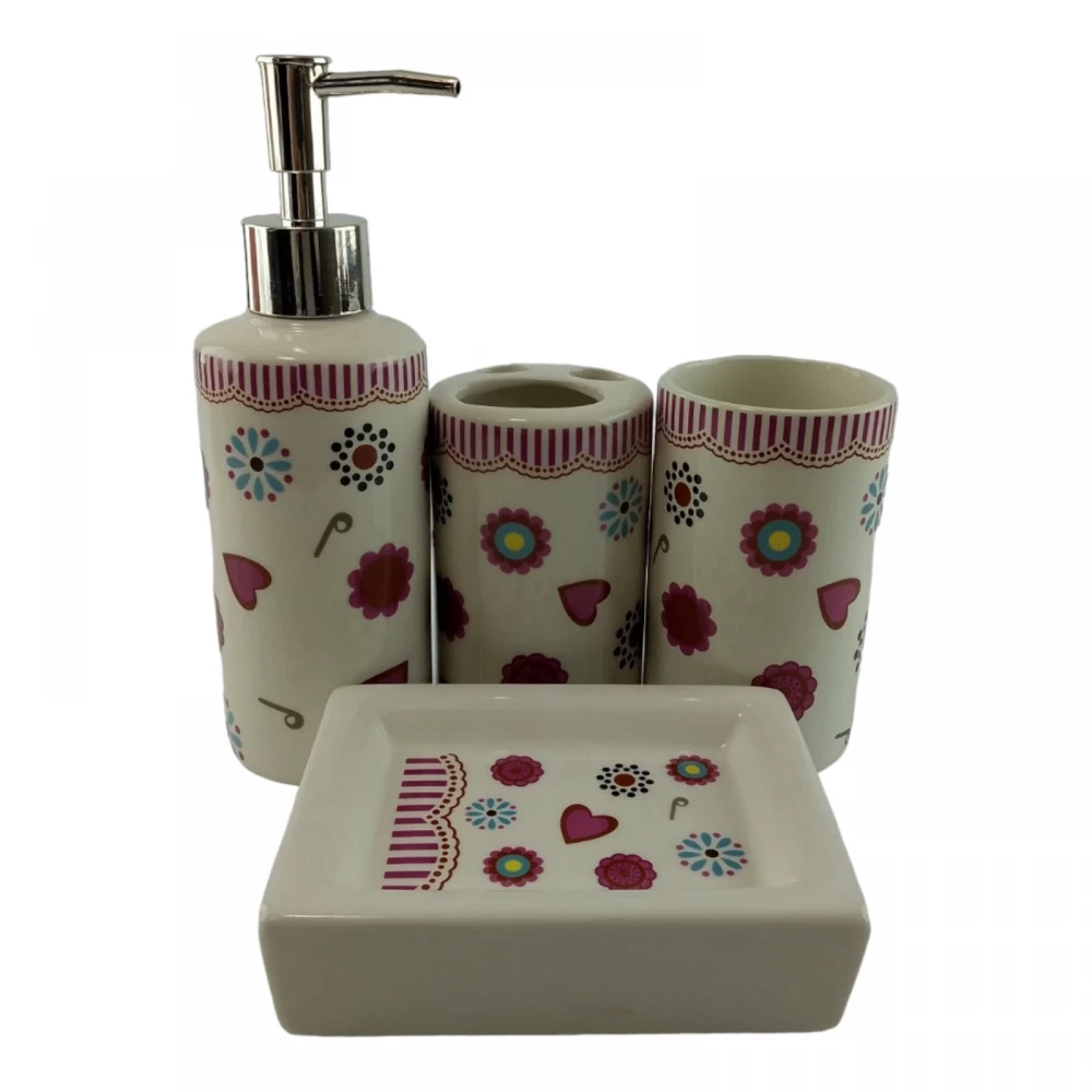 С очаровательным набором аксессуаров для ванной все предметы будут на своих местах. В керамический набор входит-дозатор для жидкого мыла, стакан ,органайзер для зубных щеток, мыльница.