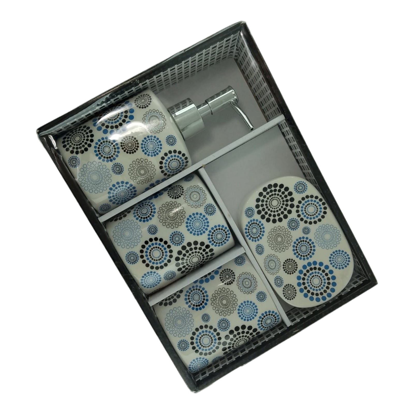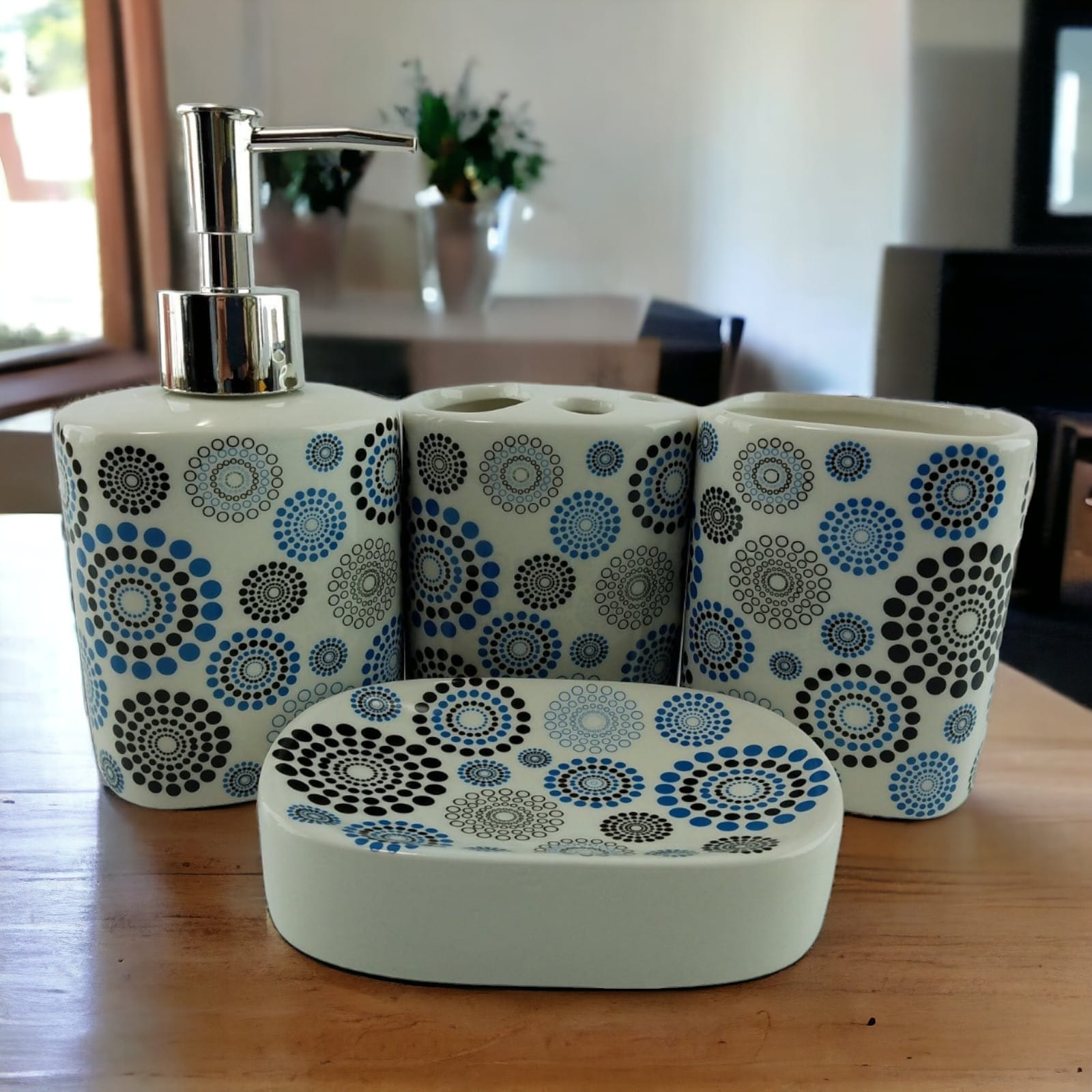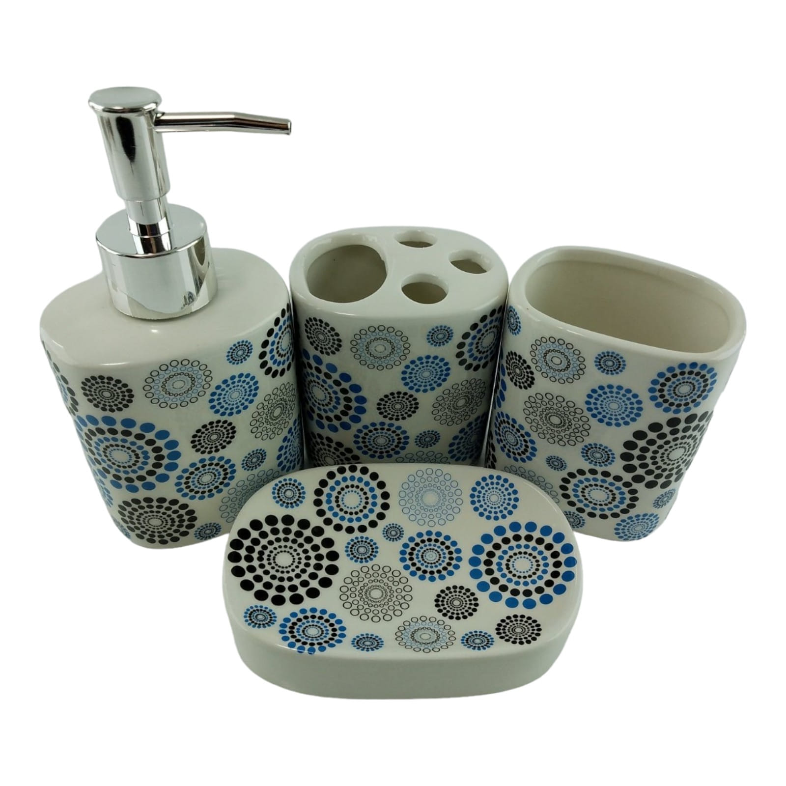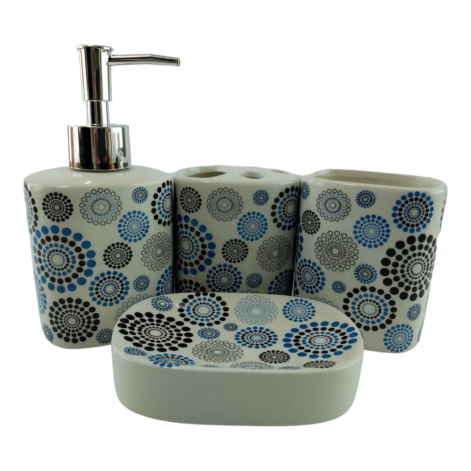 С очаровательным набором аксессуаров для ванной все предметы будут на своих местах. В керамический набор входит-дозатор для жидкого мыла, стакан ,органайзер для зубных щеток, мыльница.
