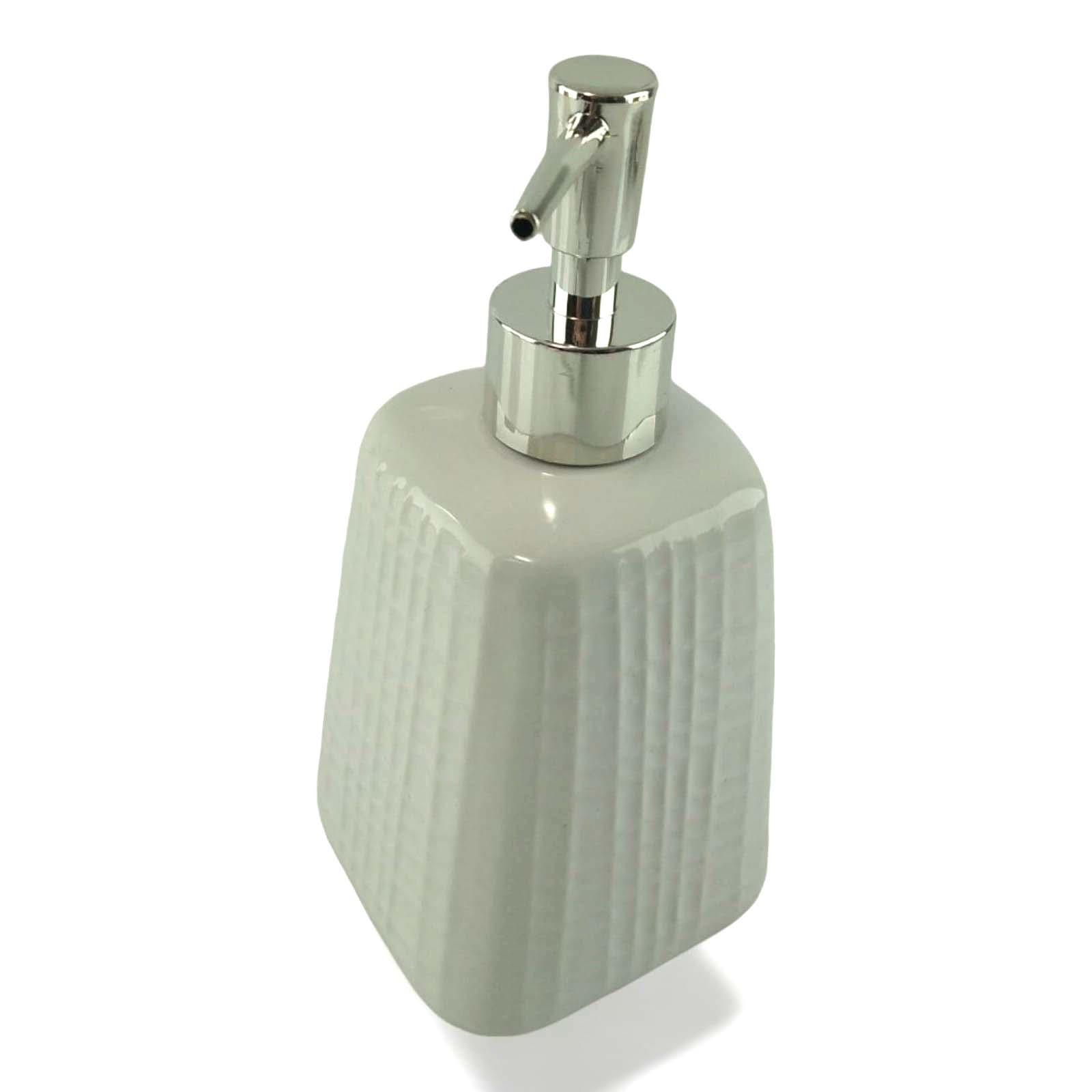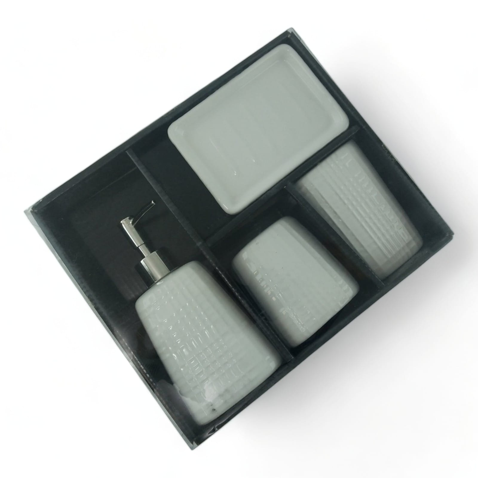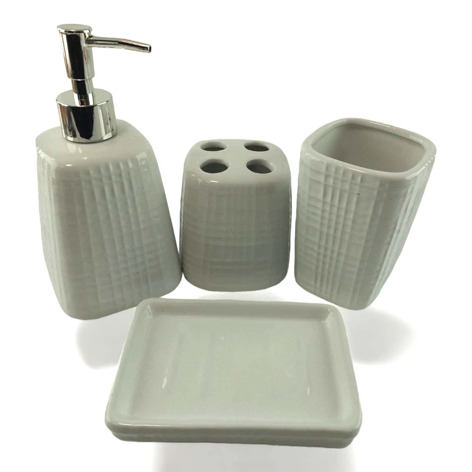 С очаровательным набором аксессуаров для ванной все предметы будут на своих местах. В керамический набор входит-дозатор для жидкого мыла, стакан ,органайзер для зубных щеток, мыльница.
