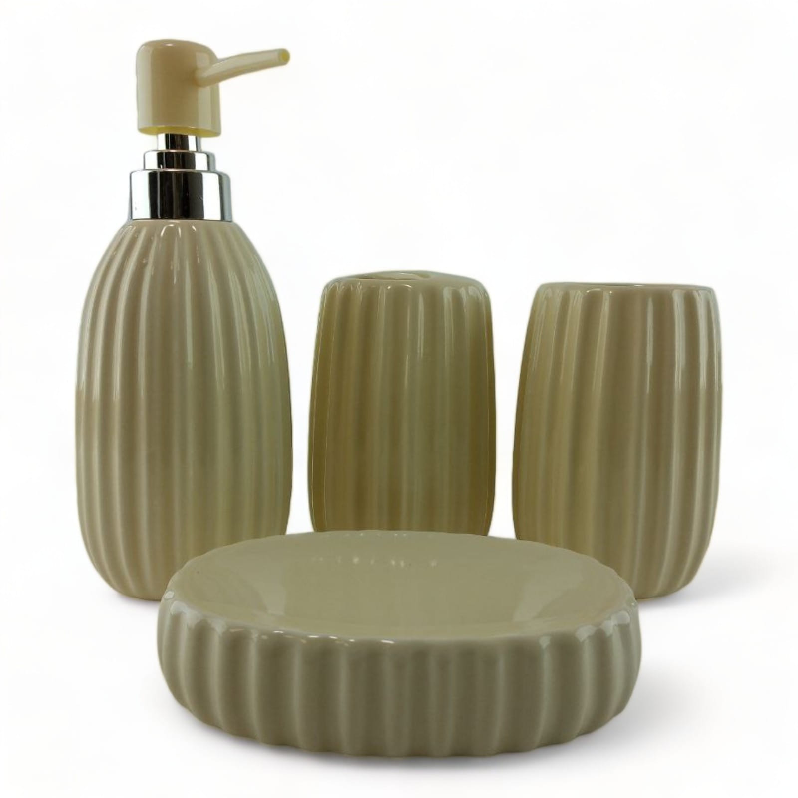 С очаровательным набором аксессуаров для ванной все предметы будут на своих местах. В керамический набор входит-дозатор для жидкого мыла, стакан ,органайзер для зубных щеток, мыльница.