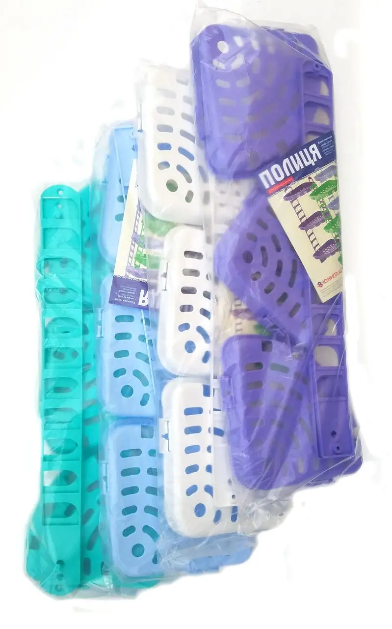 Угловая полипропиленовая полочка для ванной комнаты или кухни. Представляет собой конструкцию, состоящую из трех полочек и двух планок-каркасов, которые крепятся к стене и имеют отверстия-направляющие, куда вставляются полочки. Благодаря тому, что направляющие расположены на расстоянии с определенным шагом друг от друга, есть возможность варьировать расстояние между полочками так, чтобы помещались необходимые предметы по своей высоте. Полочка имеет высокий край, это не позволяет расположенным на ней предметам падать. Полочки выполнены в приятных пастельных тонах, имеют несколько цветовых вариантов, что дает возможность выбрать вариант, подходящий для своего интерьера. Изделие хорошо выдерживает избыточную влагу, перепады температур, хорошо моются