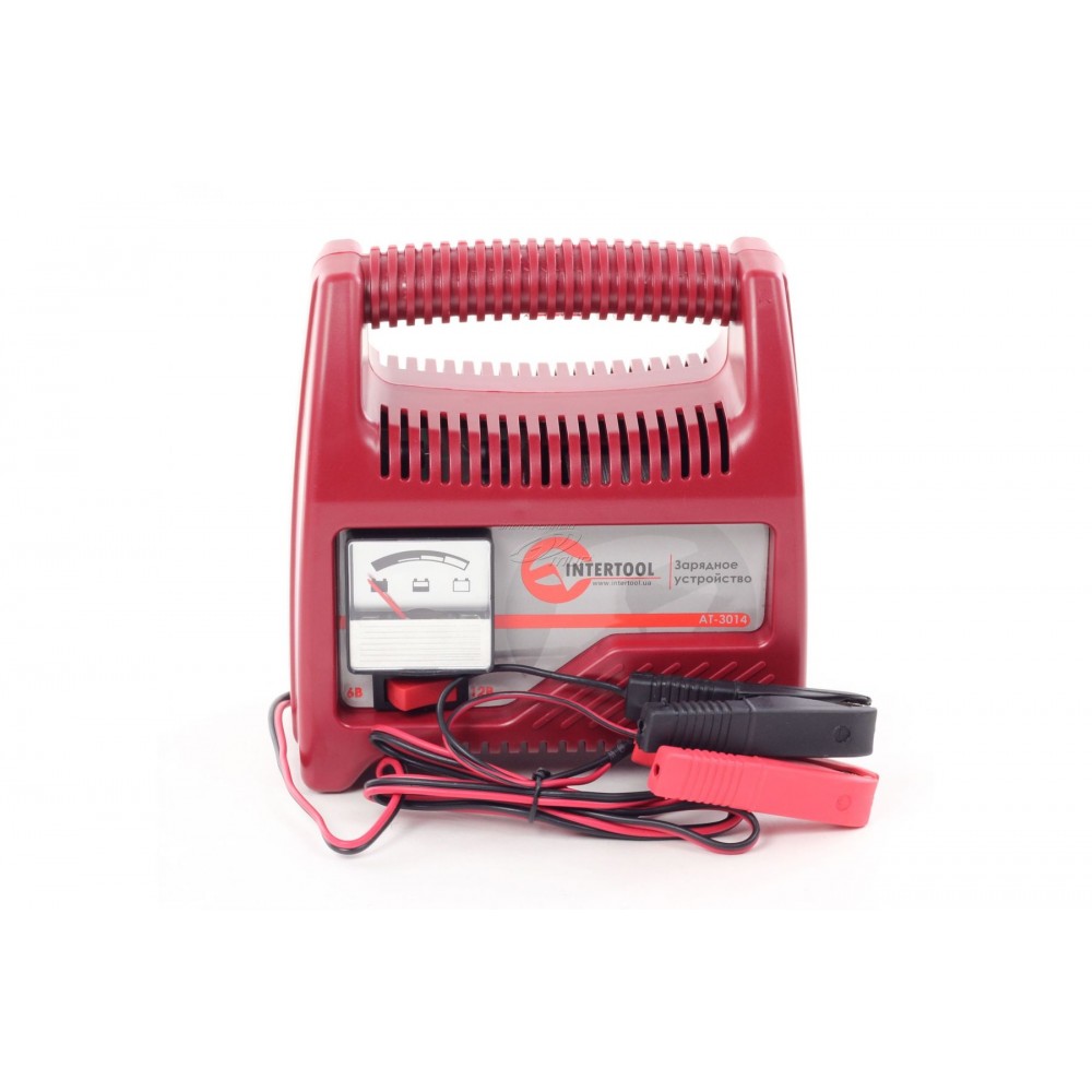 Компактное зарядное устройство AT-3014 INTERTOOL предназначено для зарядки аккумуляторных батарей 6 В и 12 В, емкостью до 60 Ач. Данная модель зарядного устройства подходит для зарядки аккумуляторных батарей мотоциклов, автомобилей и других механических транспортных средств. Питается зарядное устройство от бытовой сети с напряжением 230 В. С помощью разъемов-крокодилов устройство подсоединяется к контактам аккумуляторной батареи с соблюдением полярности. Ток заряда составляет 6 А. На передней стороне зарядного устройства имеется удобный тумблер-переключатель для выбора режима зарядки на 6 В или на 12 В и стрелочный индикатор тока зарядки. Автомобильное зарядное устройство имеет небольшие габаритные размеры и малый вес. Оно не займет много свободного пространства в вашем гараже. Переносить зарядное устройство можно с помощью верхней ручки. Хранить зарядное устройство необходимо в закрытых помещениях при минимальной влажности воздуха и при окружающей температуре воздуха от -10°C до +30°C. При длительном хранении зарядного устройства с температурой окружающего воздуха менее чем -10°C, перед включением устройства дайте ему прогреться в теплом помещении, как минимум 1 час.