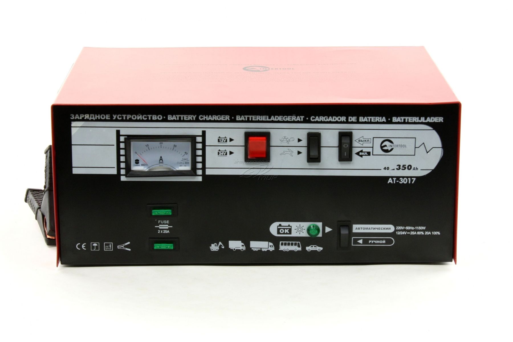 Назначение зарядного устройства AT-3017 – это зарядка аккумуляторных батарей механических транспортных средств на 12 В и 24 В с емкостью батареи до 350 Ач. Зарядное утсройство потребляет при этом 500 Вт мощности от сети в 230 В. Преимуществами зарядного устройства AT-3017 являются мощные кабели, система самоотключения при полной зарядке, и защита от неправильного подключения.