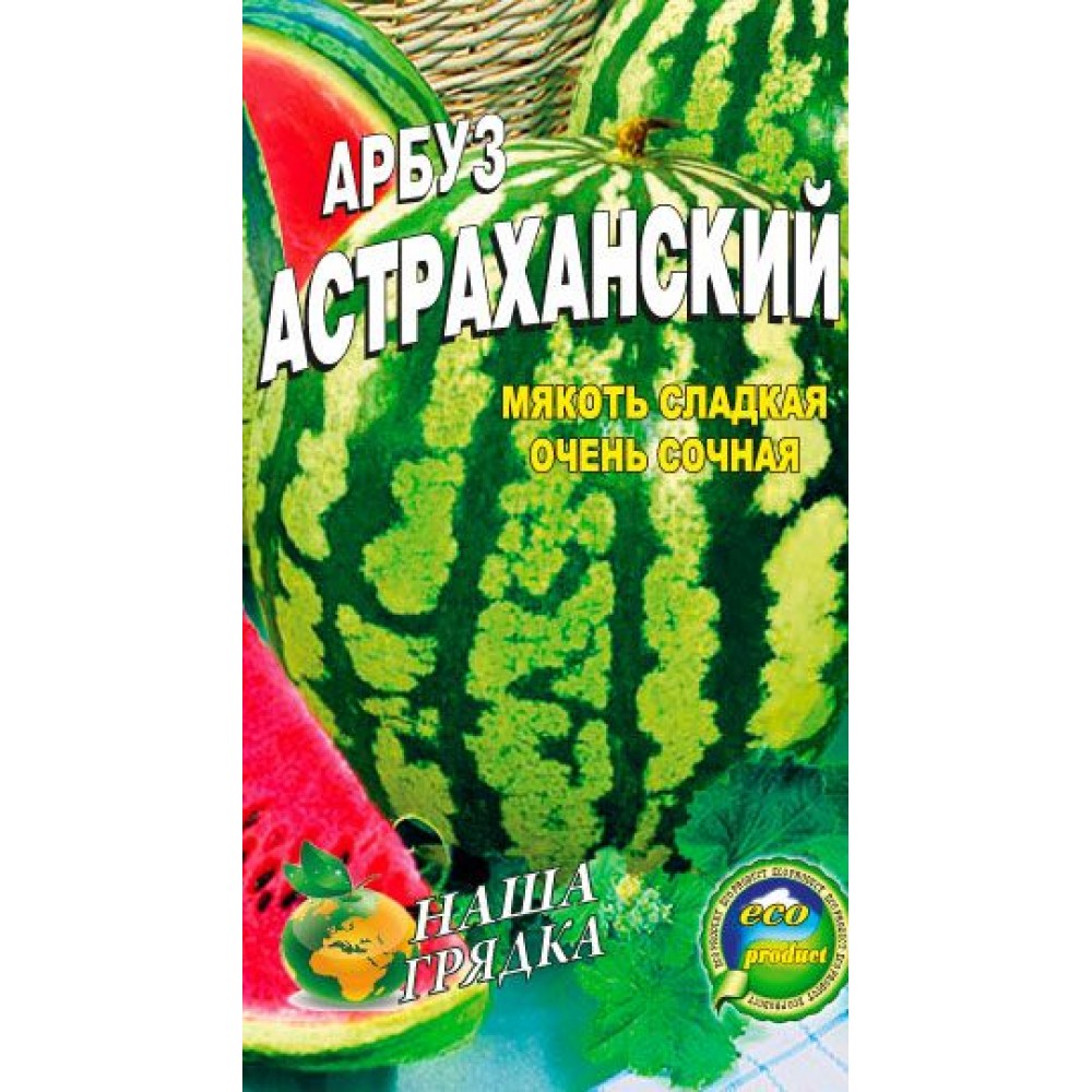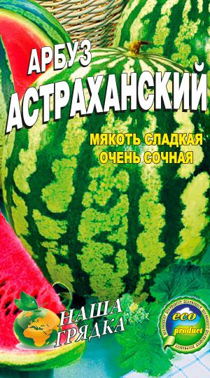 Арбуз Астраханский Среднеспелый сорт арбуза (85-100 дней.) Растение среднеплетистое, форма плода округлая или слегка продолговатой формы с гладкой поверхностью. Цвет зеленый, рисунок состоит из шипообразных полос темно-зеленого цвета. Мякоть яркого красного цвета, на вкус очень сладкая и сочная.Средняя масса арбуза: 8-10 кг.