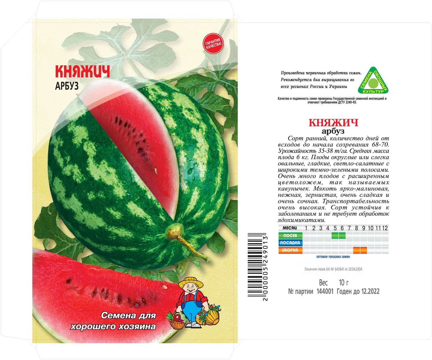 Сорт ранний, количество дней от всходов до начала созревания 68-70. Урожайность 35-38 т/га.Средняя масса плода 6 кг. Плоды округлые или слегка овальные, гладкие, светло-салатные с темно-зелеными полосами. Очень много плодов с расширенным цветоложем, так называемых кавунычек. Мякоть ярко-малиновая, нежная, зернистая,очень сладкая и очень сочная. Транспортабельность очень высокая. Сорт устойчив к заболеваниям и не требует обработок ядохимикатами.