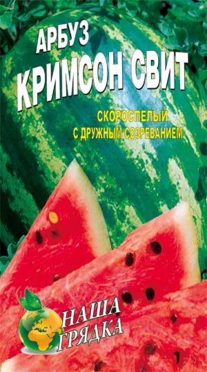 Арбуз Кримсон свит Раннеспелый сорт арбуза,время созревания с момента всхода: 70-81 день. Плод округлый или слегка продолговатой формы с гладкой поверхностью. Цвет зеленый, рисунок состоит из шипообразных полос темно-зеленого цвета. Мякоть яркого красного цвета, на вкус очень сладкая и сочная. Средняя масса арбуза: 8-10 кг. Семена арбуза ТМ Наша Грядка реализуются оптом и в розницу