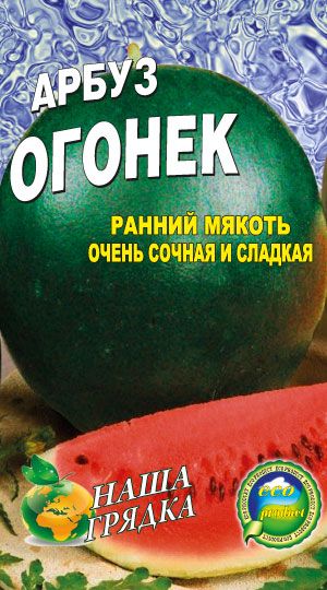 Арбуз Огонек Ранний сорт арбуза 71-87 дней Плод идеально шарообразной формы Цвет черно-зеленый, без видимых рисунков. Корка тонкая Мякоть нежная, красного цвета Средняя масса арбуза: 2 кг. Сорт арбуза Огонек устовчив к болезням. Семена арбузов прошли предпосевную обработку.