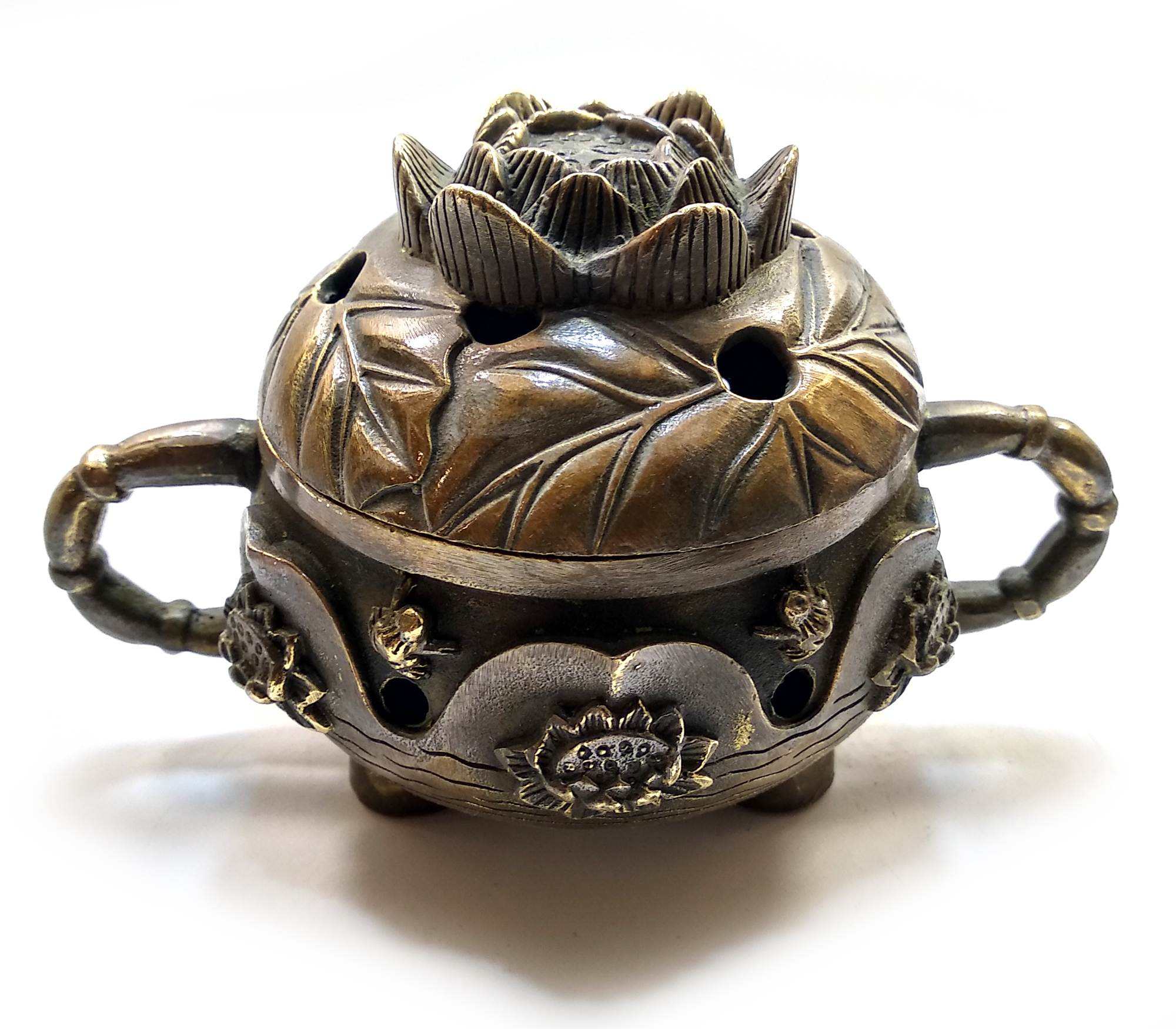 Изящная бронзовая аромакурительница в форме лотоса — стильный и функциональный аксессуар для любителей ароматерапии. Лотос символизирует чистоту, гармонию и духовное развитие, а металлическое исполнение придаёт изделию элегантный антикварный вид.