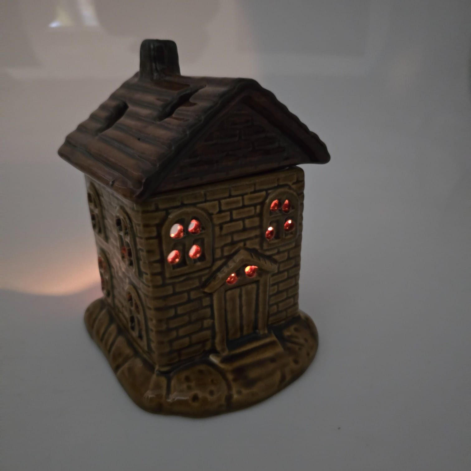 Эстетическая аромалампа в виде миниатюрного домика с коричневой глазурью. Съёмная крыша открывает чашу для эфирного масла; внутри размещается свеча-таблетка. Тёплый свет через «окна» создаёт уютную атмосферу, поэтому лампа уместна как мягкий ночник и как декор. Подойдёт для дома, кофейни или массажного кабинета.