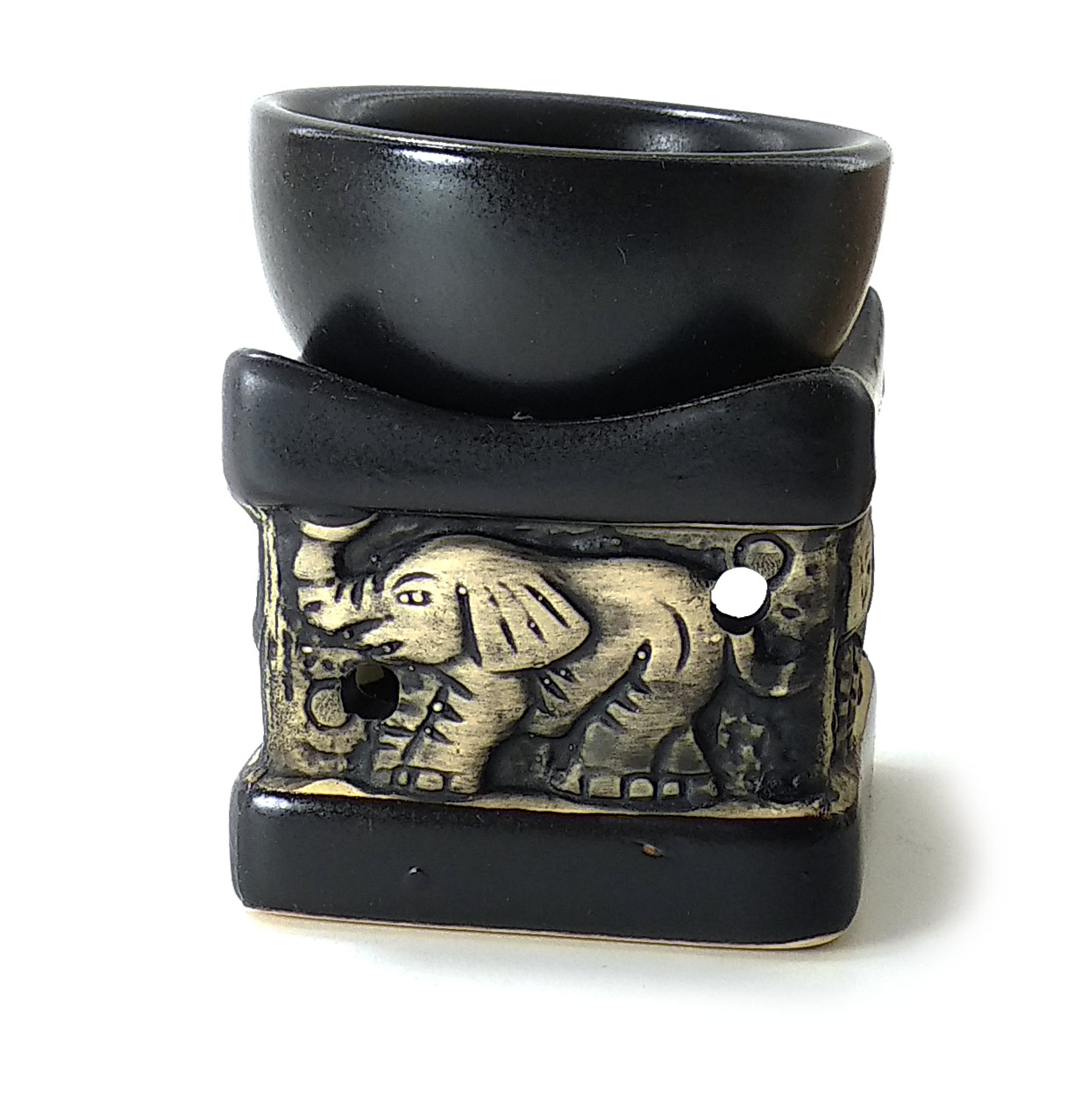 Аромалампа выполнена в форме куба и украшена изображениями слонов. Черно-белая цветовая гамма придает ей современный и эстетичный вид, который прекрасно впишется в любой интерьер.