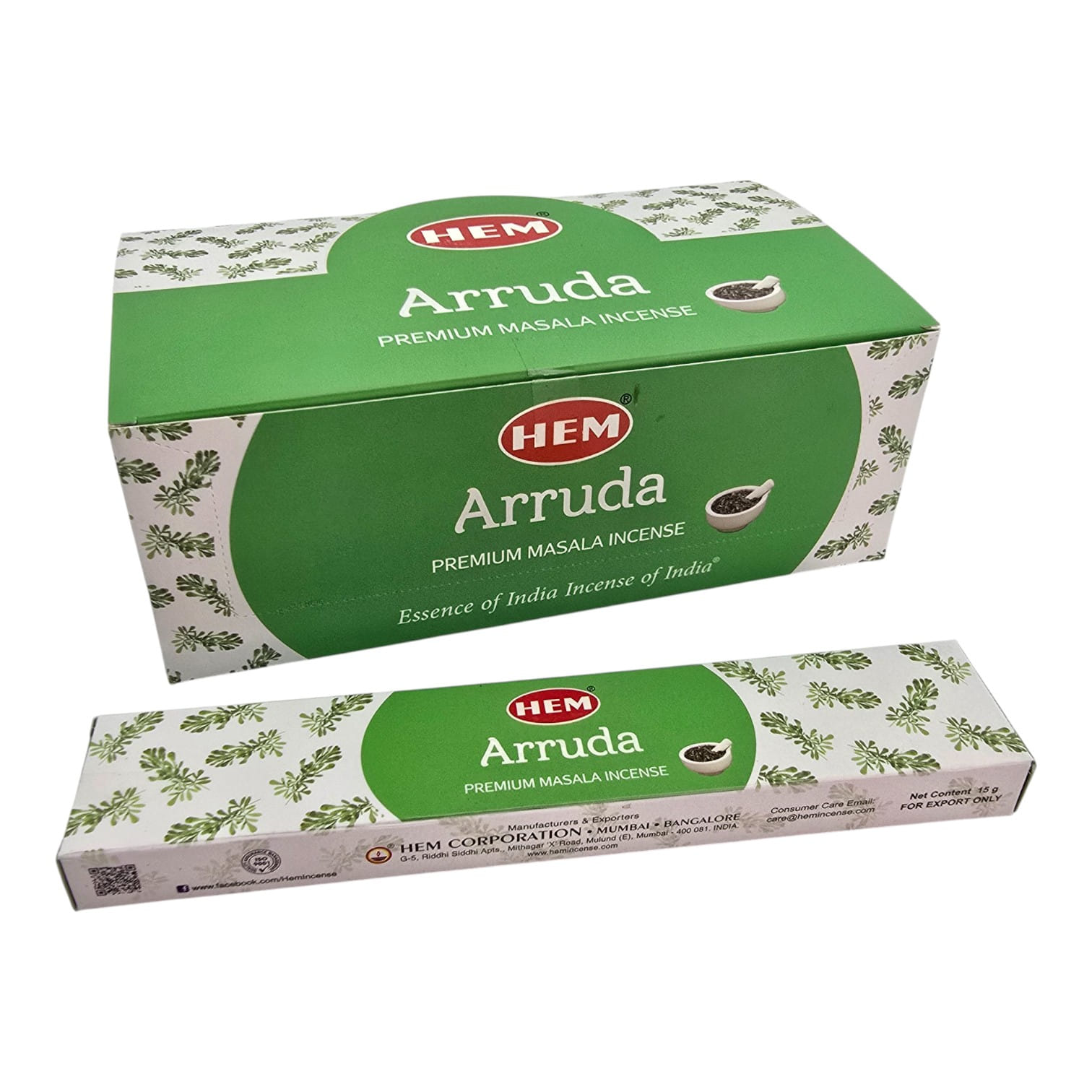 Ароматические палочки с травяным ароматом руты от индийского производителя HEM Corporation Pvt. Ltd. Изготовлены по масала-технологии ручной скрутки, дают мягкий дым с зелёными, свежими нотами. Подходят для дома, медитаций, йоги и энергетической очистки пространства от посторонних запахов.
