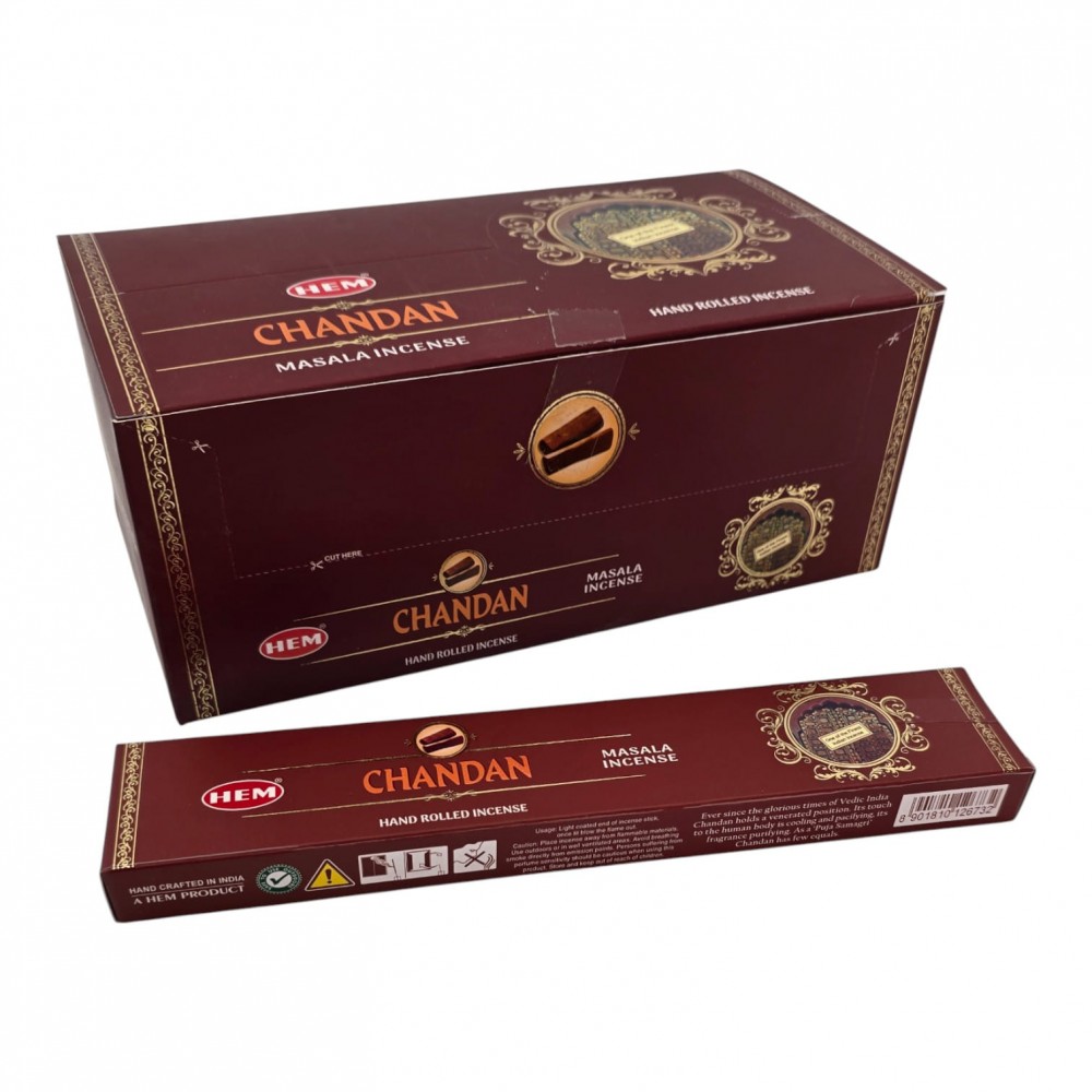 HEM Chandan - классические индийские благовония с тёплым древесным ароматом сандала. Палочки скручены вручную по технологии масала: натуральные растительные порошки, смолы и эфирные масла нанесены на бамбуковую основу. Подходят для дома и офиса, медитаций, практик йоги, релакса и создания уютной атмосферы.