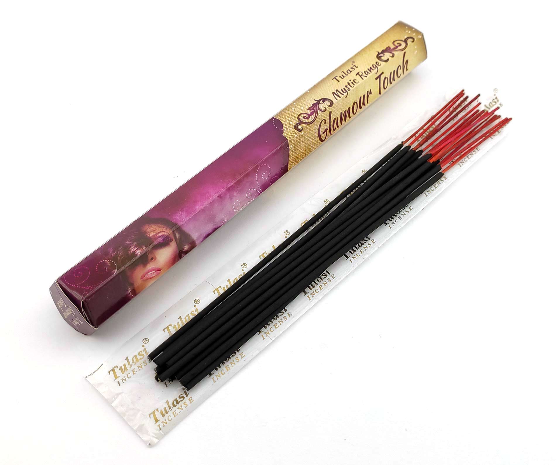 Ароматические палочки Glamour Touch (Гламурное прикосновение) изготовителя Tulasi Индия. В одной пачке (шестиграннике) 20 аромапалочек.