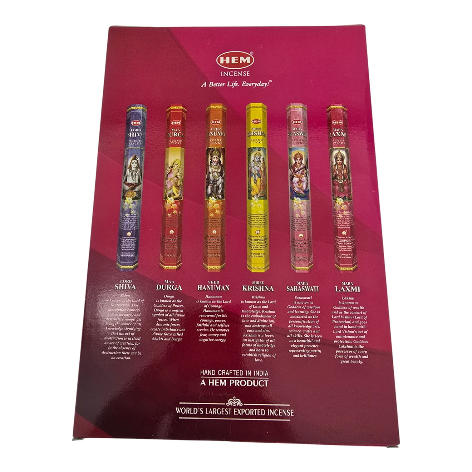 HEM Corporation, Индия, один из самых известных производителей индийских благовоний ручной скрутки. Набор God Series создан как готовый подарок и для повседневной ароматизации пространства. Внутри 6 тематических ароматов, посвящённых индуистским божествам: Шива, Дурга, Хануман, Кришна, Сарасвати, Лакшми. Формат HEX по 20 палочек в каждой упаковке. Подходит для медитации и йоги, создания уюта дома, ритуальных практик и в качестве подарка.