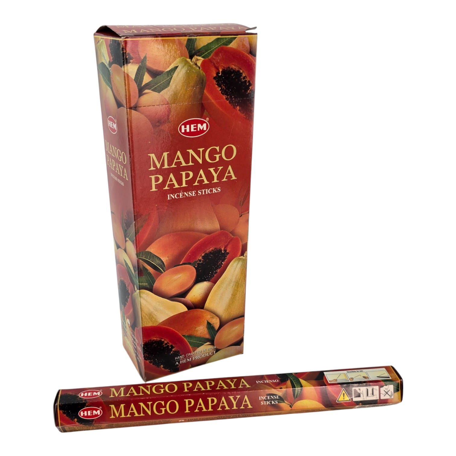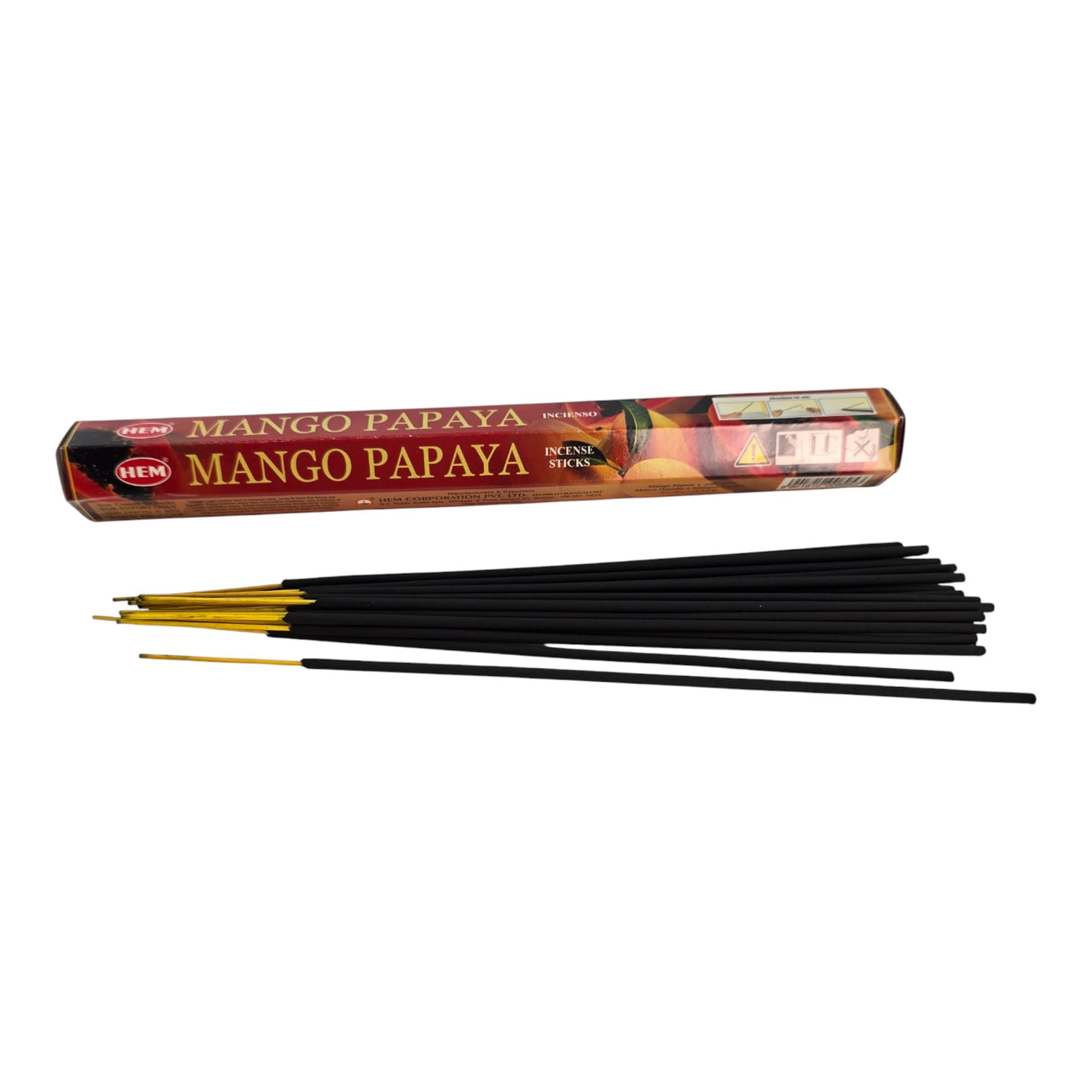 HEM Mango Papaya — индийские ароматические палочки с сочным тропическим ароматом манго и папайи. Создают уют дома и в офисе, помогают для медитации и отдыха, нейтрализуют посторонние запахи. Используйте с держателем для палочек.