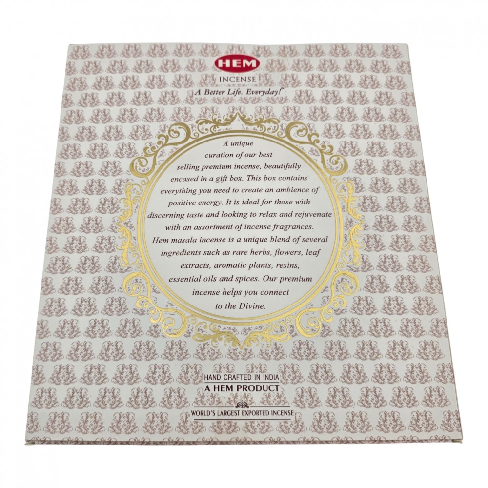 Подарочный набор индийских масала-благовоний от HEM для дома, релакса и медитации. В комплекте пять коробок аромапалочек по 15 г каждая и мини-подставка. Благовония скручены вручную из растительных компонентов и эфирных масел. Подожгите кончик палочки, дайте огню разгореться 5–10 секунд, задуйте и установите в подставку. Используйте в хорошо проветриваемом помещении, держите вдали от детей и животных.