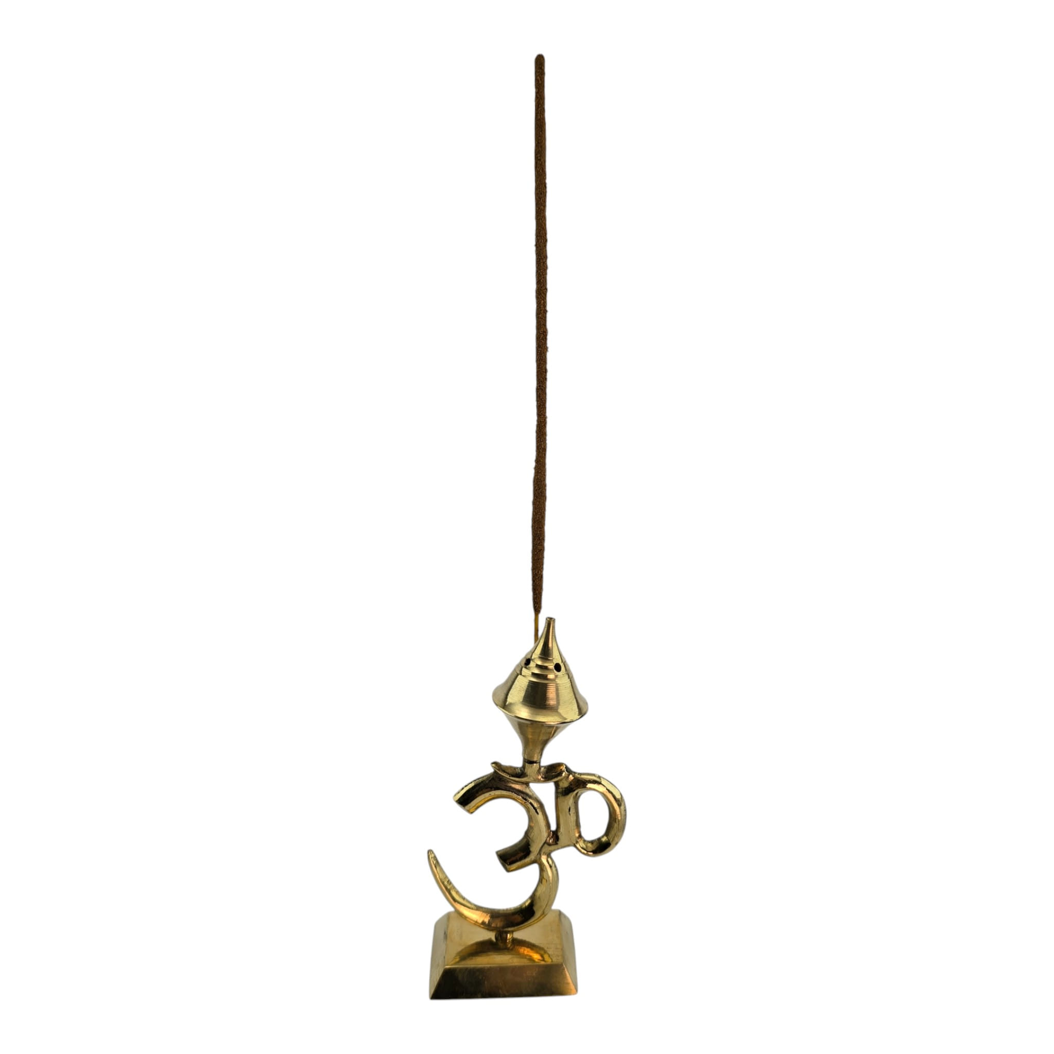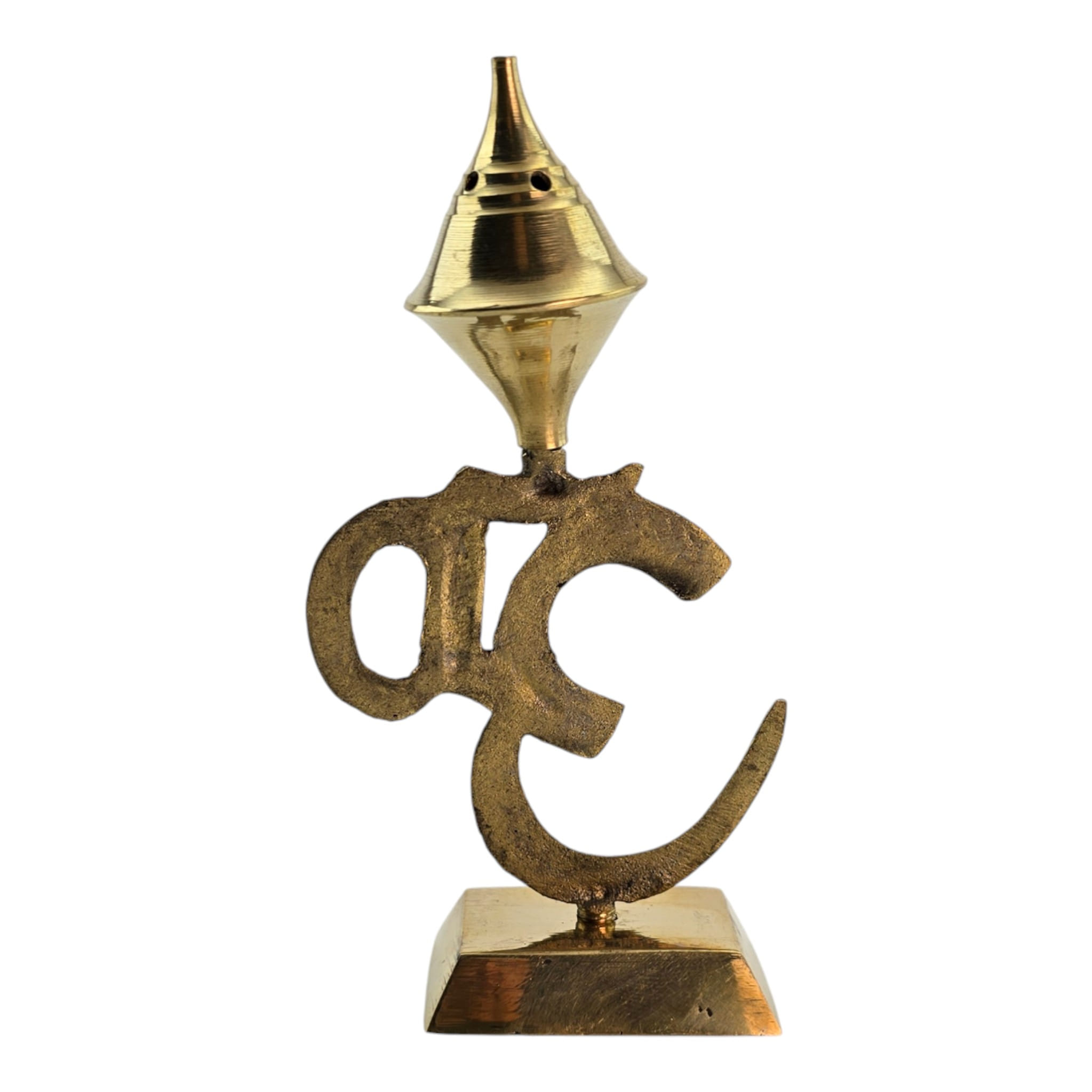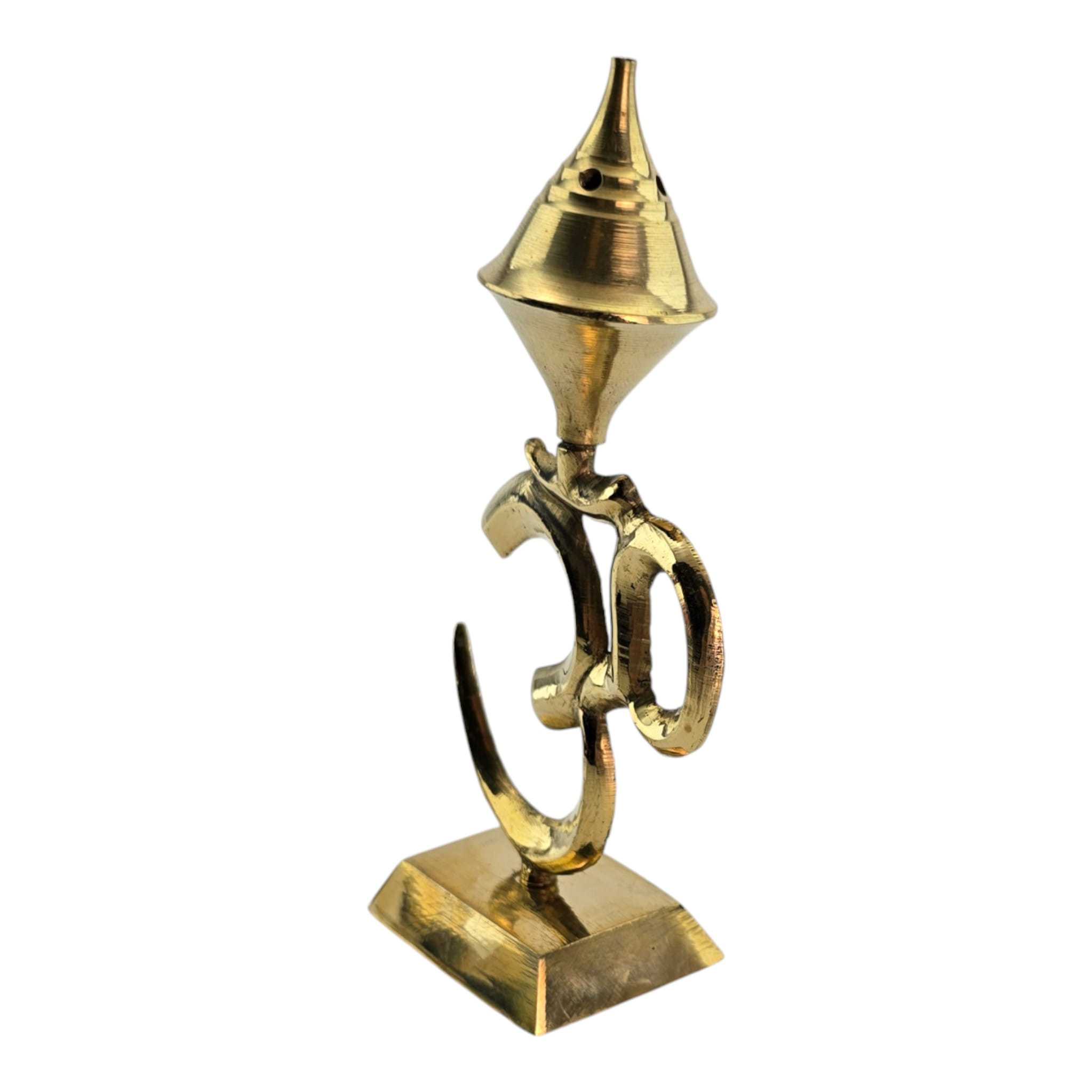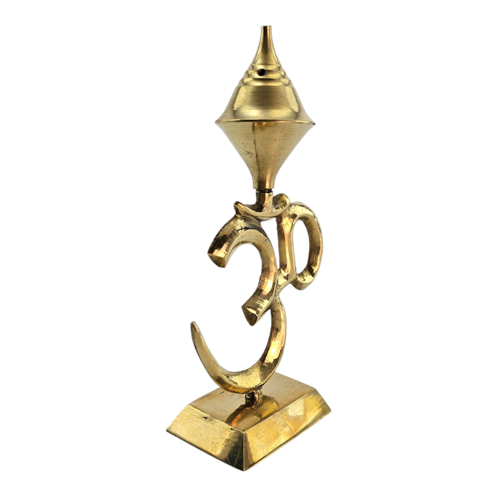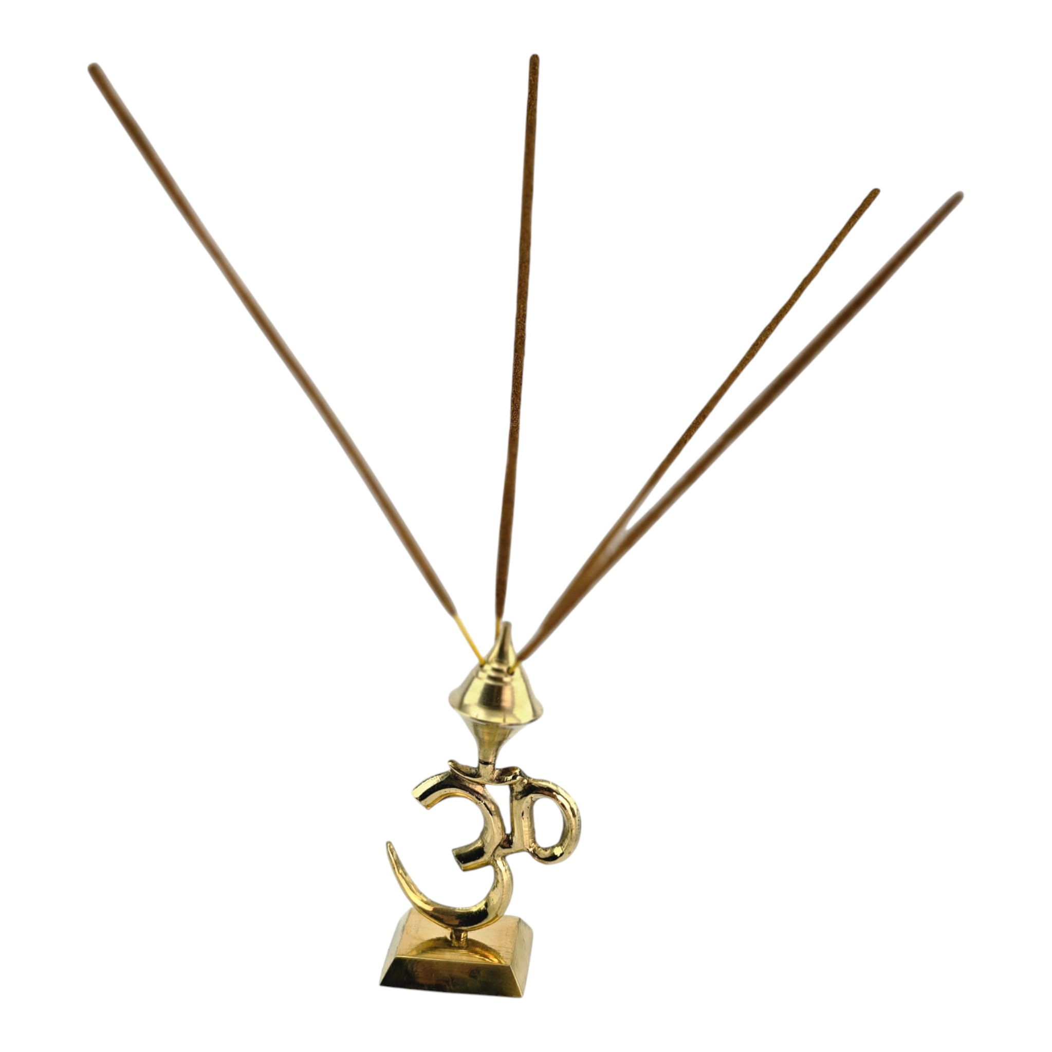 Настольная подставка для ароматических палочек в форме священного символа Ом. Произведена в Индии из латуни в золотистом цвете. Верхний конус-купол с отверстиями позволяет установить до 4 палочек одновременно. Устойчивая база удобна для домашнего алтаря, медитаций, практик йоги или как акцентный декор. Используйте на негорючей поверхности и не оставляйте без присмотра. Из-за ручного литья и полировки возможны небольшие отличия от фото.