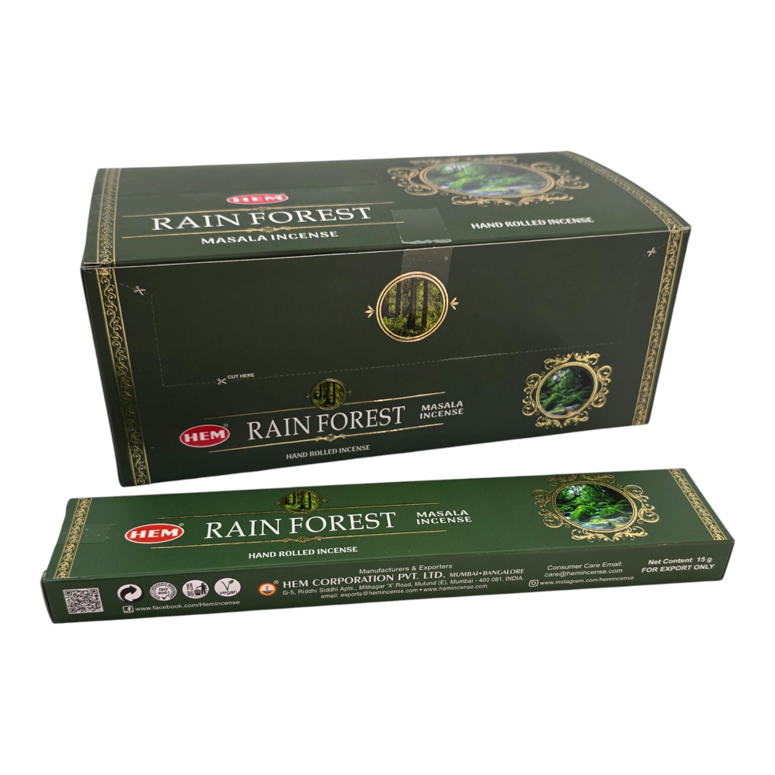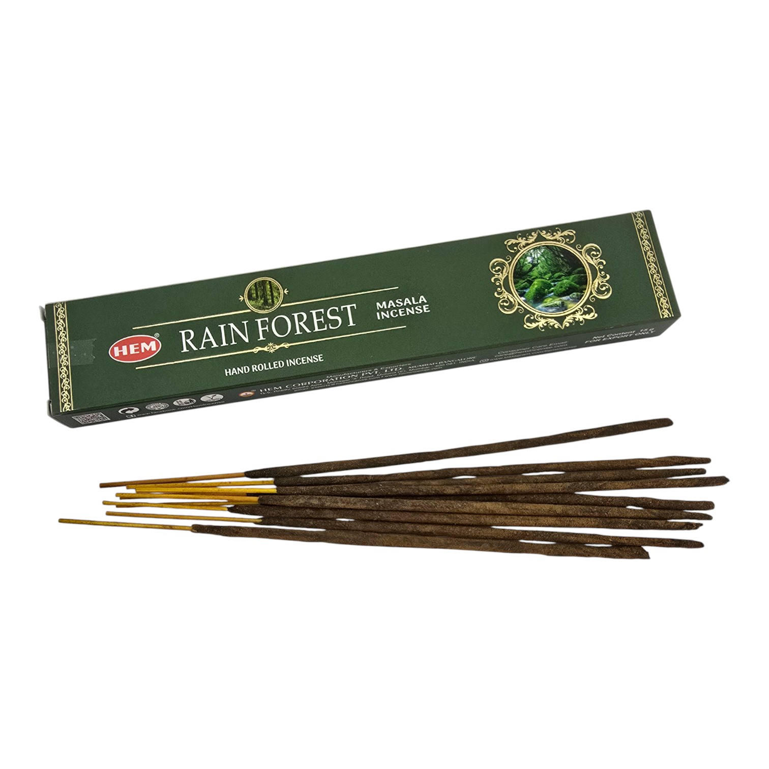HEM Rain Forest - индийские масала-благовония со свежим зеленым ароматом тропического леса: влажная древесина, листья, мох и капли дождя. Создают спокойную атмосферу, помогают расслабиться и сосредоточиться во время медитации и йоги, быстро устраняют посторонние запахи дома и в офисе. Производитель HEM Corporation Pvt. Ltd. из Мумбаи и Бангалора - один из лидеров мирового экспорта благовоний, специализируется на традиционных ручных масала-палочках из растительных порошков, смол и эфирных масел.