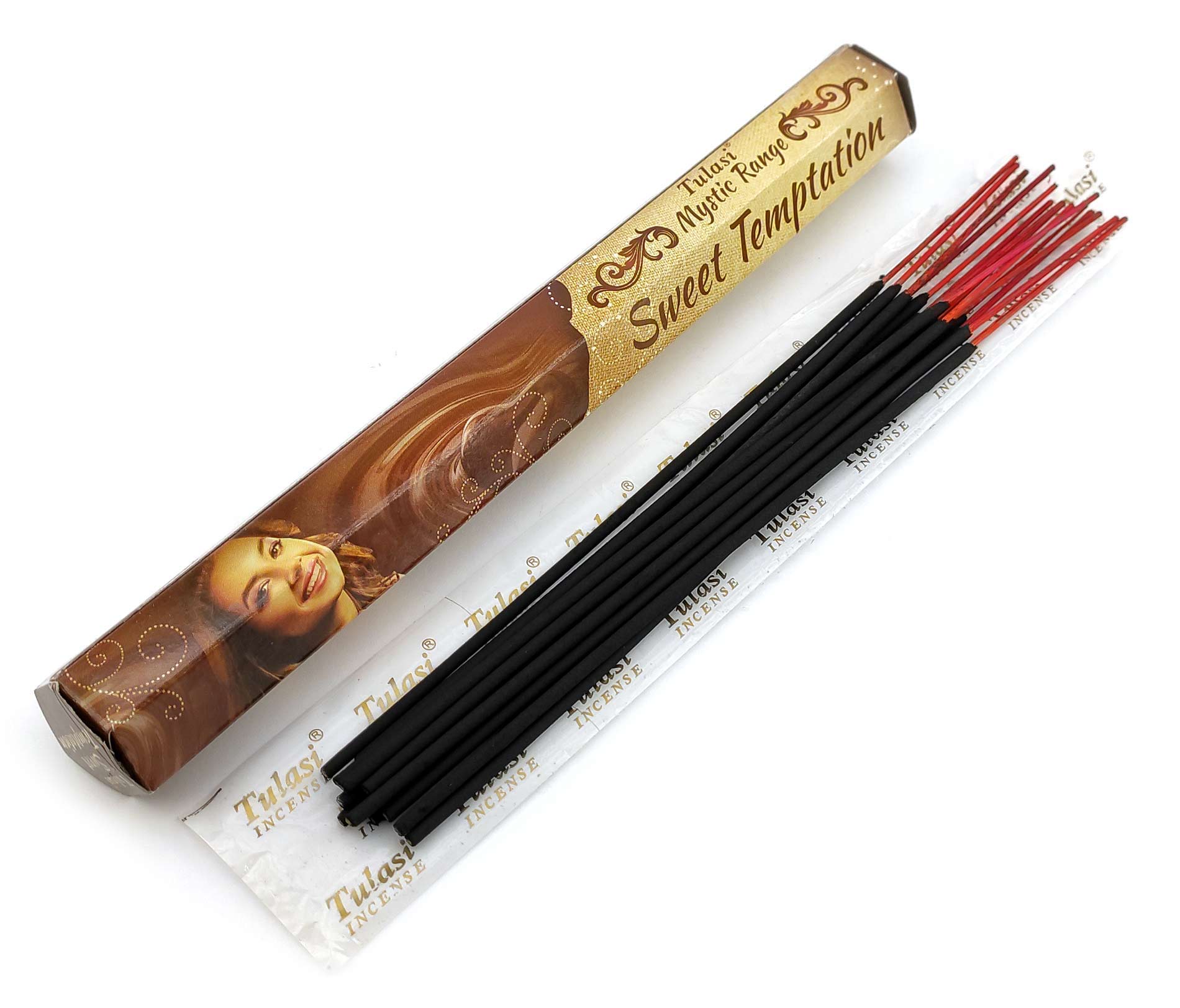 Ароматические палочки Sweet Temptation (Искушение) изготовителя Tulasi Индия. В одной пачке (шестиграннике) 20 аромапалочек.