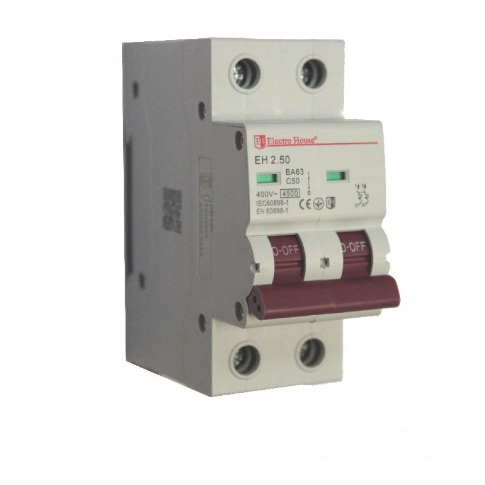 Автоматический выключатель 2 полюса 50 A EH-2.50 - выполняет моментальный разрыв цепи питания при ситуациях короткого замыкания, перенапряжения общей работы электросети, контакте человека с неизолированным проводом, пробое или же поврежденной изоляции проводника. Приемлемое напряжение при работе составляет от 230 до 400 В. Корпус произведен из прочного материала в основу которого взял качественный огнестойкий пластик белого цвета. Имеет компактный размер. Данный прибор классифицируется на однофазные и двухфазные, разница между которыми состоит в количестве подключаемых проводов. Обеспечит достойную защиту и полную пожаробезопасность в Вашем доме, квартире или любом другом помещении. Отменно служит на протяжении долгих лет.