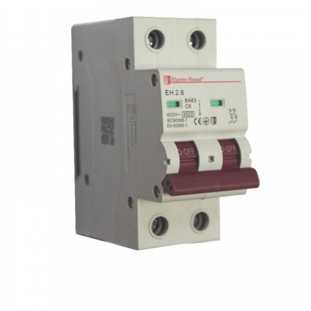 Автоматический выключатель 2 полюса 6 A EH-2.6 ТМ Electro House - это механическое коммутационное устройство, с помощью которого можно вручную добиться обесточивания всей электросети или конкретного ее участка. Данный прибор автоматически отключает электрическую сеть при возникновении аварийных ситуаций: короткое замыкание, перегрузки. Автомат может быть также вручную отключен, если в этом есть необходимость, например на время проведения ремонтных работ. Выполнен из огнестойкого корпуса и имеет 2 полюса, то есть может быть подключен одновременно к двум электросетям. Такой аппарат рекомендуется к использованию в любых типах помещений, как производственных так и жилых. Компания ElectroHouse гарантирует качество и надежность сборки всей изготавливаемой продукции.