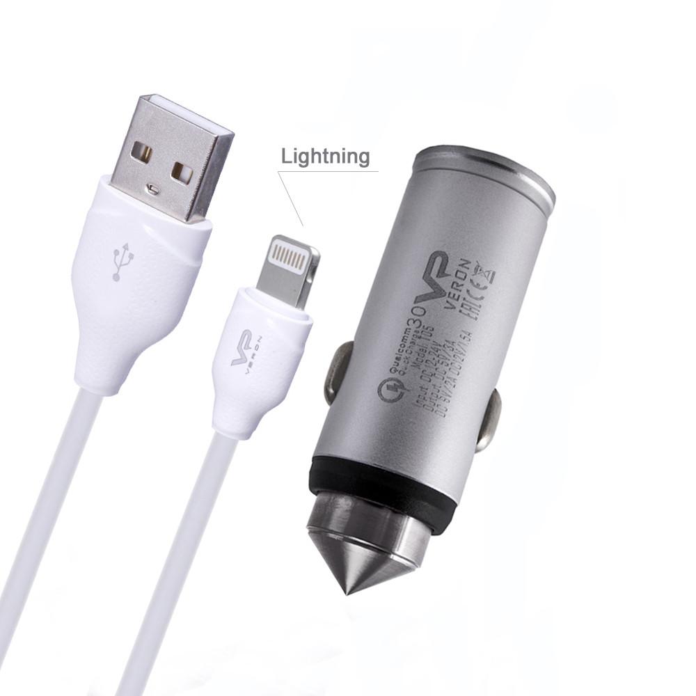 Veron T05/T05C/T05L/T05M QC3.0 Car Charger -3A – автомобильное зарядное устройство, которое станет незаменимым аксессуаром для любого автомобилиста. С ним зарядка смартфонов и планшетов и других гаджетов будет происходить просто и быстро. Материал: прочный и износостойкий, положительный / отрицательный эластичный элемент с гальваническим покрытием, Корпус выполнен из качественных материалов и имеет достаточно компактные размеры. Максимальный выход USB: 3А, с IC для интеллектуальной идентификации.Установленная Защита от перегрузки по току и перенапряжения для цепи, что поможет сберечь проводку автомобиля и защитит Ваше устройство от перегрева. В комплекте идет кабель Lightning.