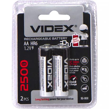 Акумулятори VIDEX АА 2500, на блістері 2 шт. Акумулятори нікель-метал-гібридні. Мінімальна робота 2500 mAh. 1,2 V