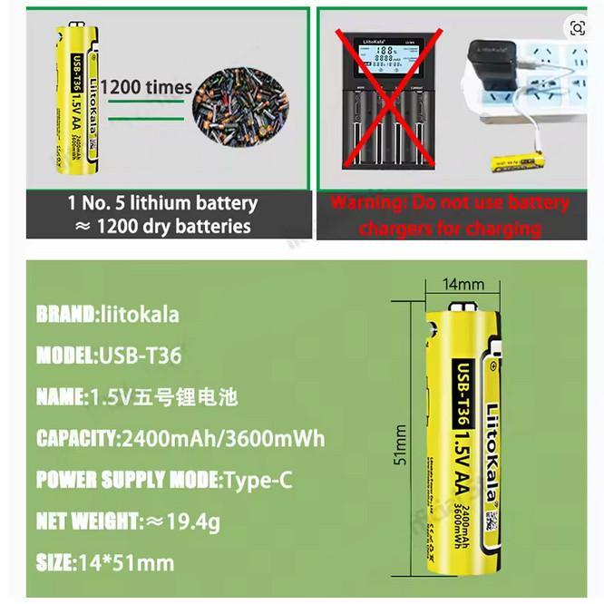 Аккумулятор AA, LiitoKala USB-T36 1.5V, 2400mAh, ОРИГИНАЛ